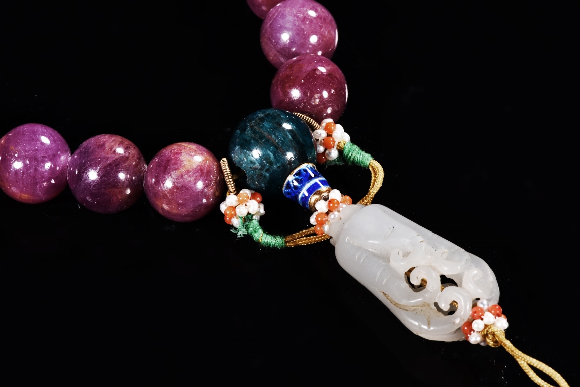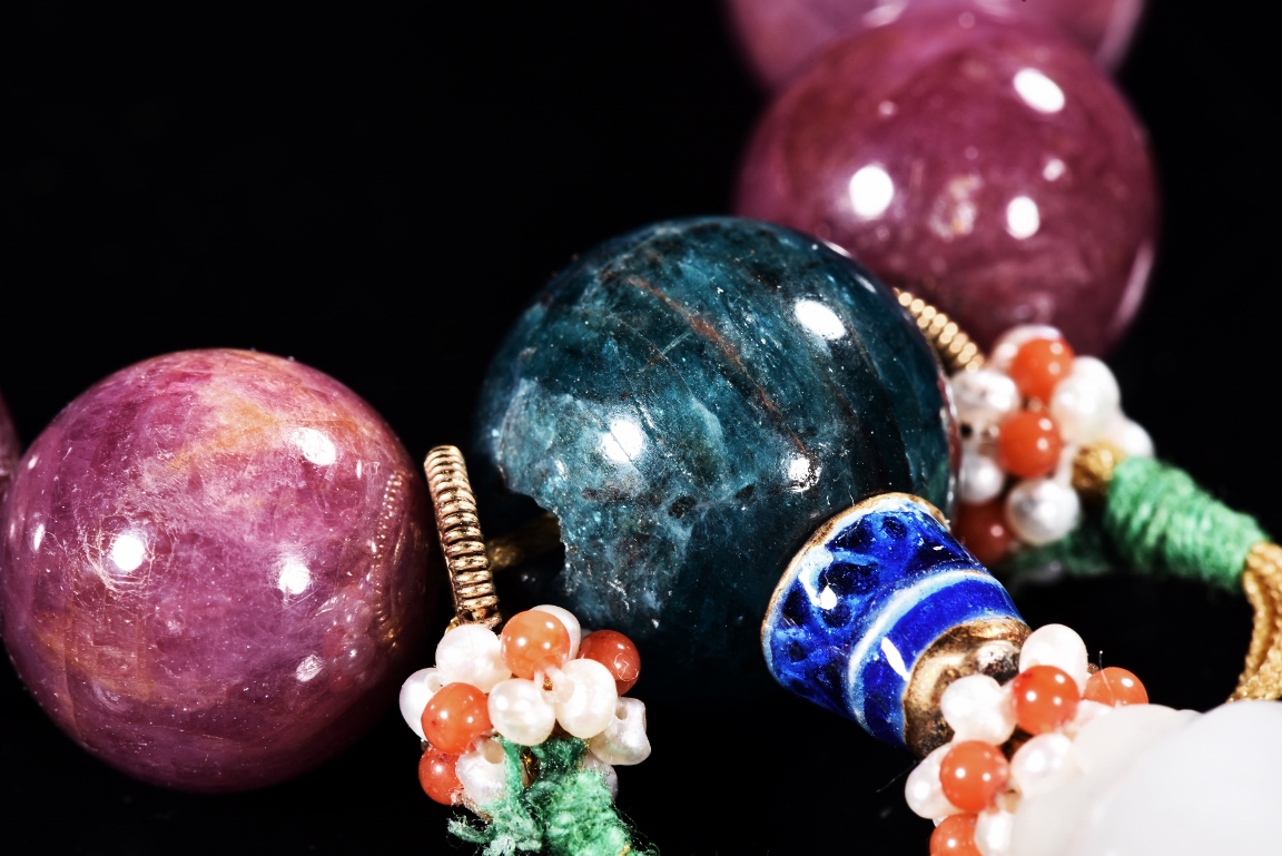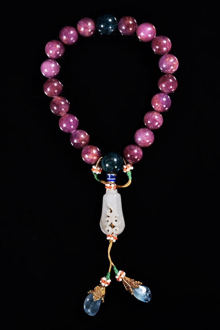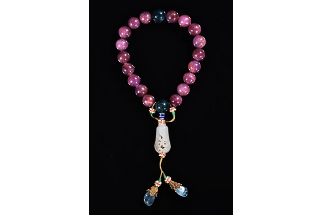 The bracelet comprises of eighteen ruby beads, white jade and aquamarine beads. Qing Dynasty period.