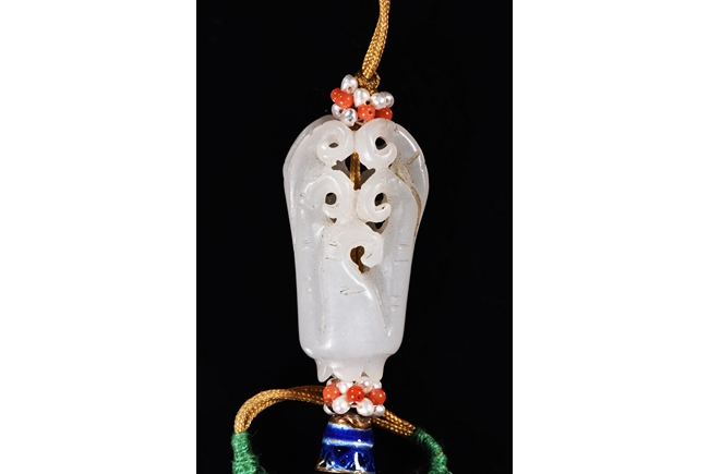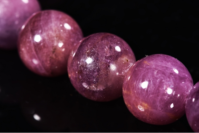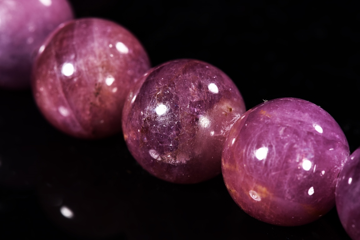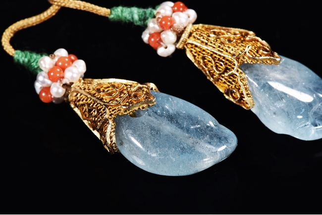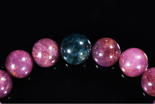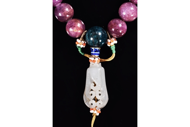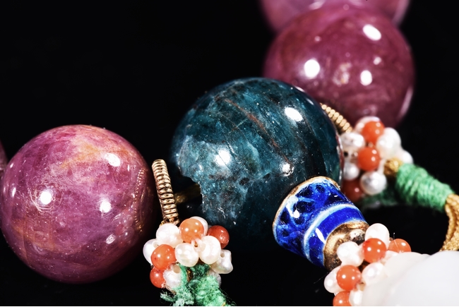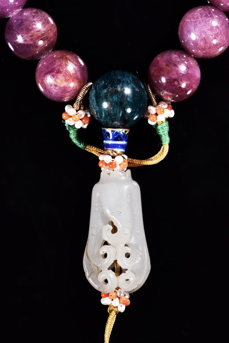 The bracelet comprises of eighteen ruby beads, white jade and aquamarine beads. Qing Dynasty period.