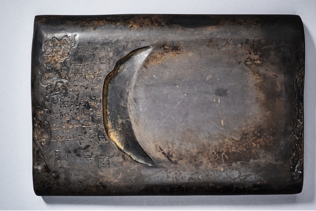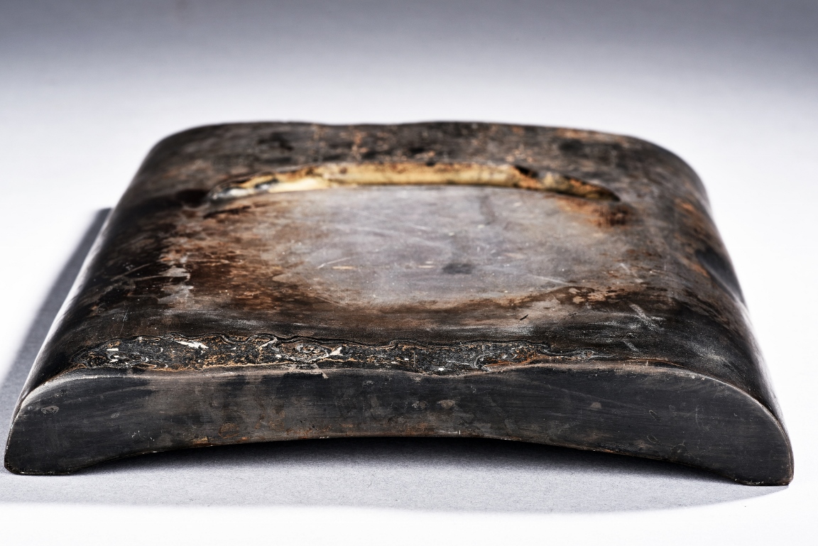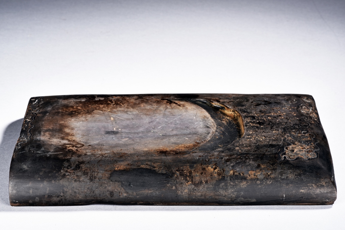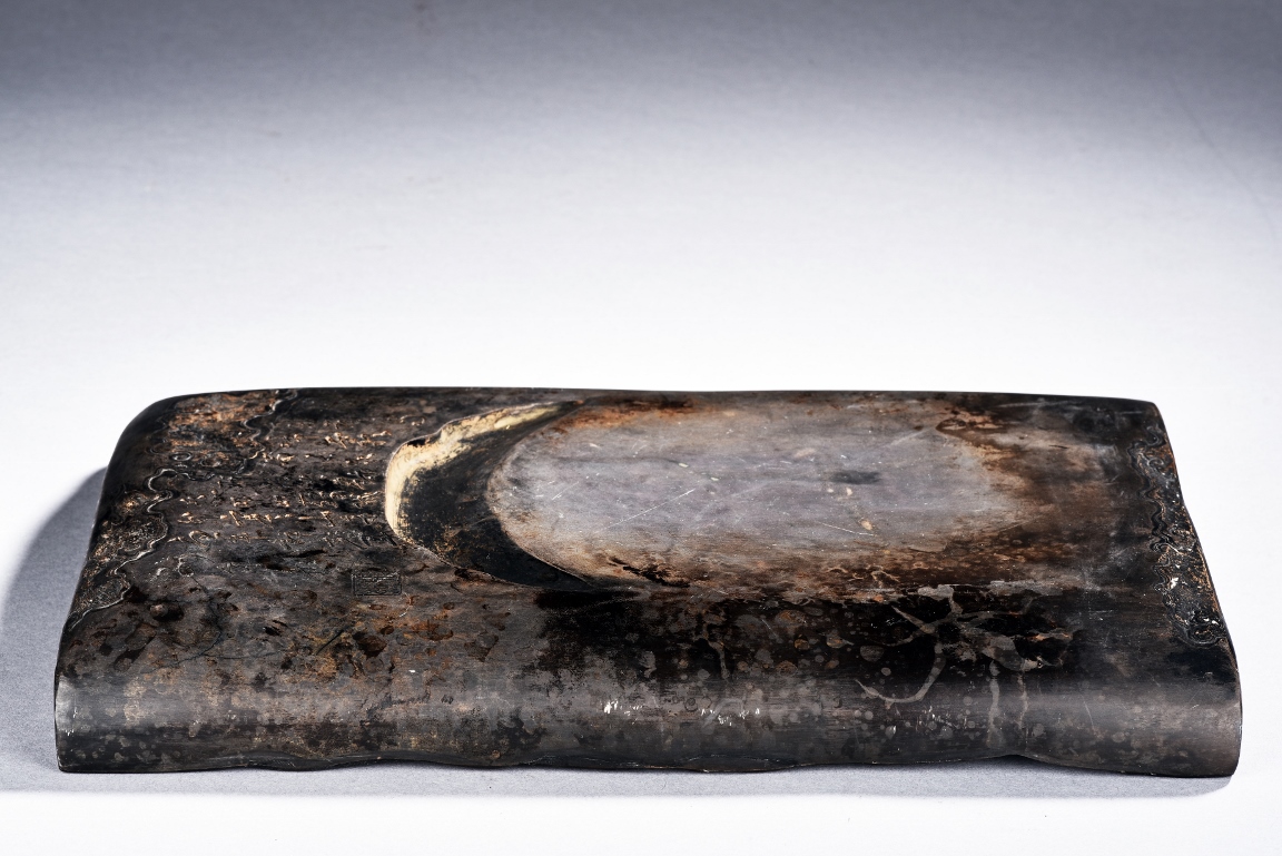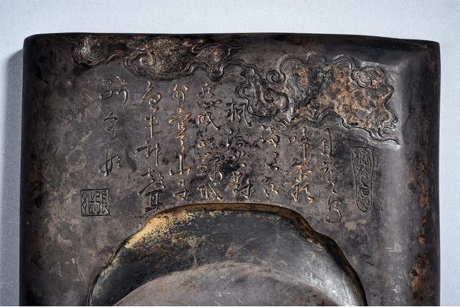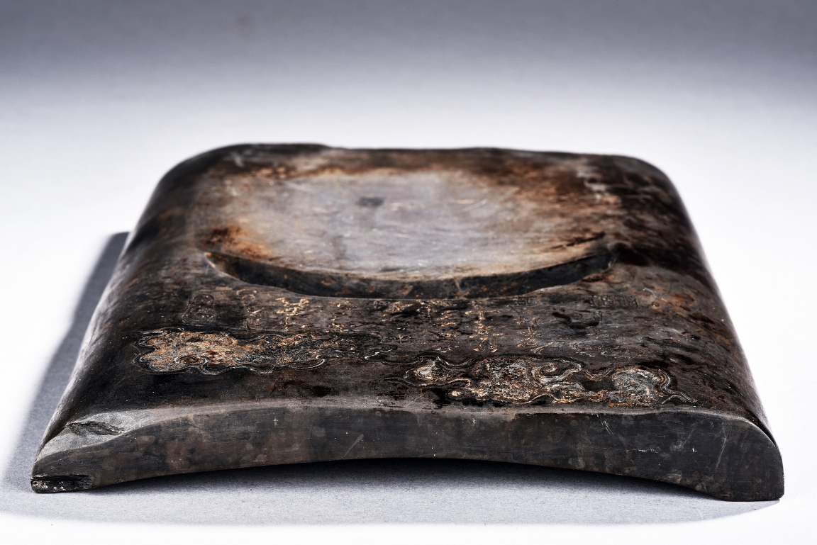The rectangular inkstone is carved with a smoothly polished grinding surface inclining into a troughed inkwell and incised with poem, mark, and auspicious clouds. Qing Dynasty period.