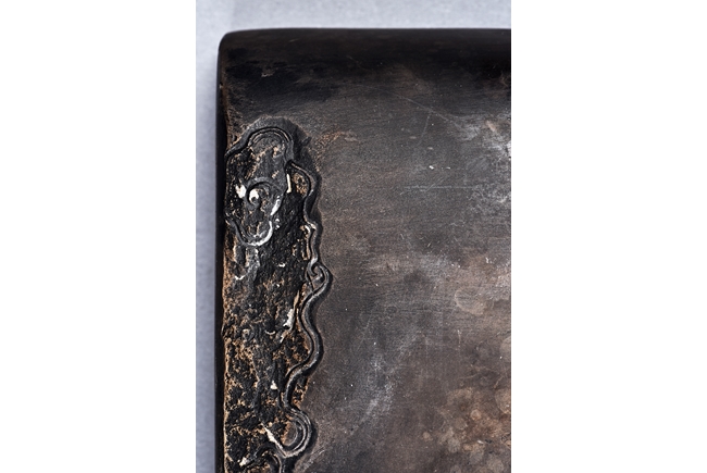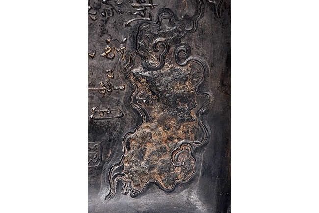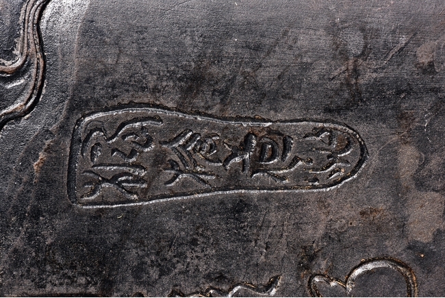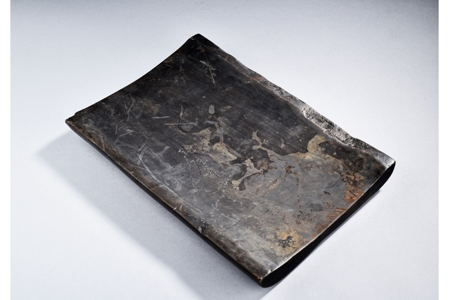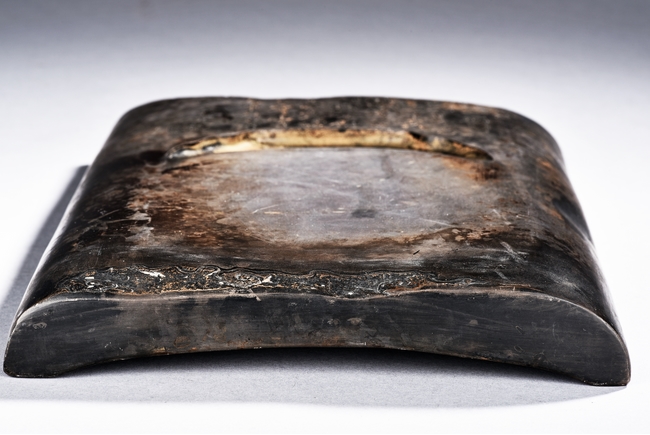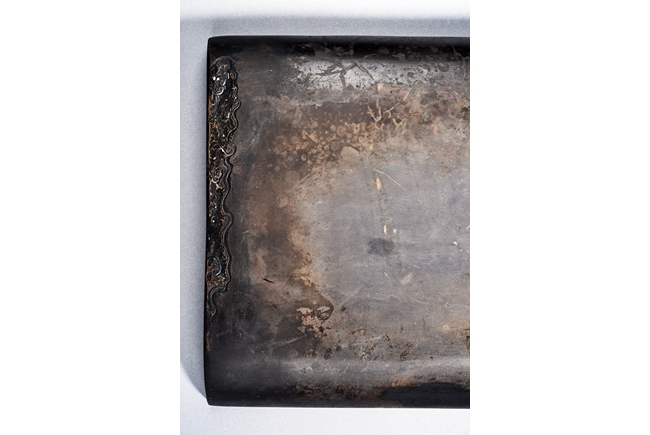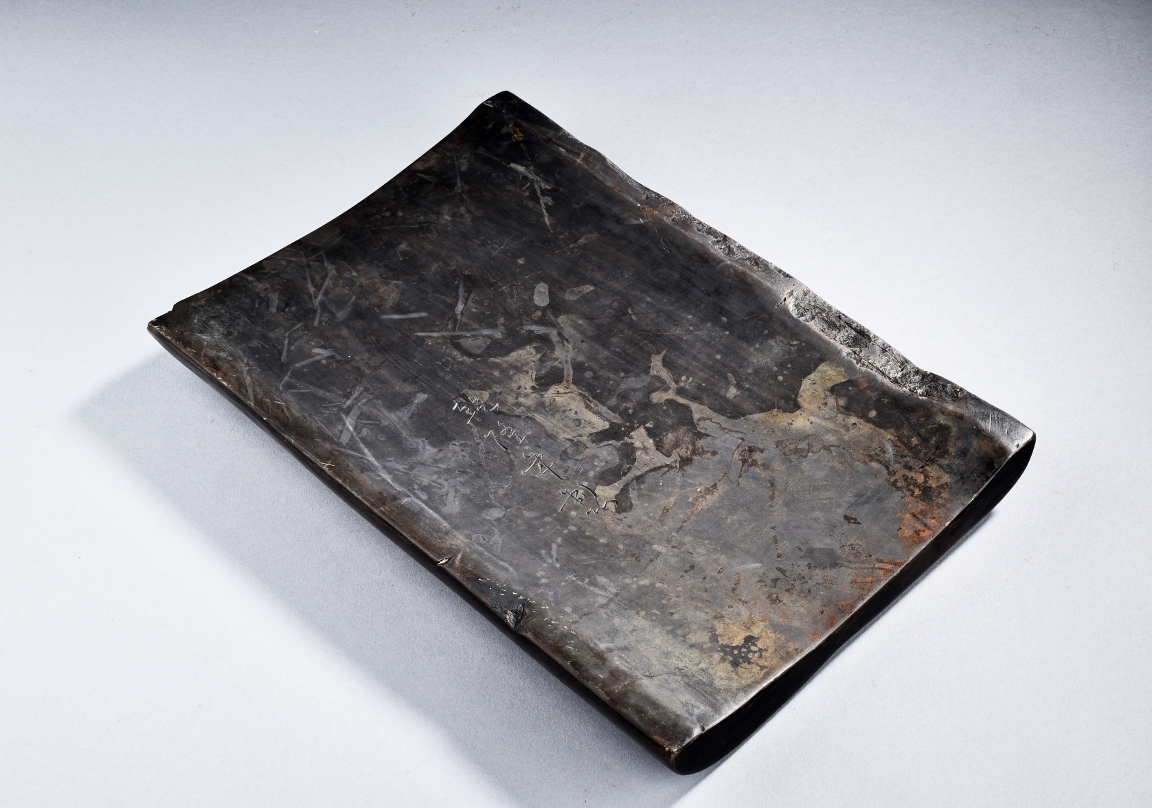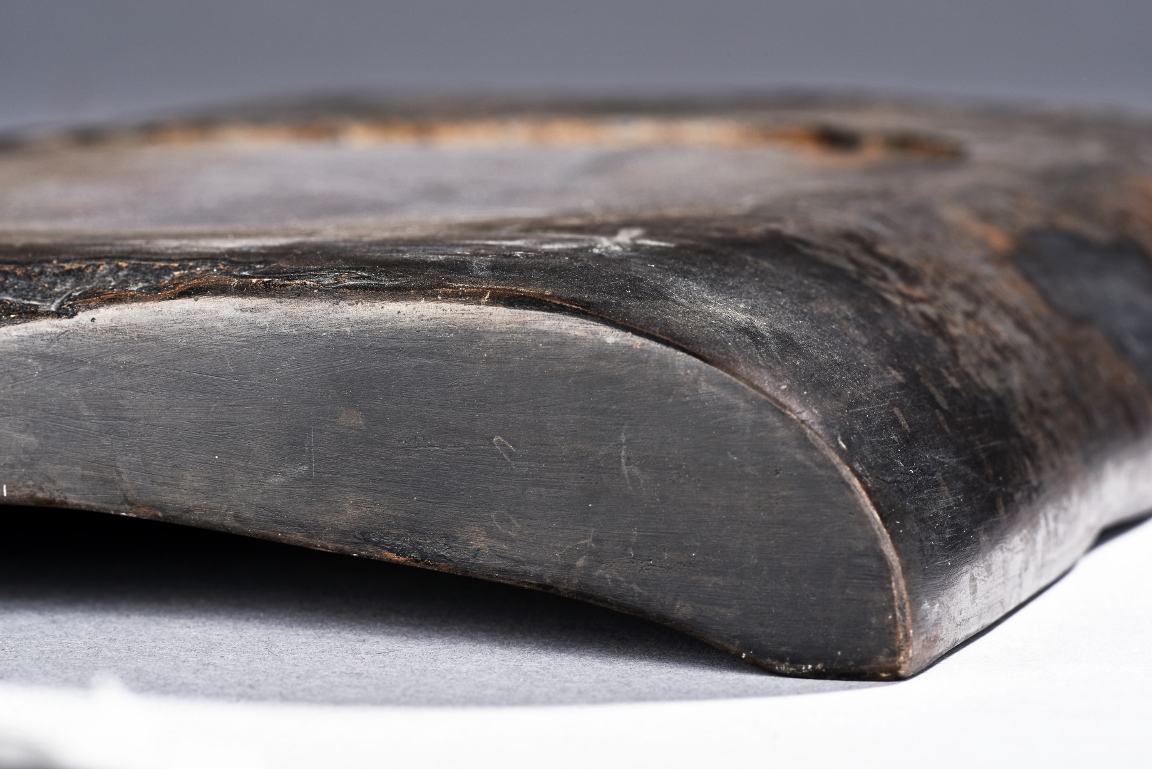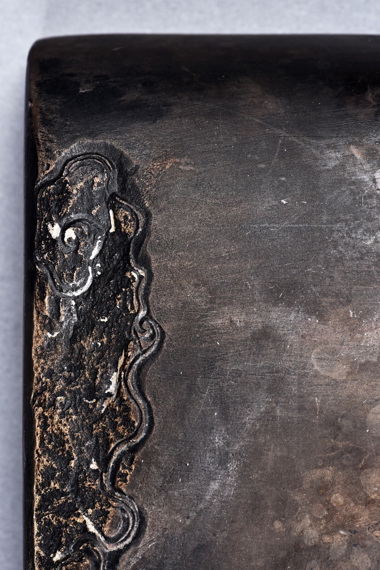 The rectangular inkstone is carved with a smoothly polished grinding surface inclining into a troughed inkwell and incised with poem, mark, and auspicious clouds. Qing Dynasty period.