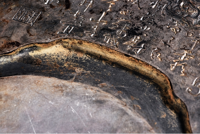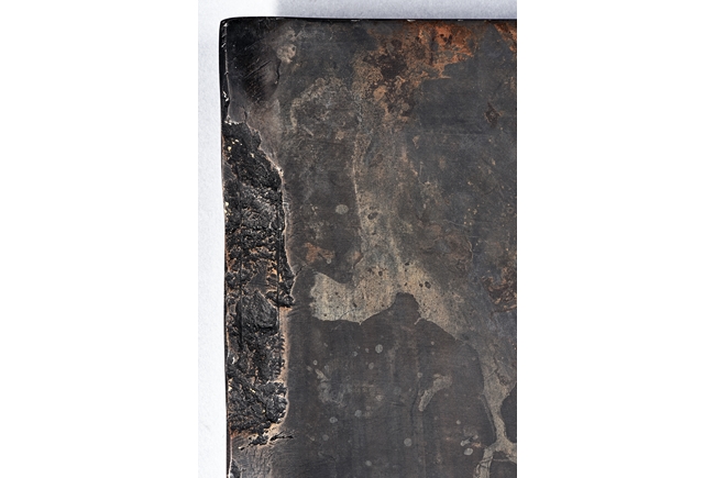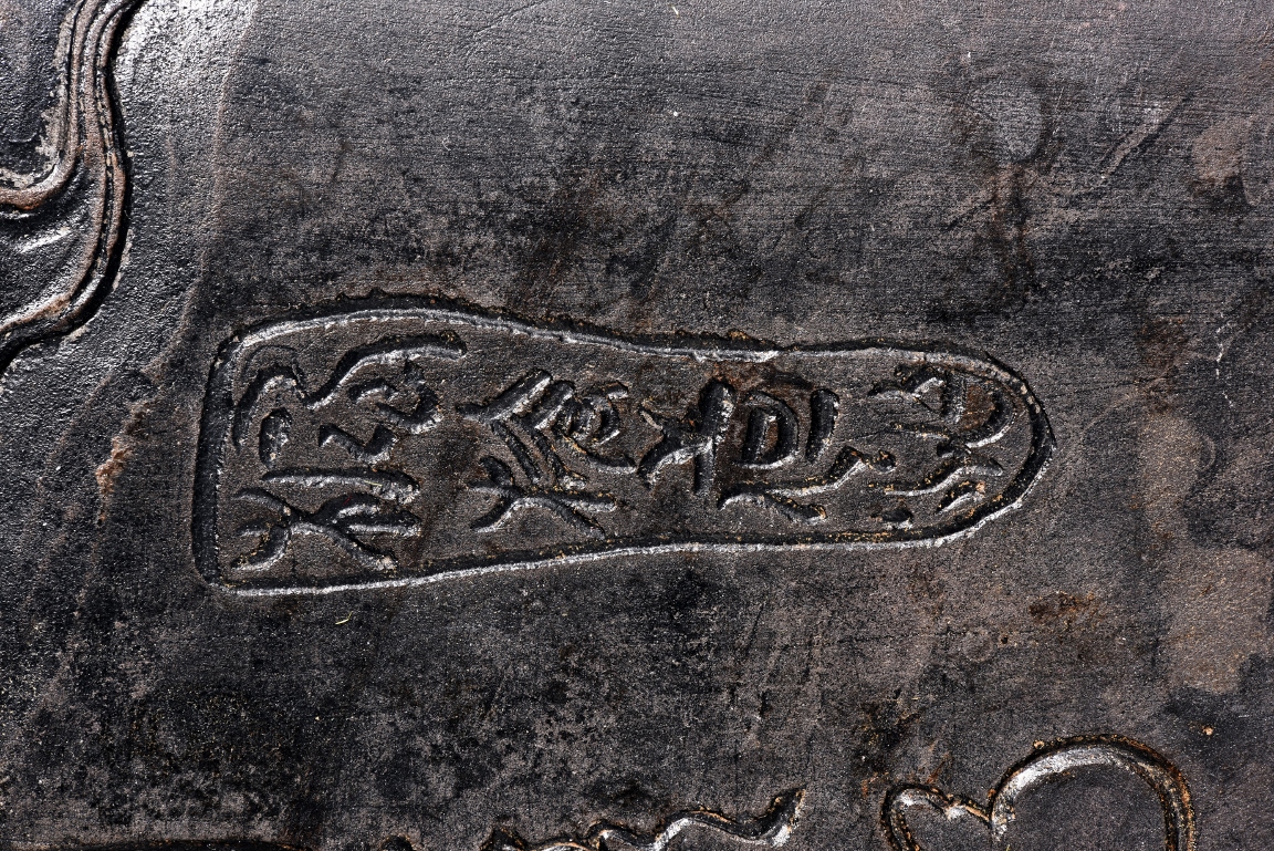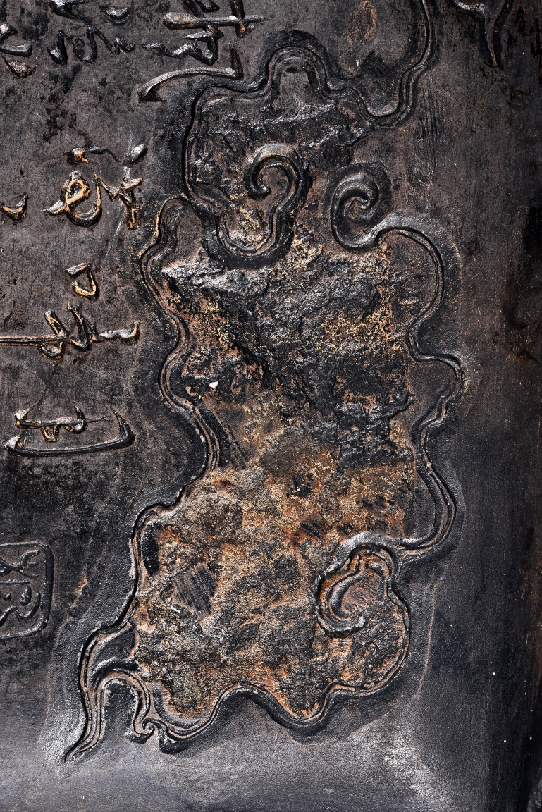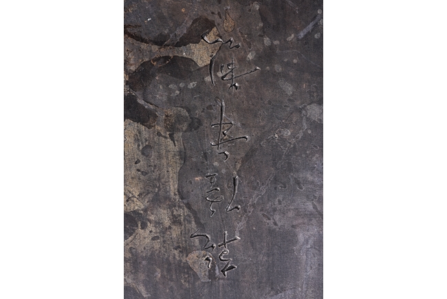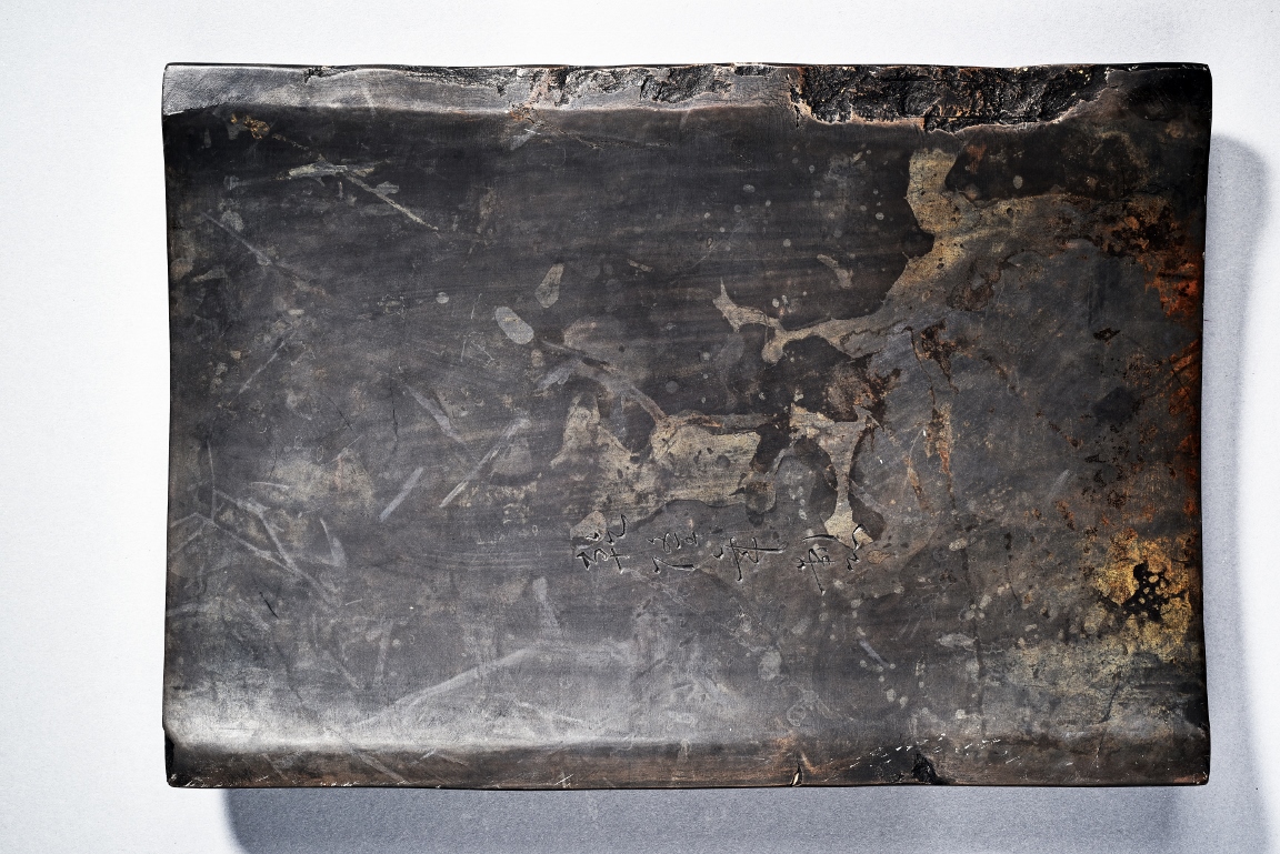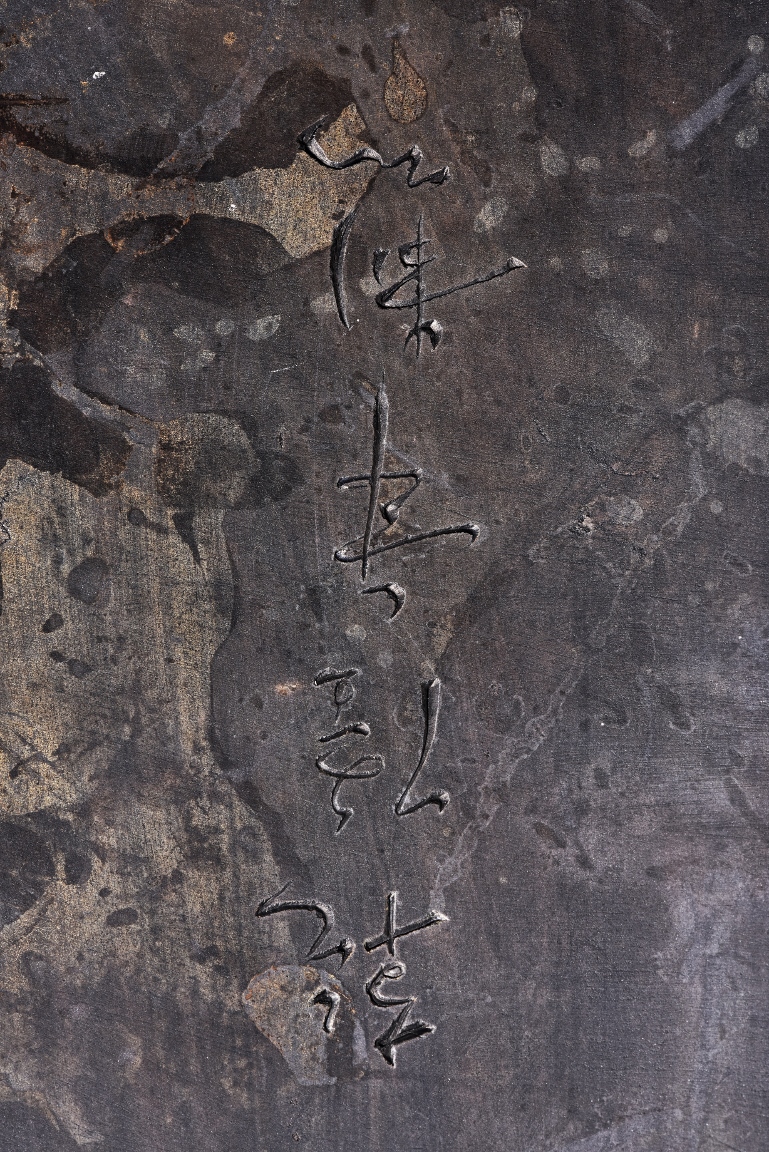 The rectangular inkstone is carved with a smoothly polished grinding surface inclining into a troughed inkwell and incised with poem, mark, and auspicious clouds. Qing Dynasty period.