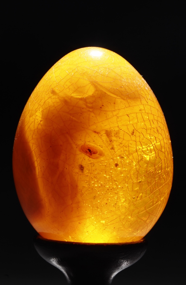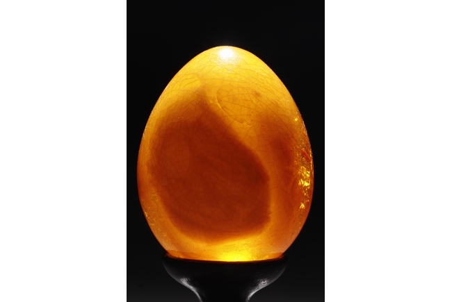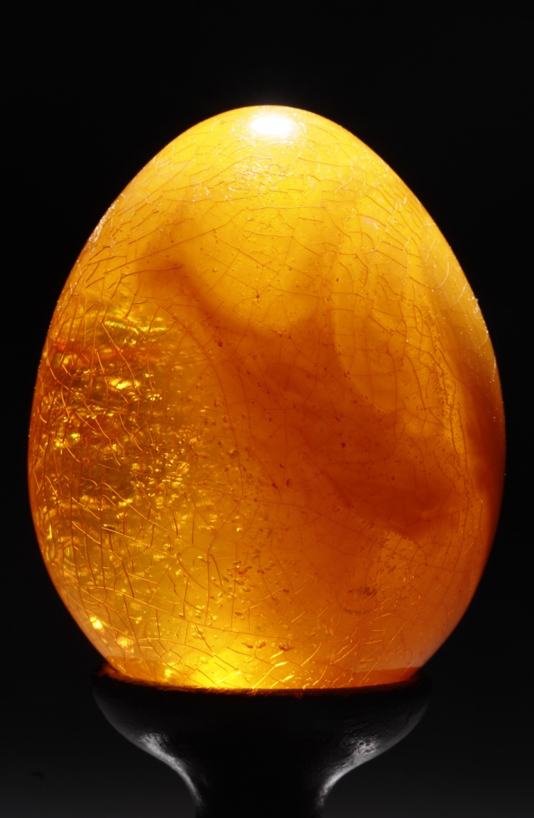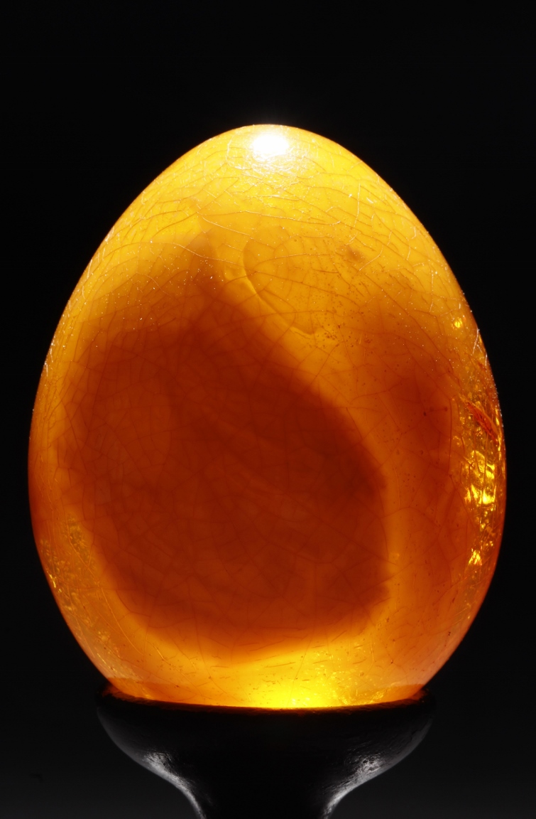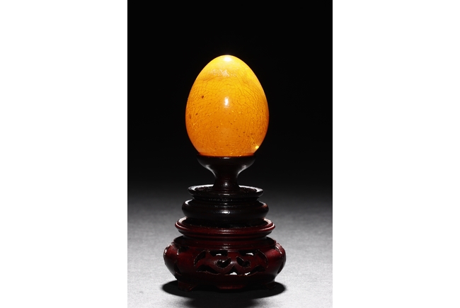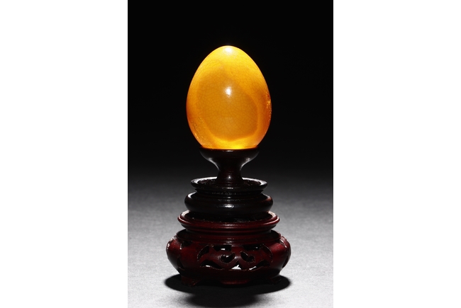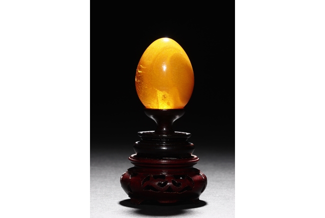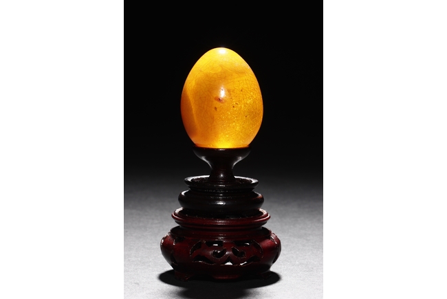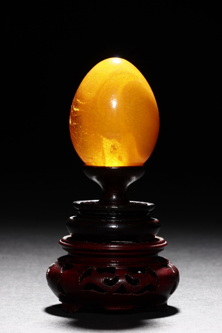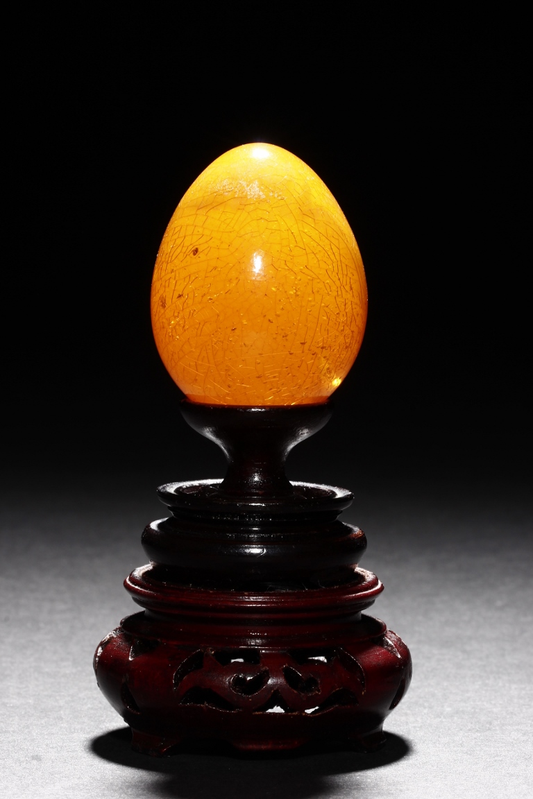 Of translucent golden-orange tone, the amber is in shape of egg. The surface is of natural crack-like texture. The amber is supported on a wooden stand.