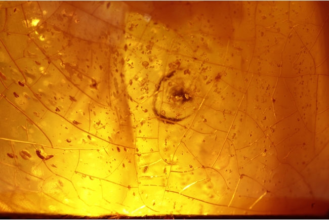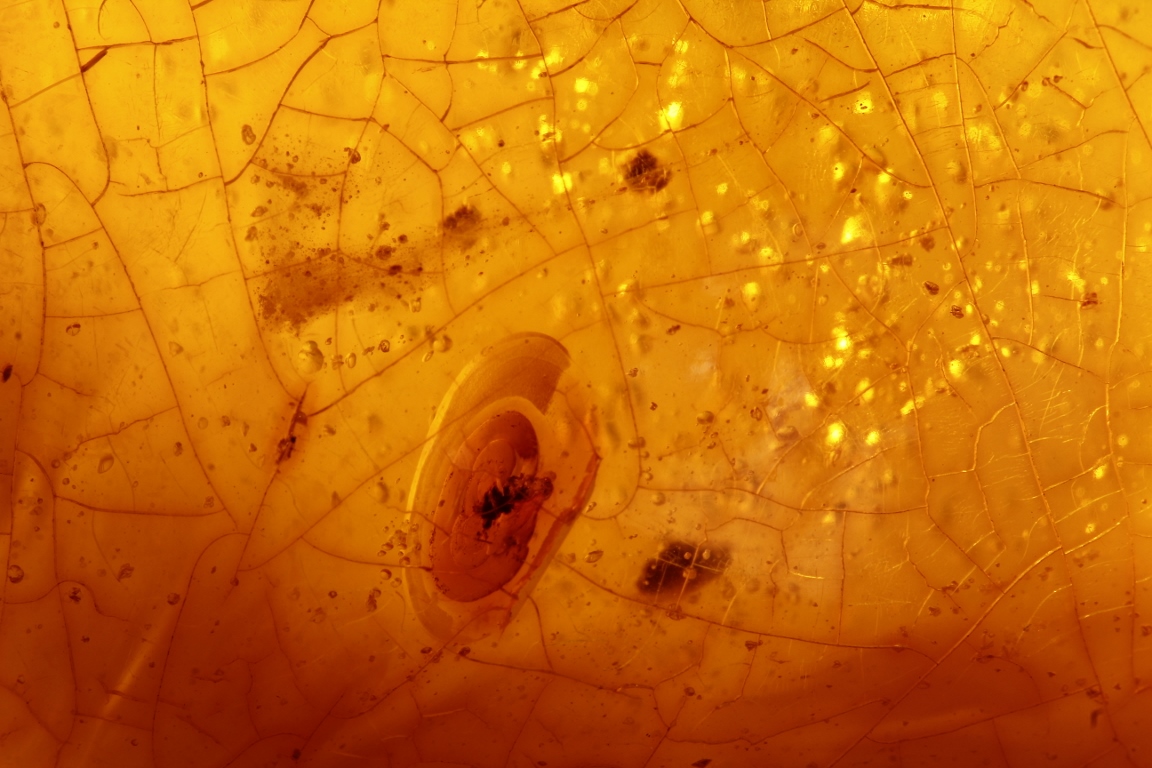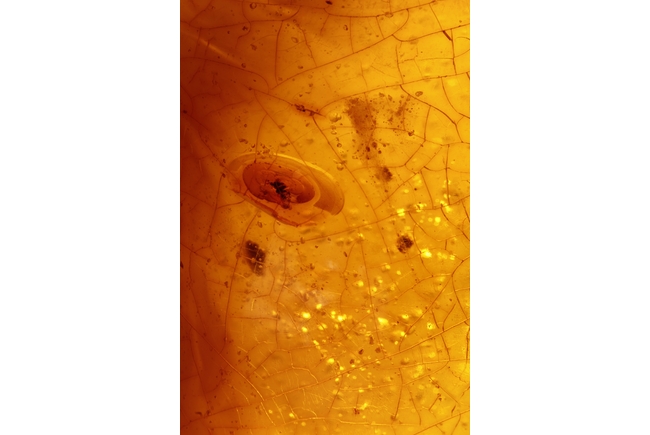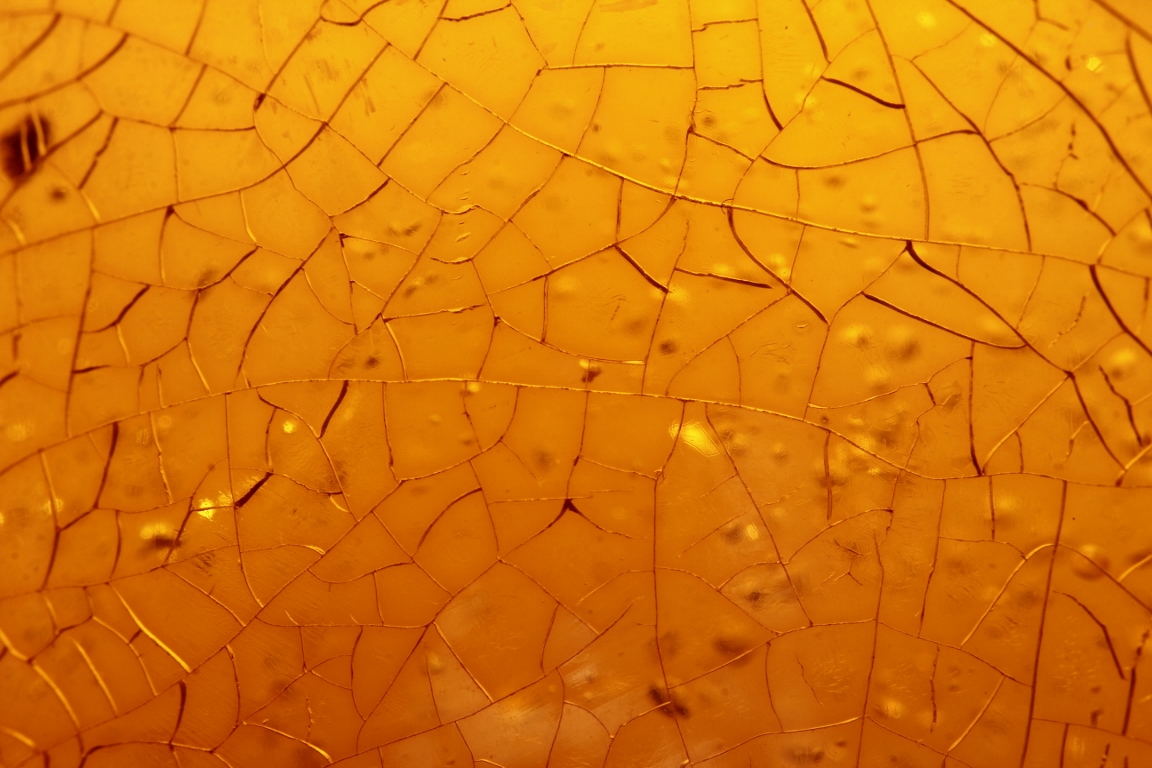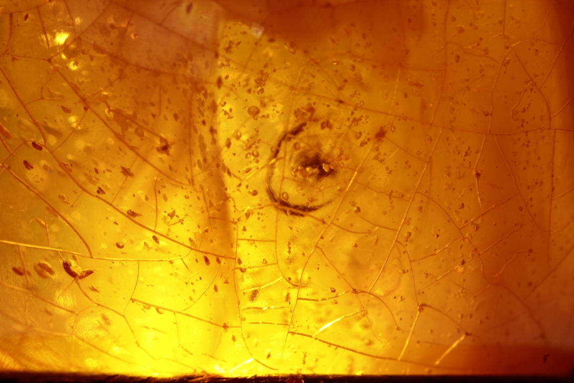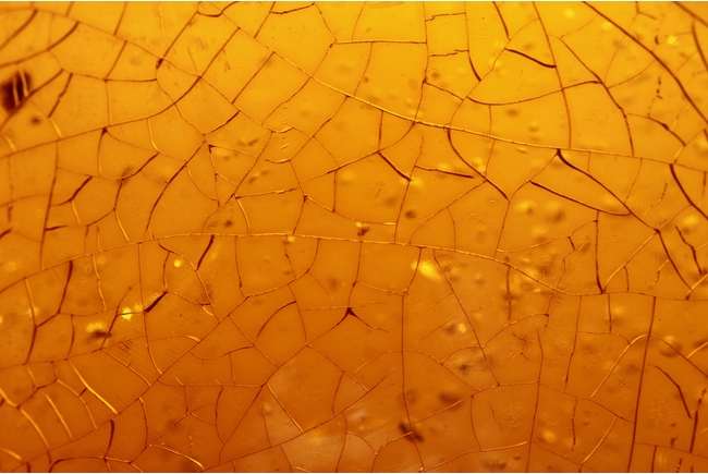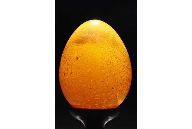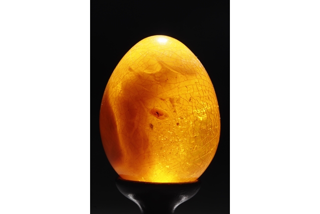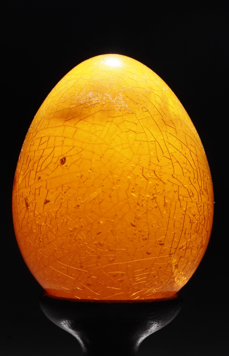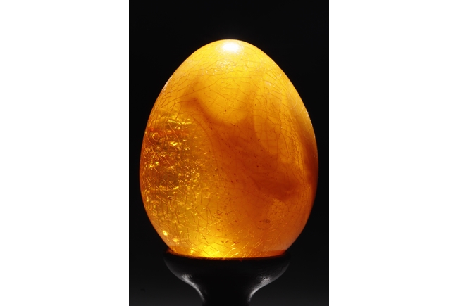 Of translucent golden-orange tone, the amber is in shape of egg. The surface is of natural crack-like texture. The amber is supported on a wooden stand.