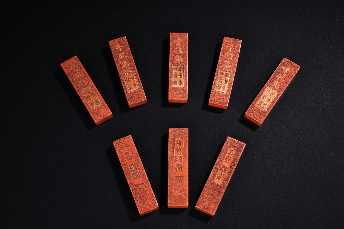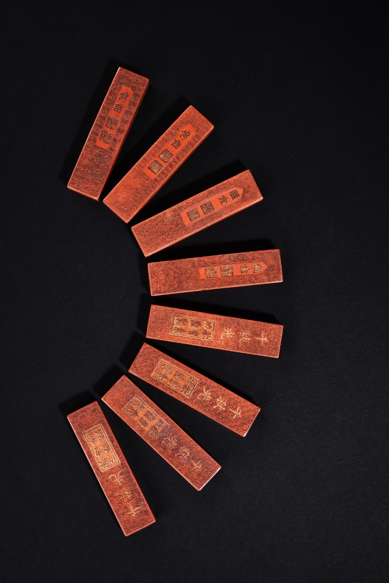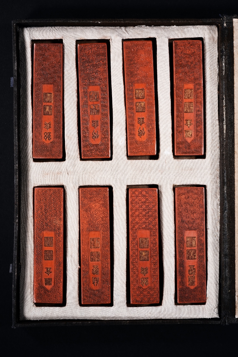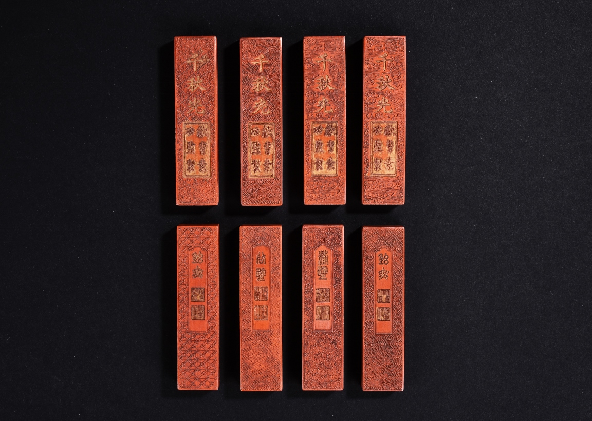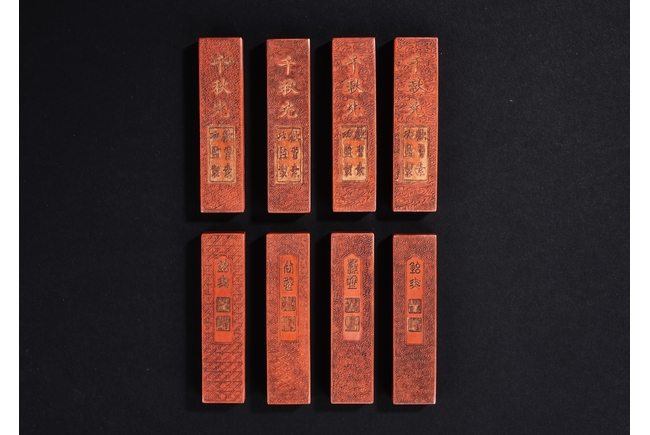 Of rectangular shape, each is finely incised with three characters 'Qin Qiu Guang' and author mark on front side, the reverse carved with two characters in seal script and two marks, all reserved in repeated motif of different theme. Accompanied by original case. Republic period.