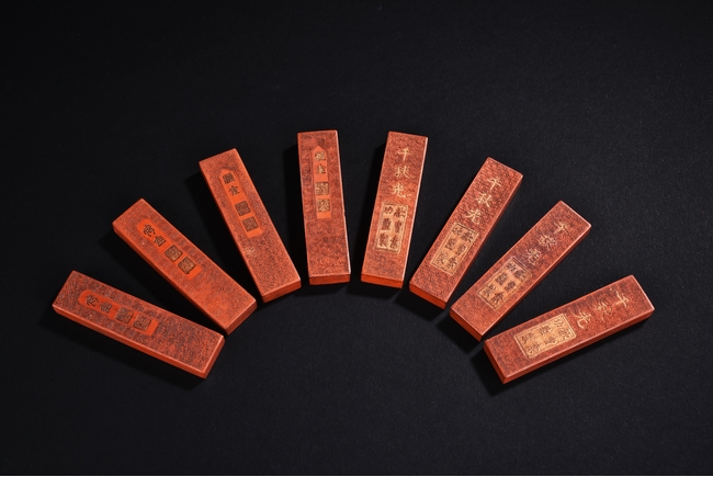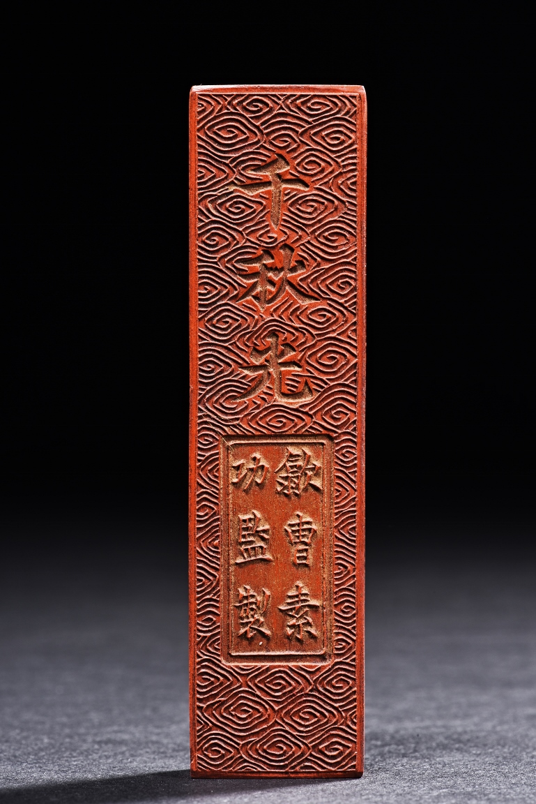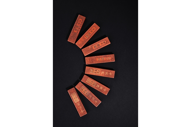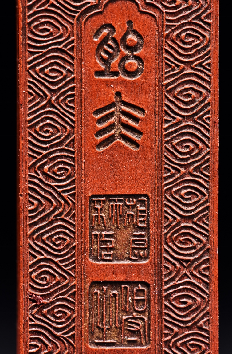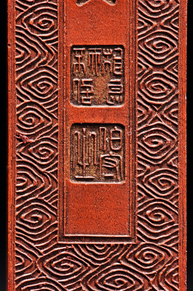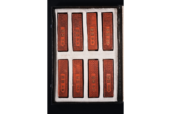 Of rectangular shape, each is finely incised with three characters 'Qin Qiu Guang' and author mark on front side, the reverse carved with two characters in seal script and two marks, all reserved in repeated motif of different theme. Accompanied by original case. Republic period.