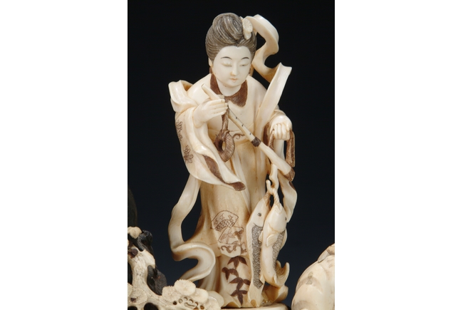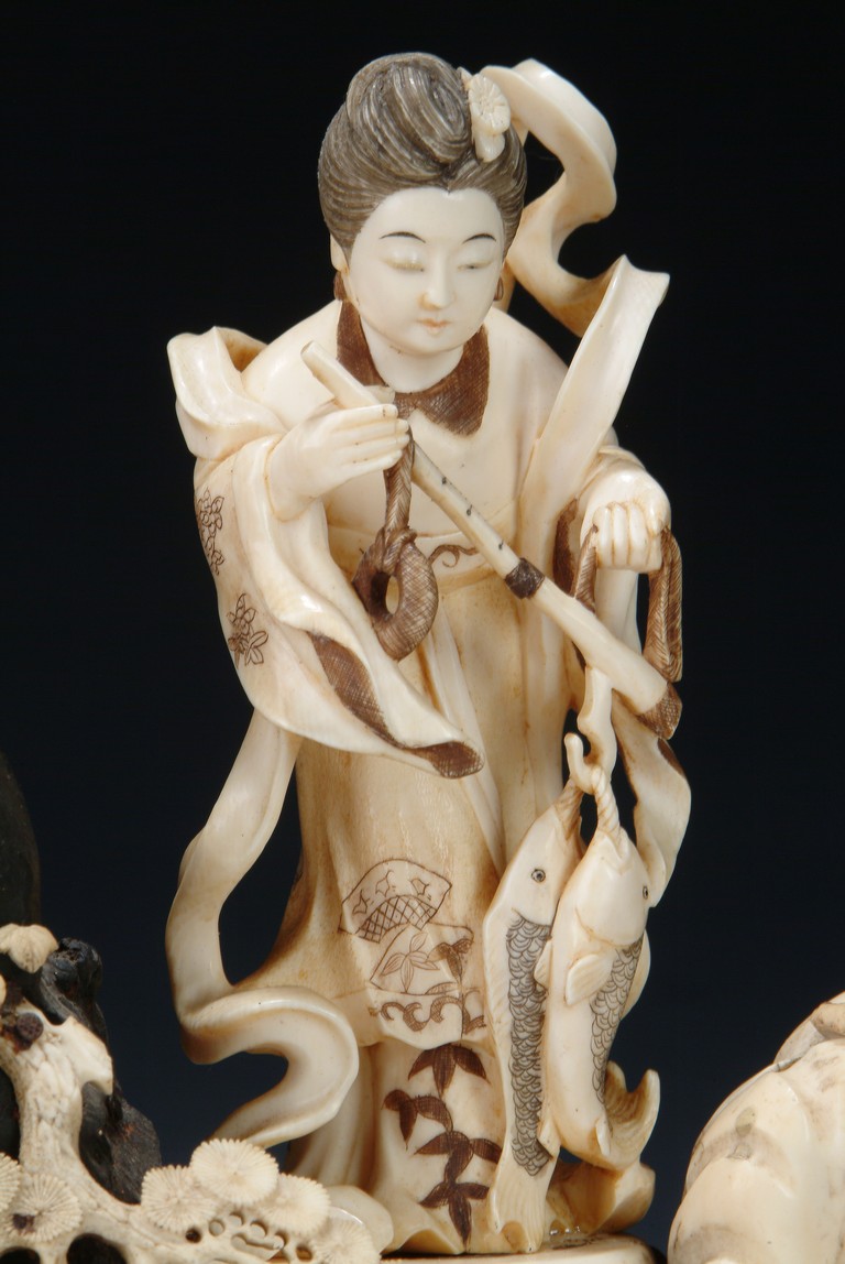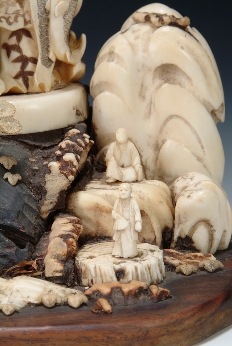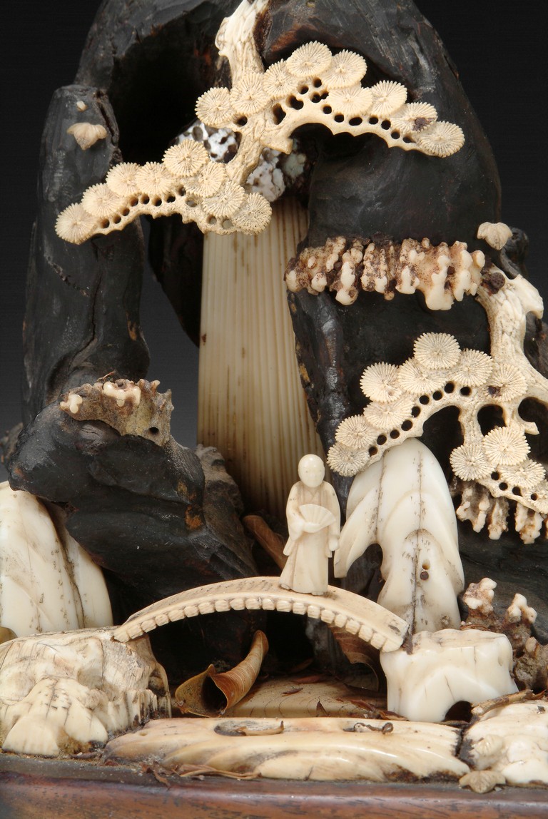 This figural group consist of a figure, arising behind a landscaping carving. Human figures, waterfall, pine trees, and wooden bridges. The mountain range was carved out of wood, inset with ivory carved pine trees, boulders, and human figures. Early 19th century.