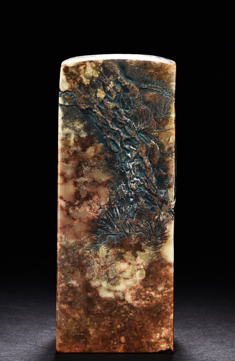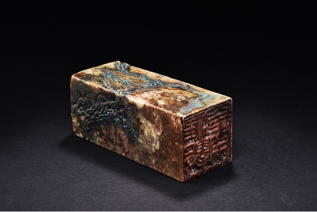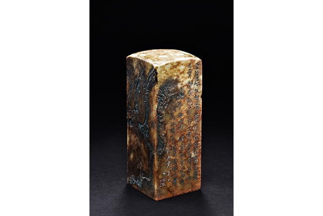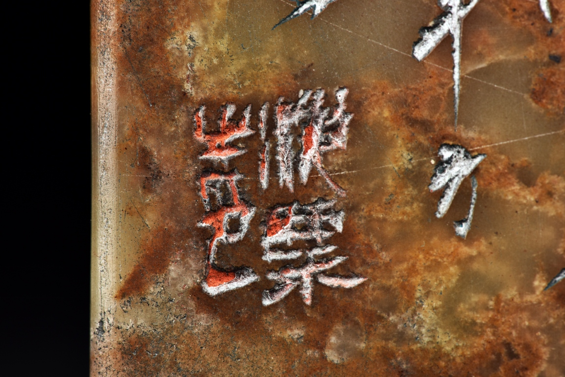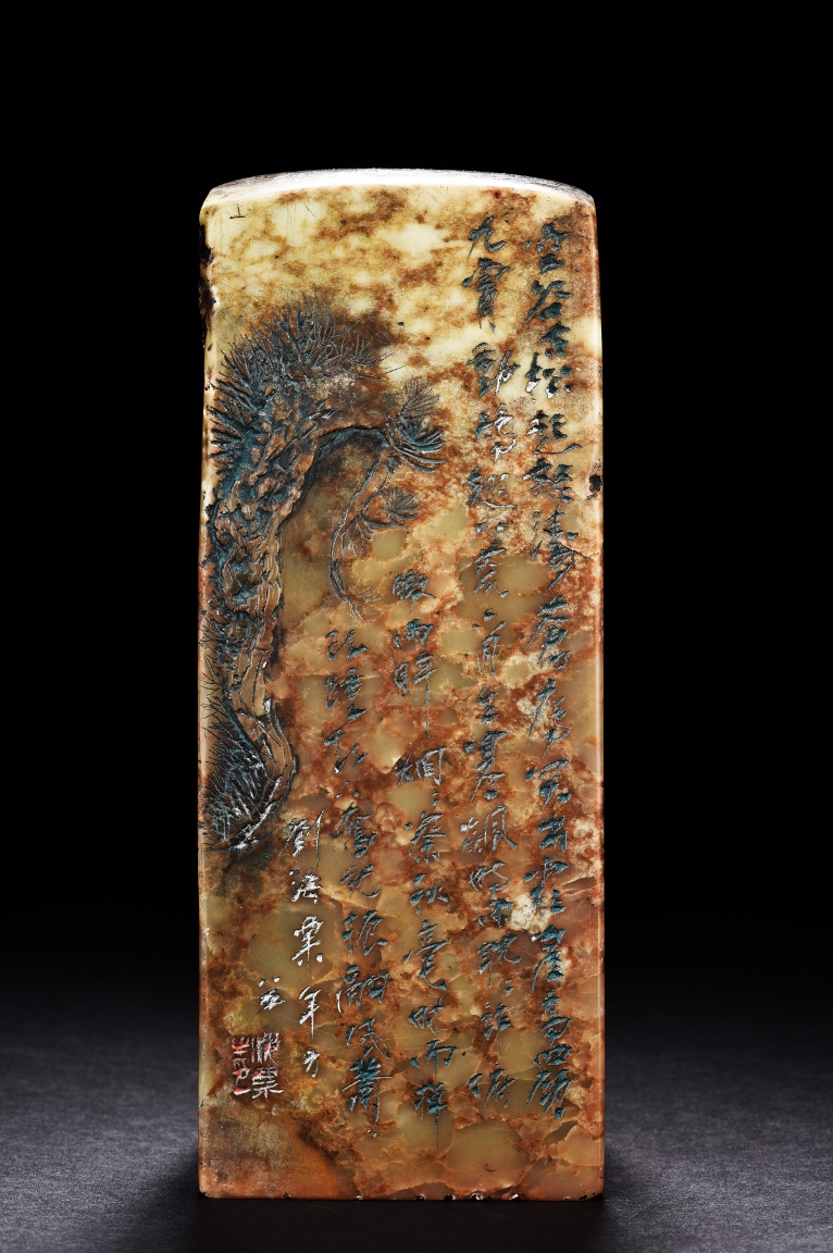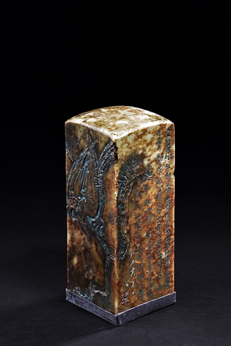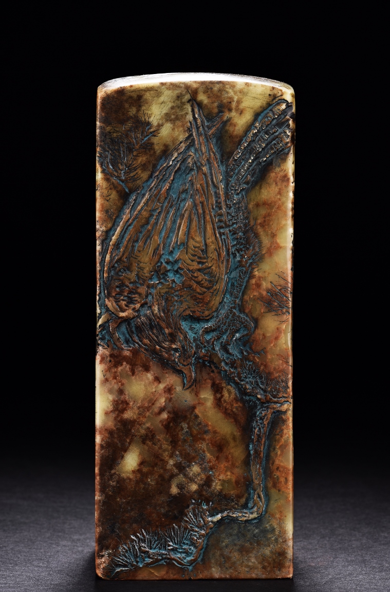 This large shoushan soapstone seal is of rectangular shape; one side carved with an attentive eagle sitting on pine tree; another side carved with pine branches issuing from rock; another side carved with pine branches and inscriptions including author's name and mark. The seal base is carved with four characters.