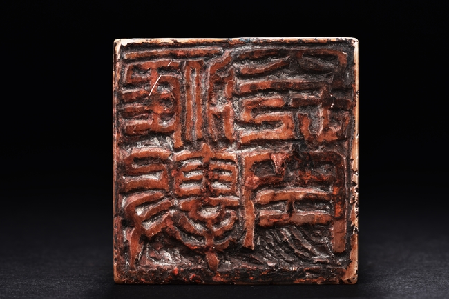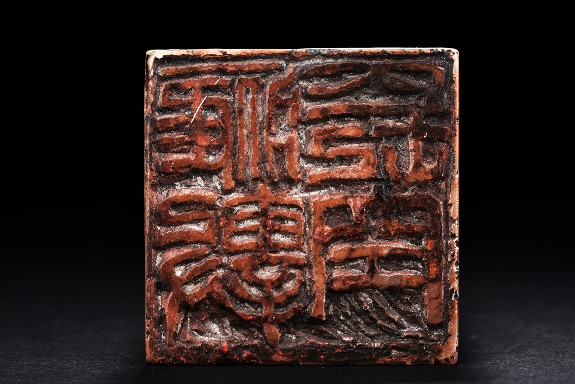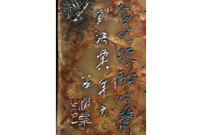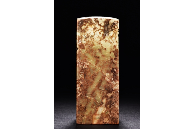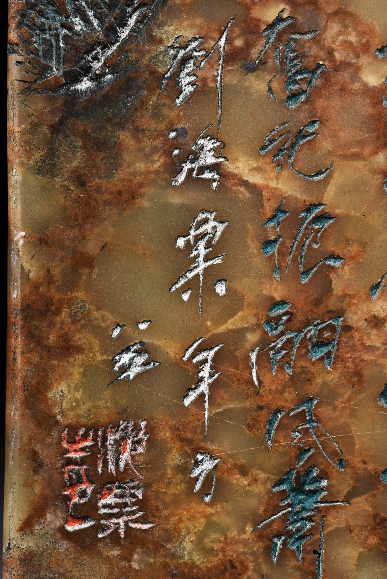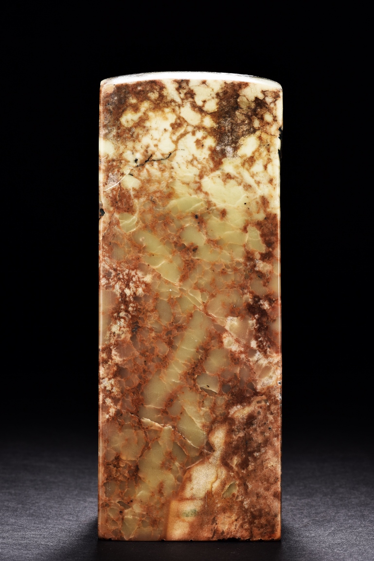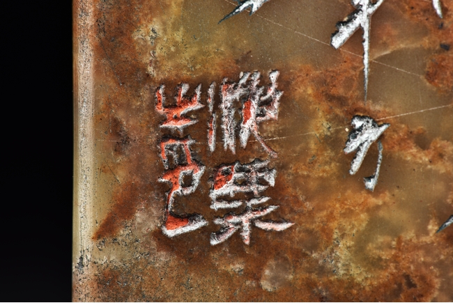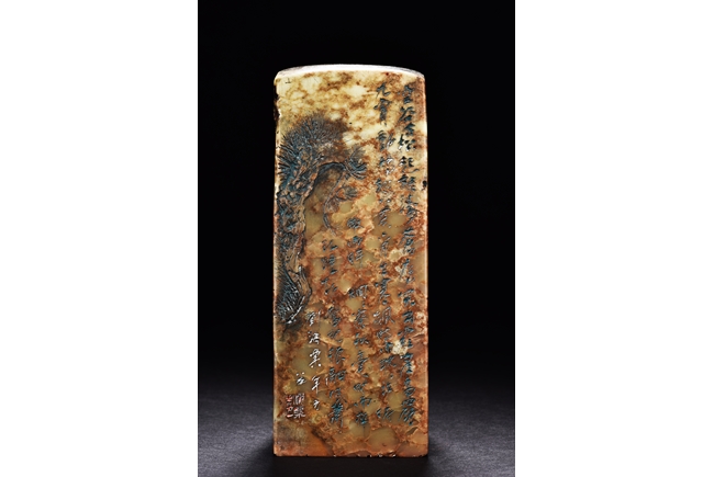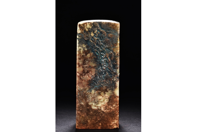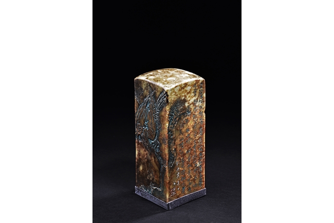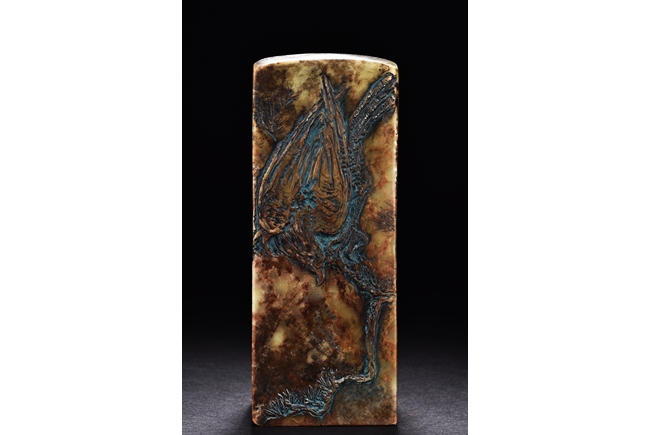 This large shoushan soapstone seal is of rectangular shape; one side carved with an attentive eagle sitting on pine tree; another side carved with pine branches issuing from rock; another side carved with pine branches and inscriptions including author's name and mark. The seal base is carved with four characters.