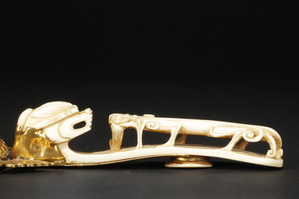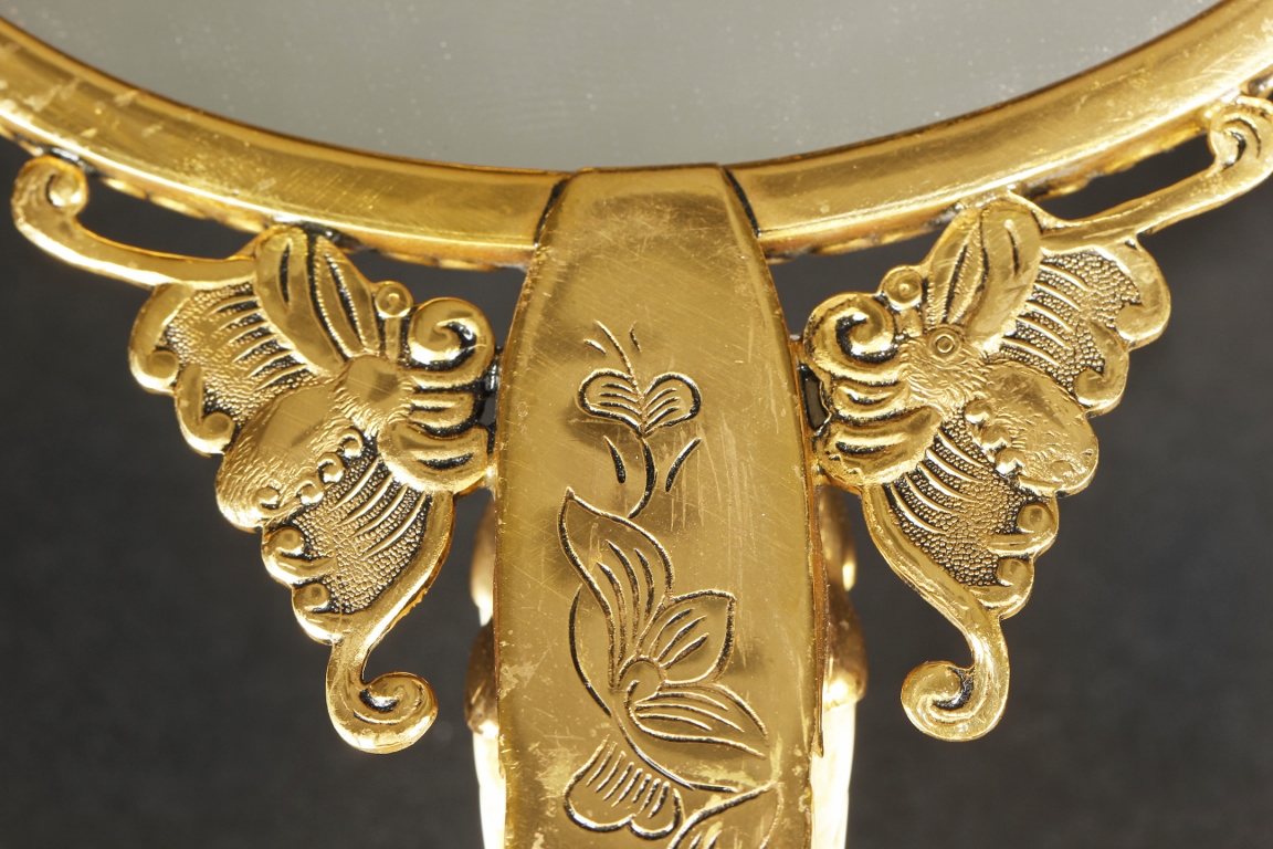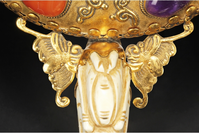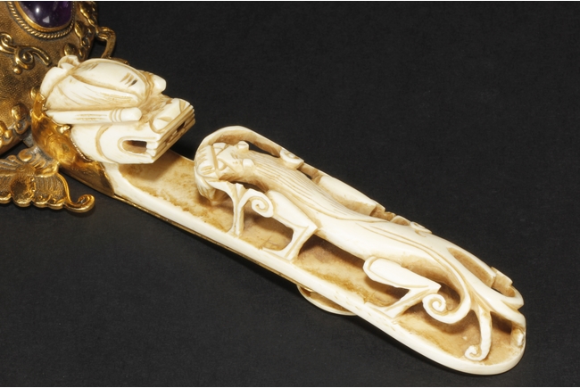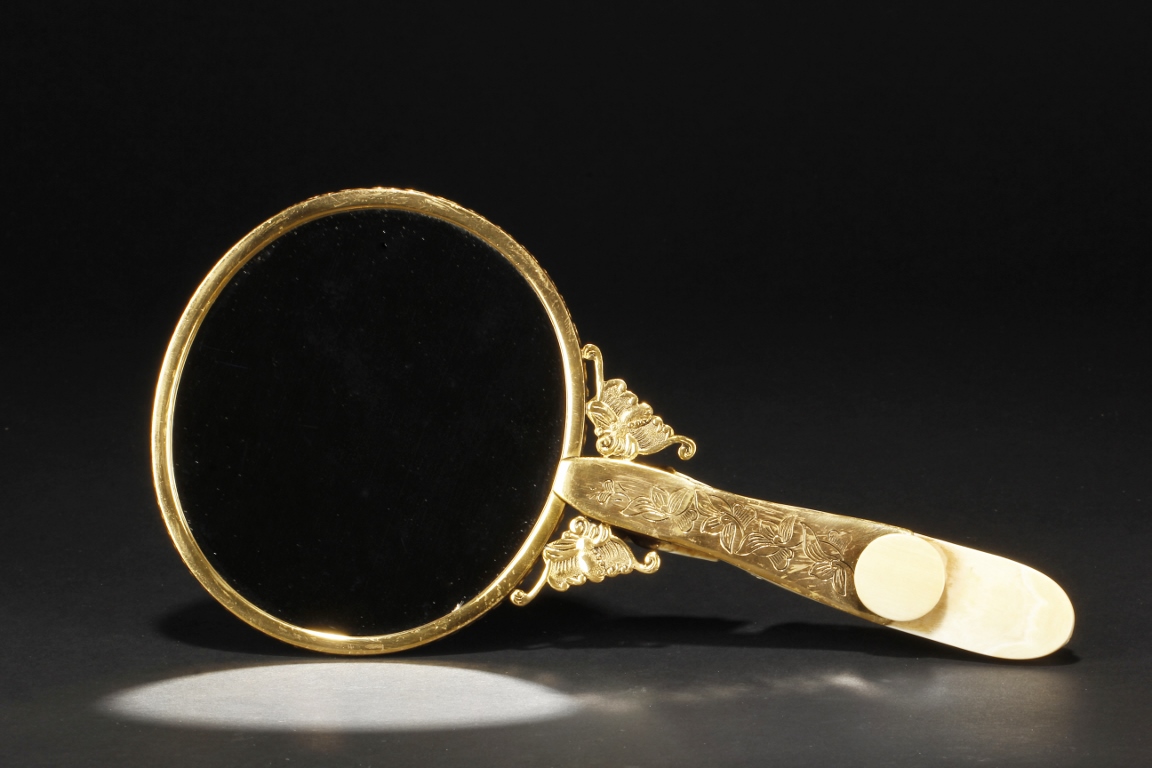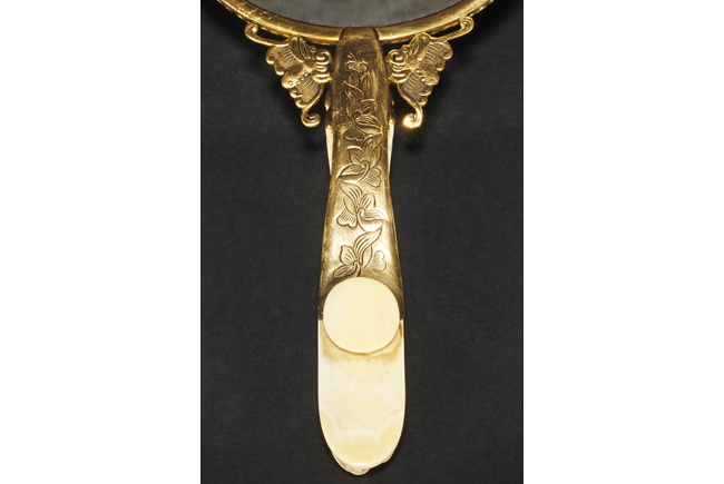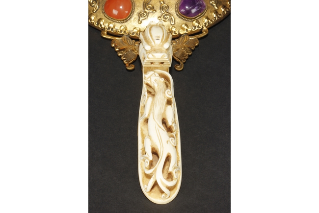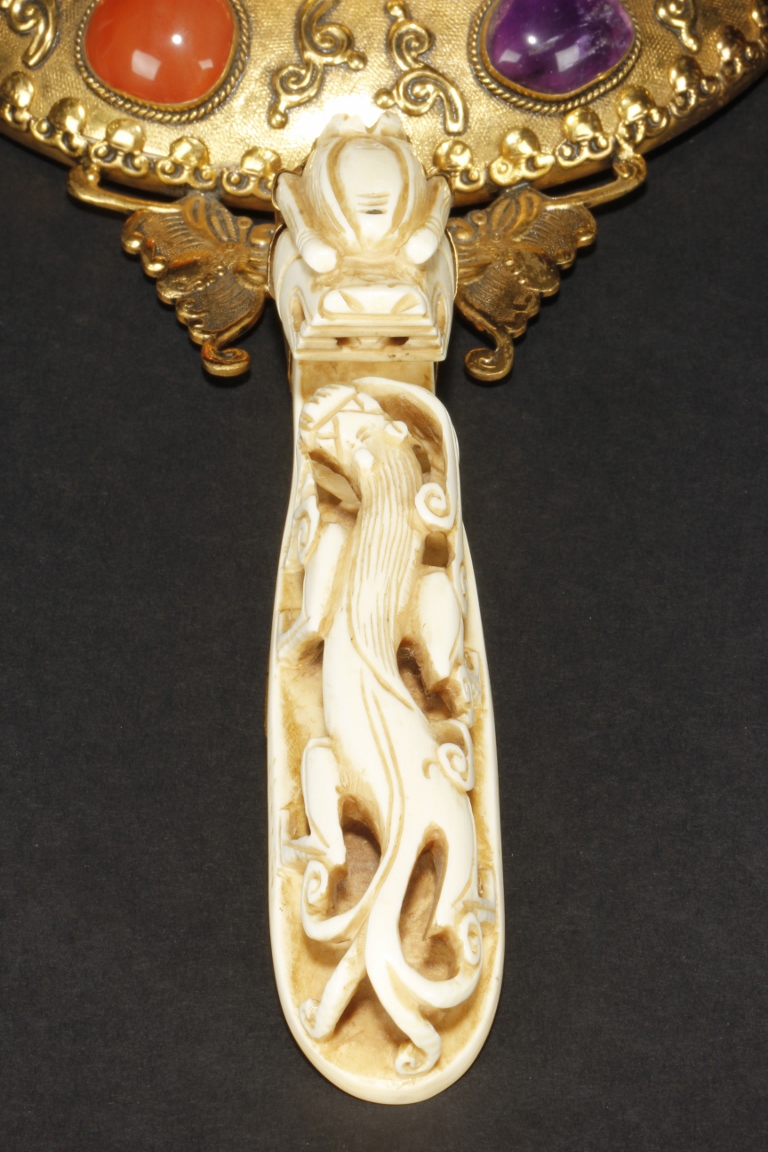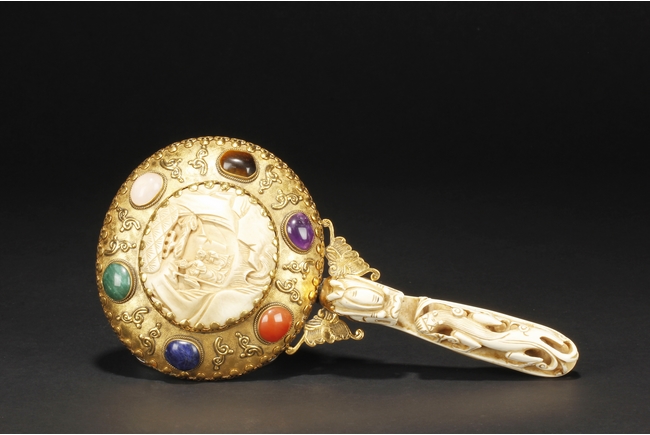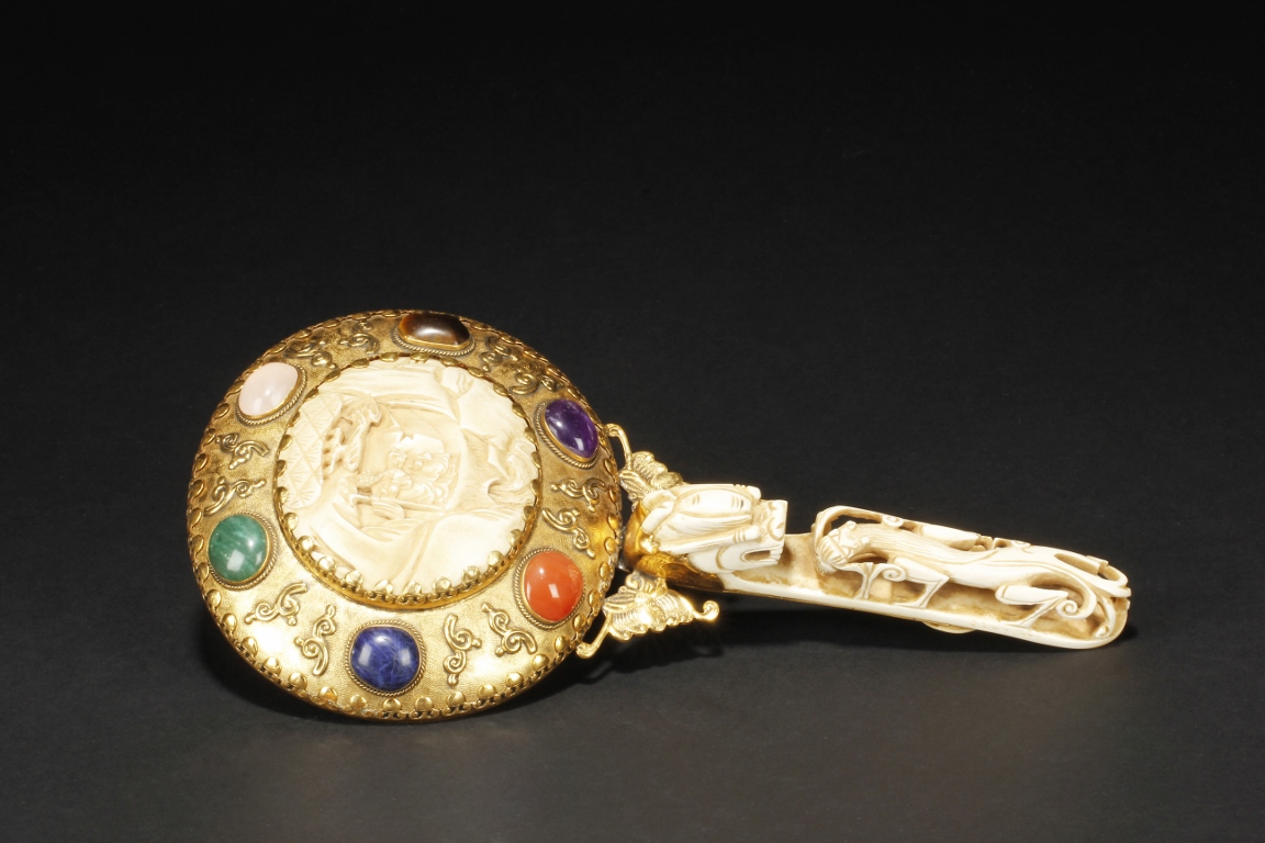 The mirror of perfect round form, framed with gilt silver, attached to a gilt silver and ivory handle incised with flowers and leaves patterns, enforced by two flying gilt-silver bats, the reverse side ornated with six different semi-precious stones such as lapis lazuli, malachite, agate, and more, the center holdes a carved ivory roundel depicting an elder and child in a forest setting, the backside of handle attached with an ivory head-hook of an elder chi-long confronting a young chi-long.Qing Dynasty period.
