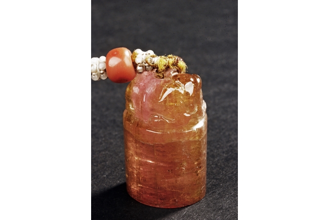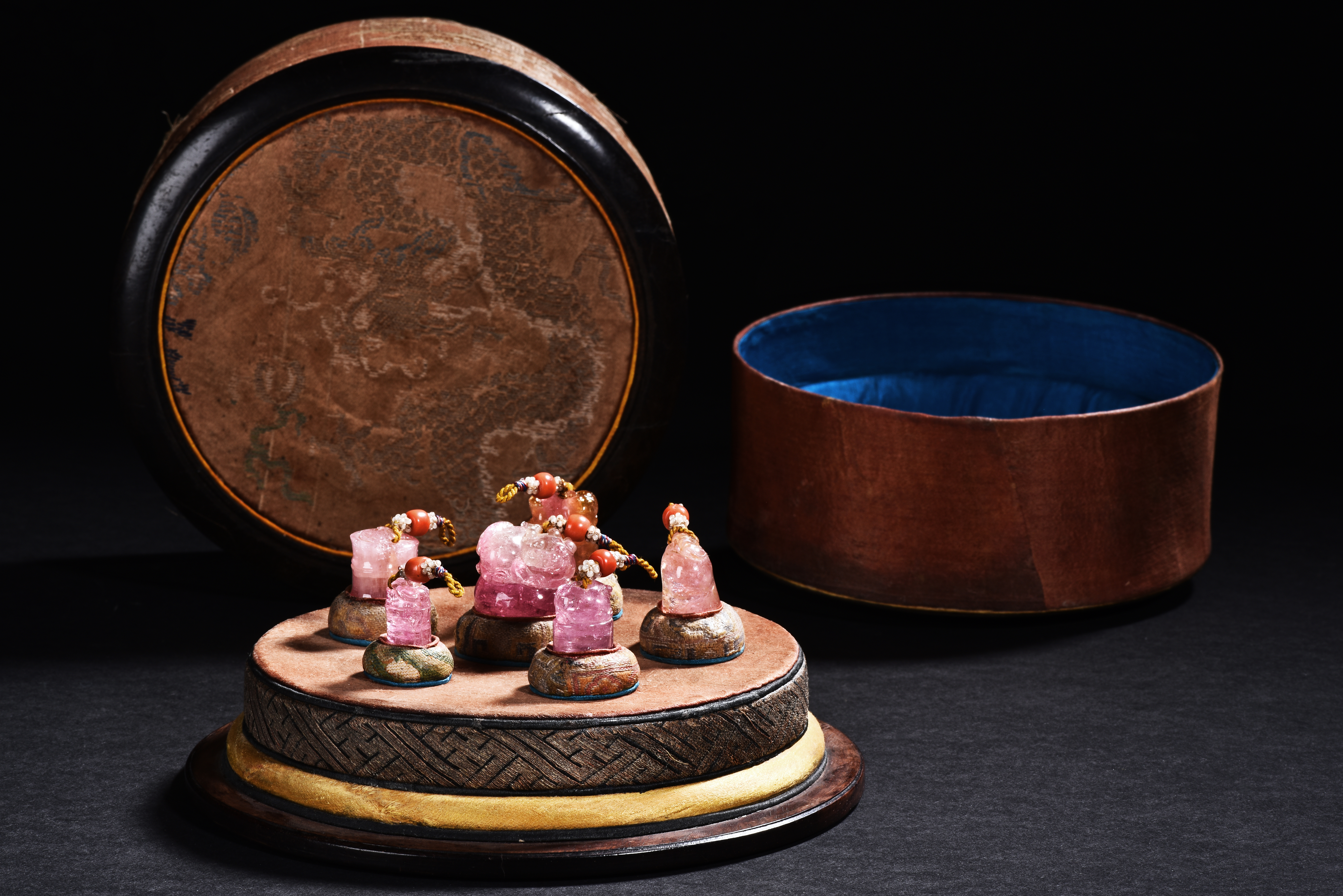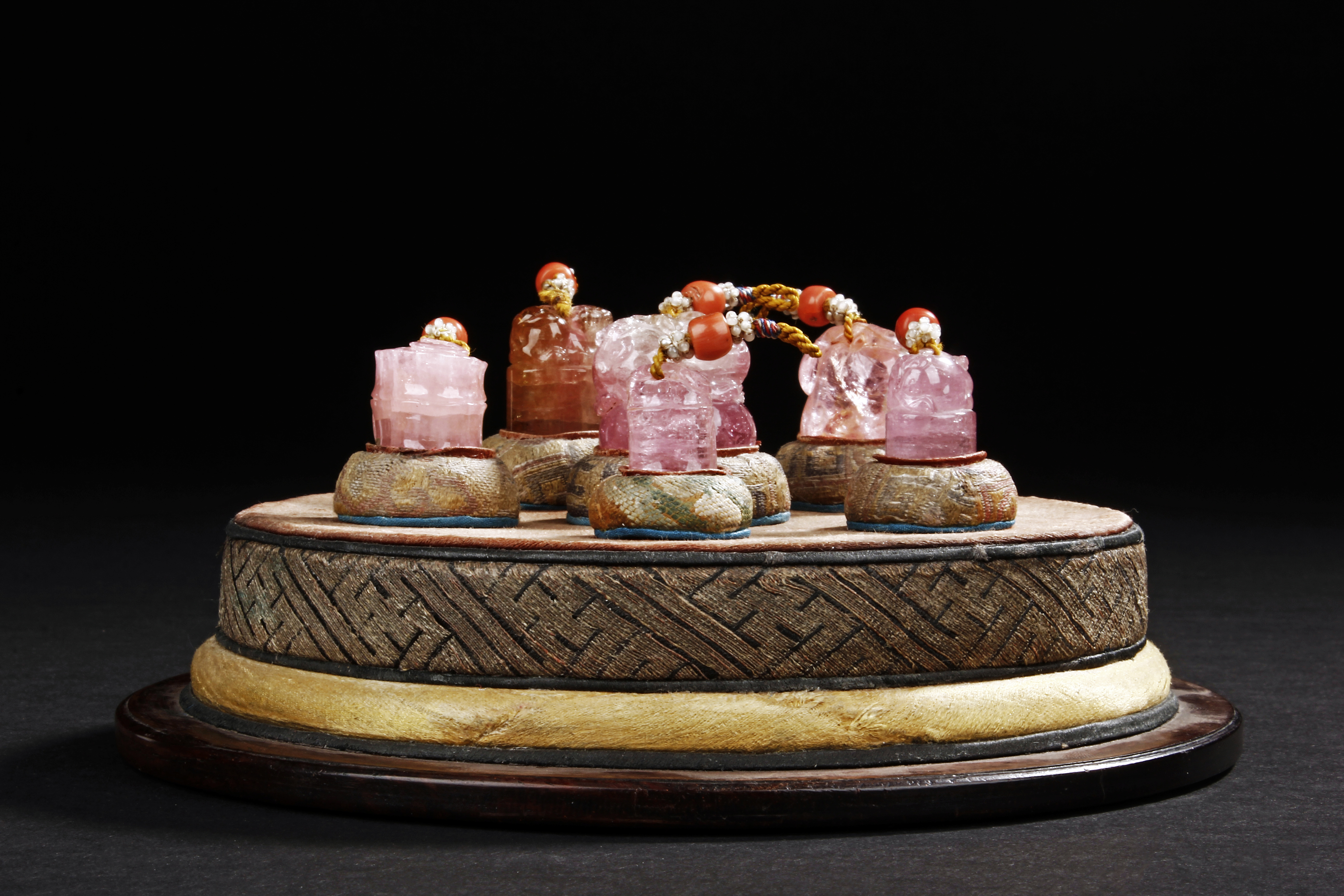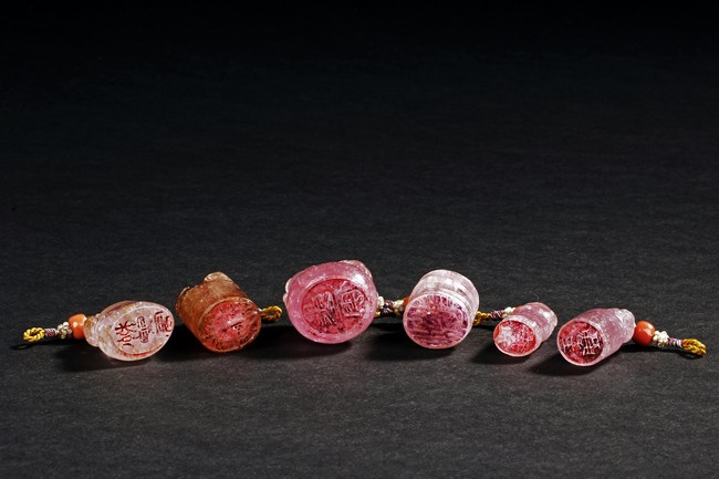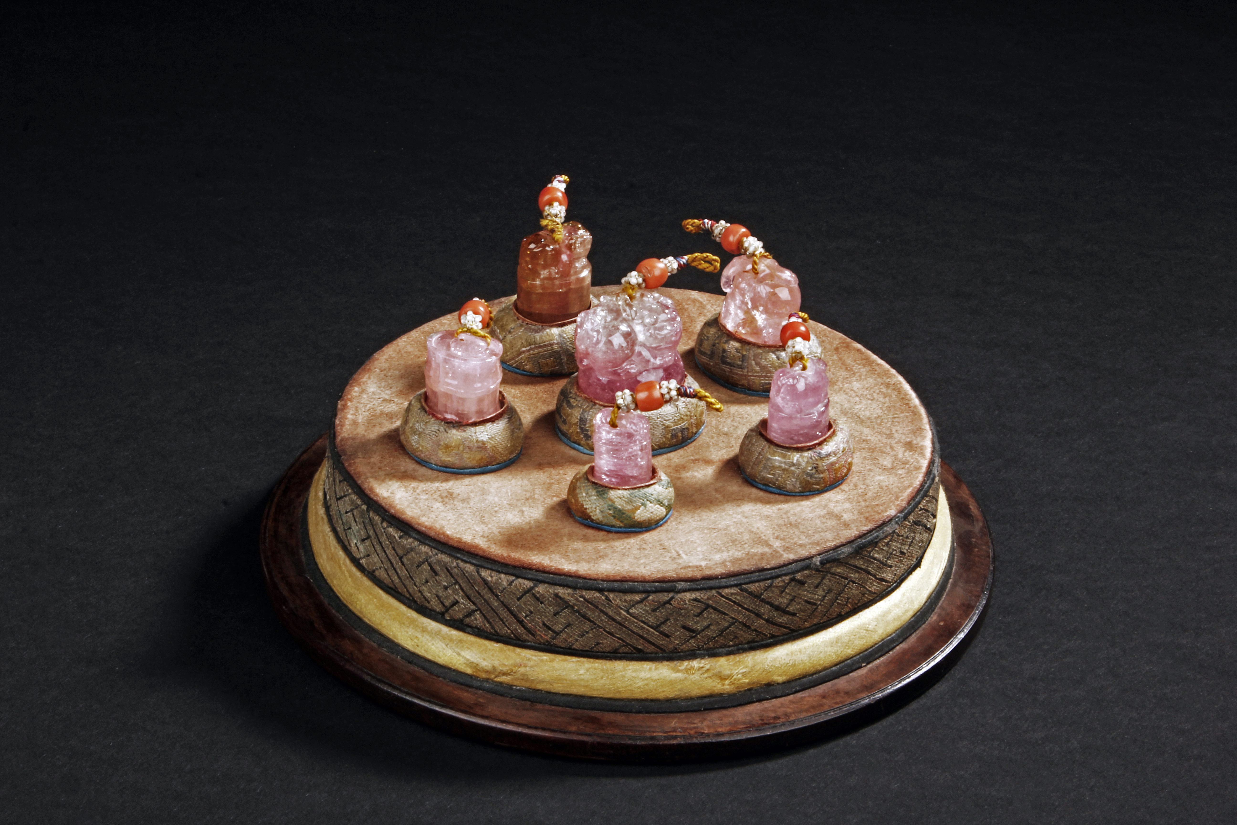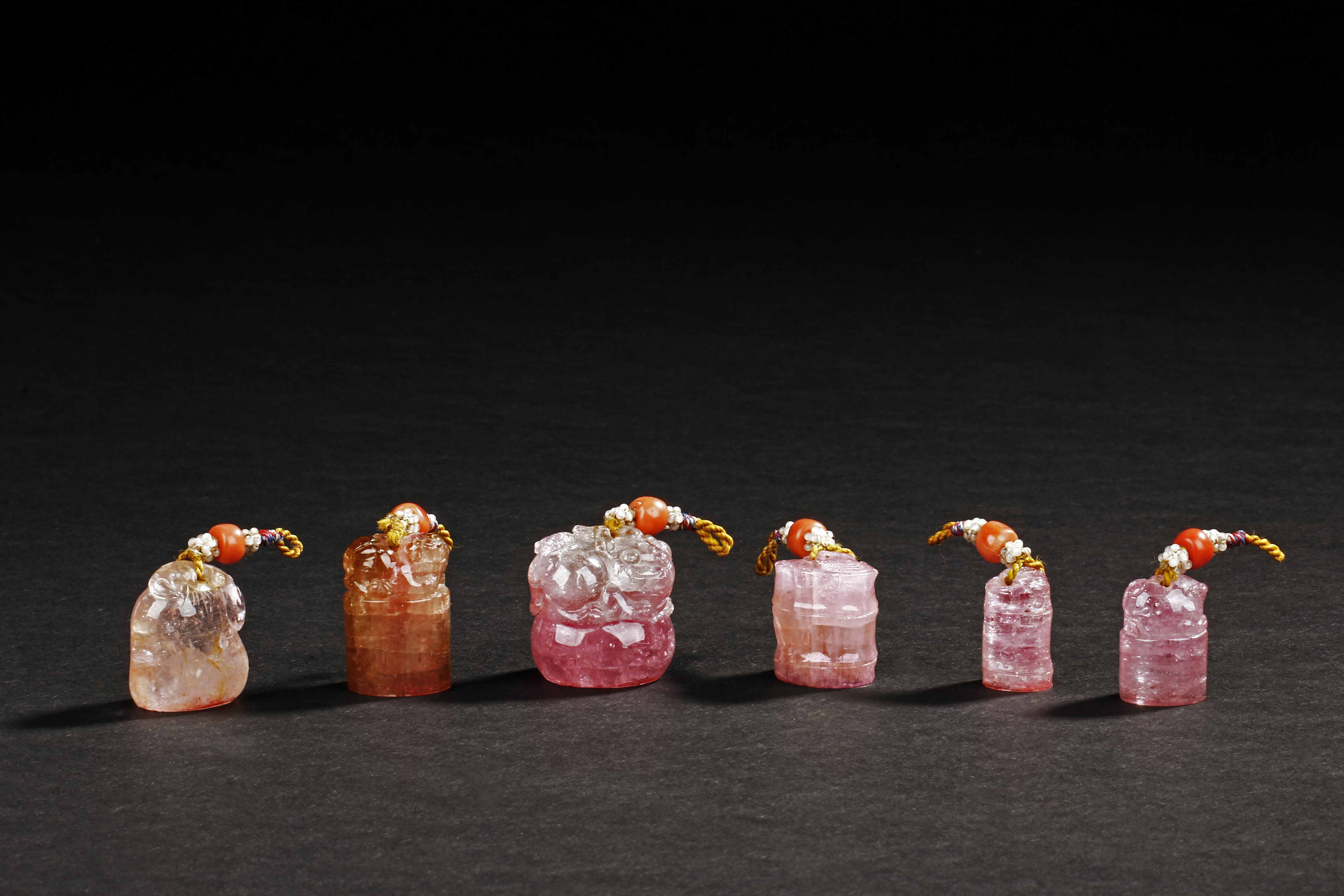 The set includes six imperial tourmaline seals; one is of bamboo section, the tone is of translucent whitish pink; one is of ovoid form, the top carved with mythical beast, the tone is of translucent pink tone; one is of ovoid form, the top carved with a recumbent lion turning its head to the side, the tone is of pink translucent tone; one is of irregular form and white pinkish tone. All six seals are placed in original circular box with cover with dragon design. Qing Dynasty period.