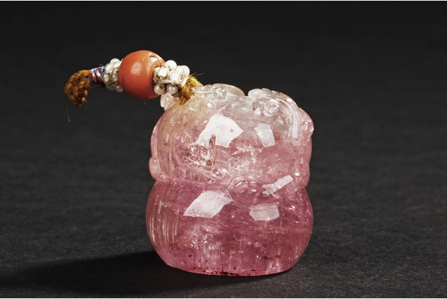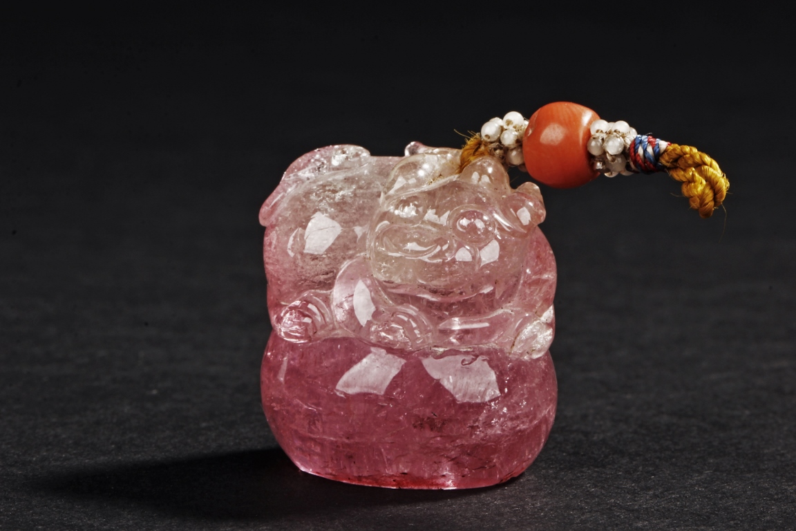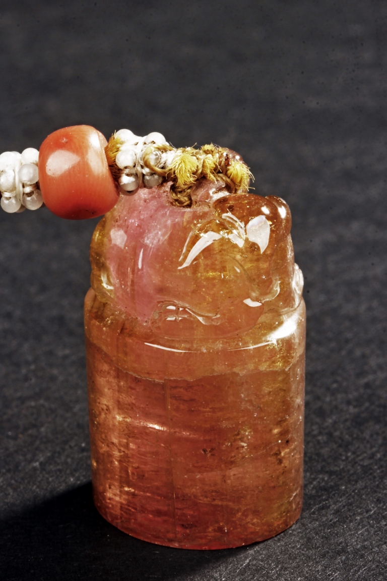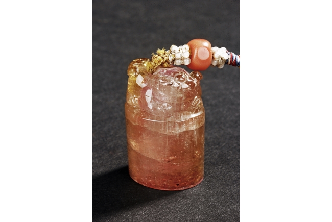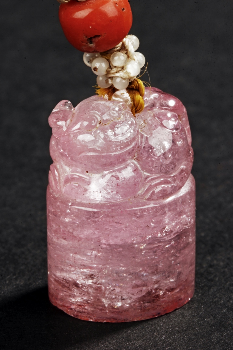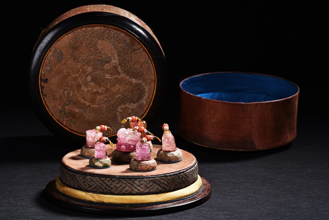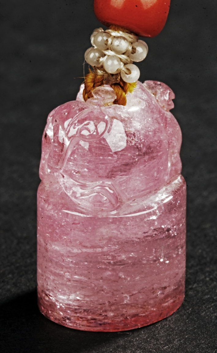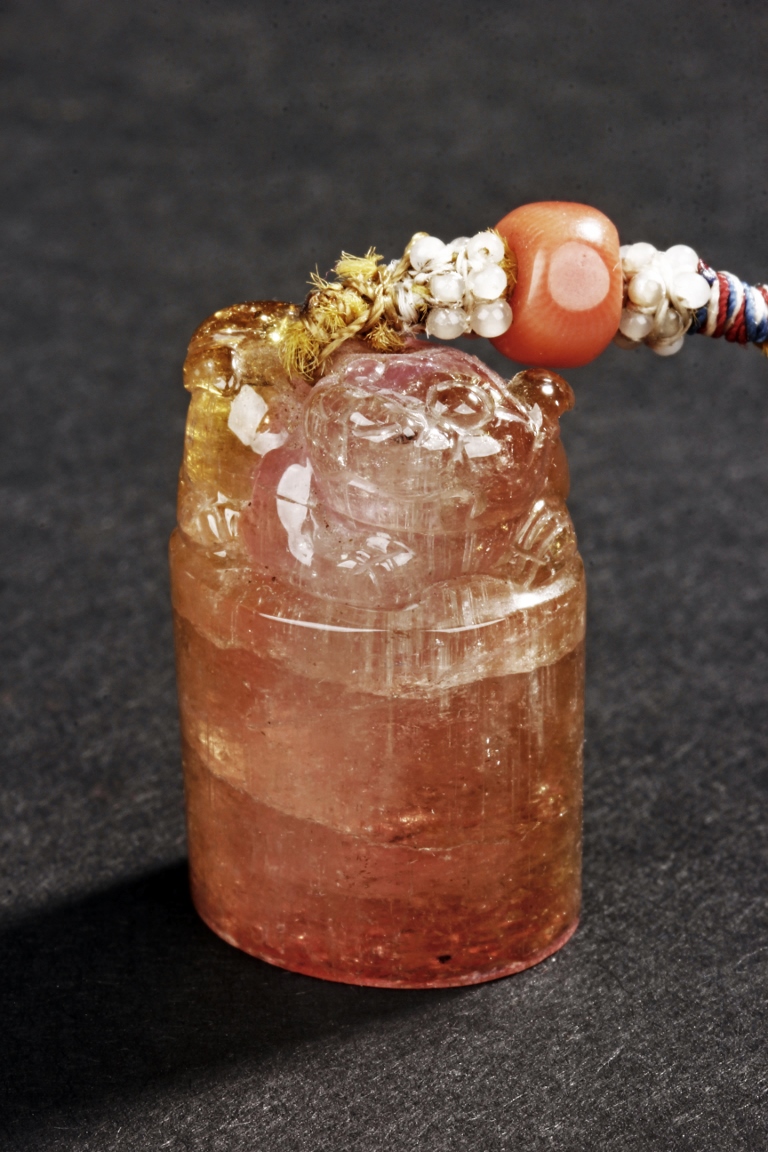 The set includes six imperial tourmaline seals; one is of bamboo section, the tone is of translucent whitish pink; one is of ovoid form, the top carved with mythical beast, the tone is of translucent pink tone; one is of ovoid form, the top carved with a recumbent lion turning its head to the side, the tone is of pink translucent tone; one is of irregular form and white pinkish tone. All six seals are placed in original circular box with cover with dragon design. Qing Dynasty period.