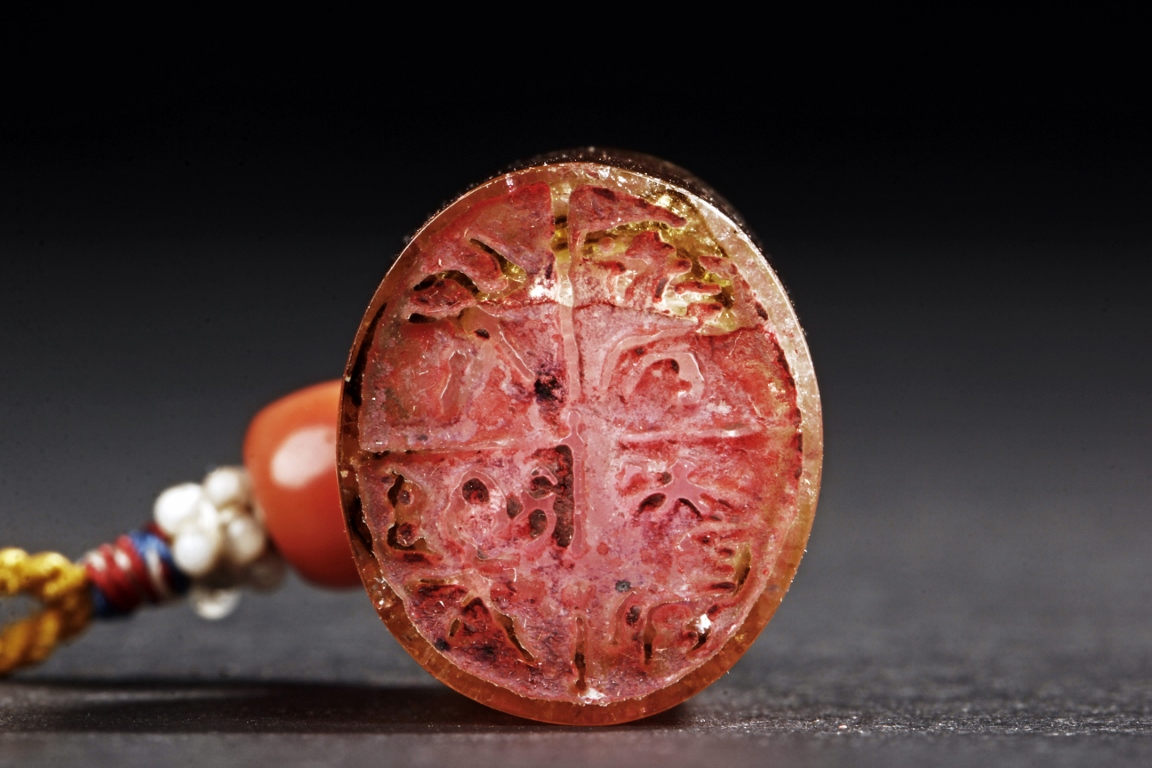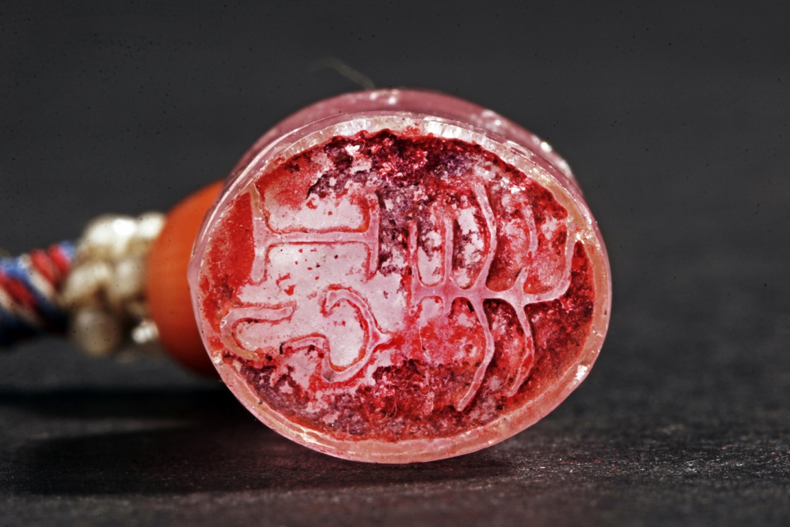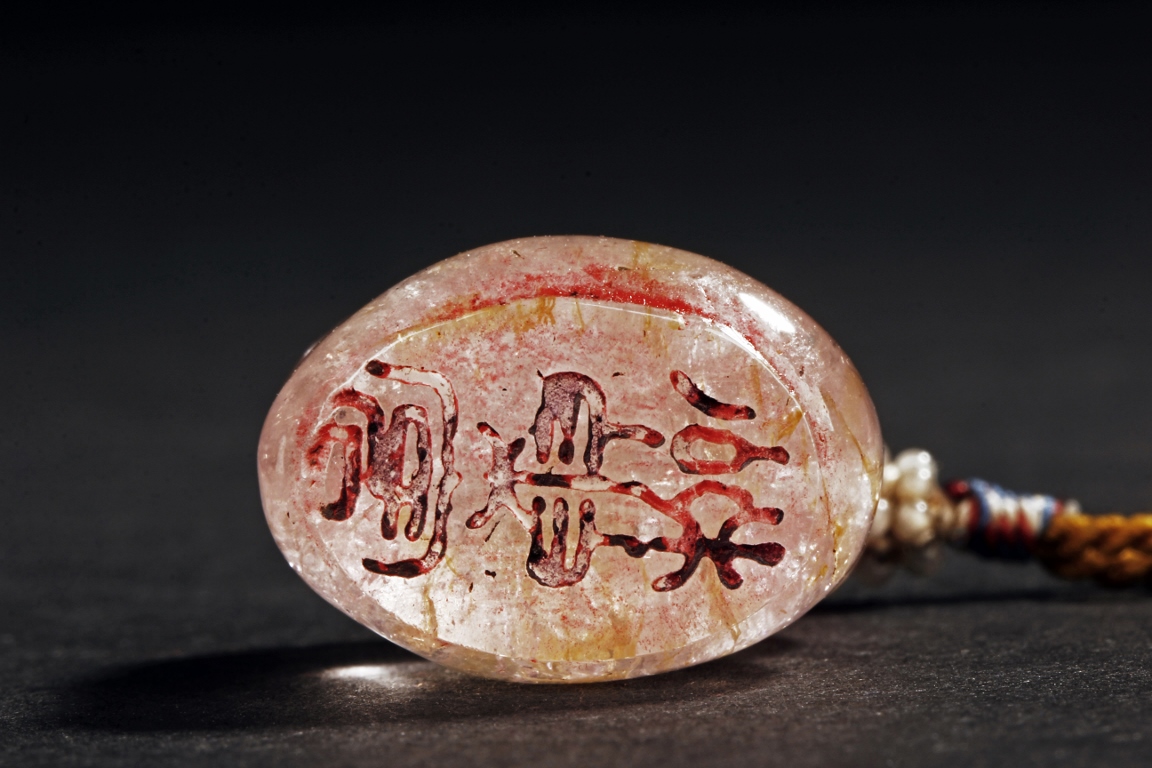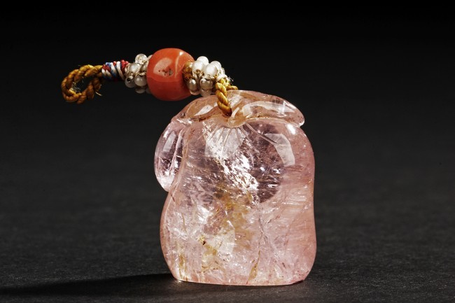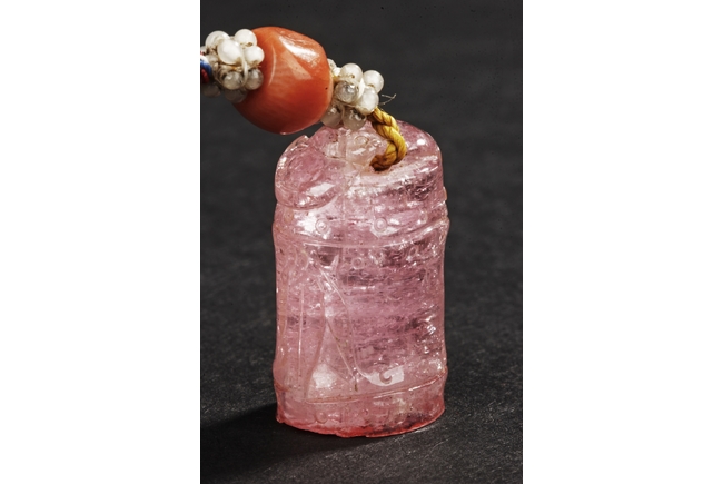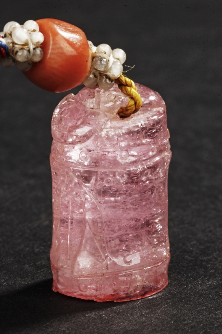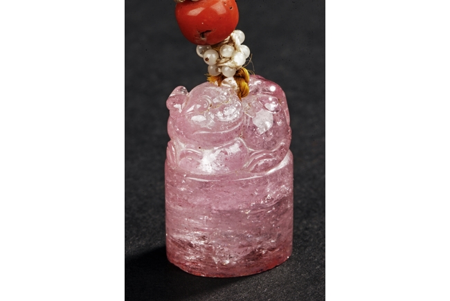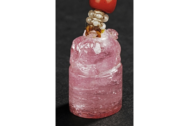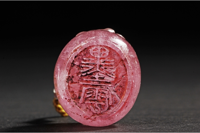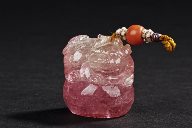 The set includes six imperial tourmaline seals; one is of bamboo section, the tone is of translucent whitish pink; one is of ovoid form, the top carved with mythical beast, the tone is of translucent pink tone; one is of ovoid form, the top carved with a recumbent lion turning its head to the side, the tone is of pink translucent tone; one is of irregular form and white pinkish tone. All six seals are placed in original circular box with cover with dragon design. Qing Dynasty period.