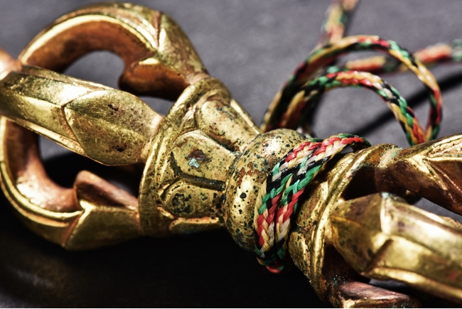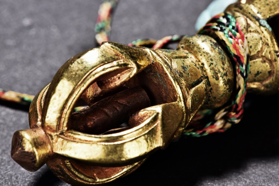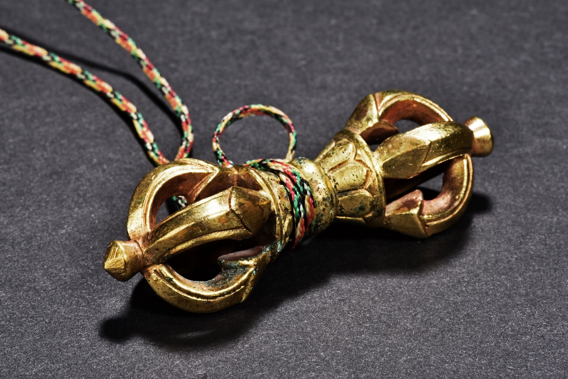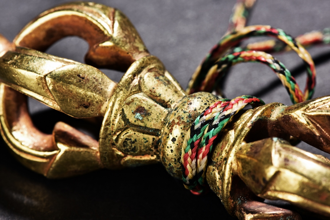 The vajra is constructed with four prongs issuing from makara heads, the central knop flanked by lotus friezes.