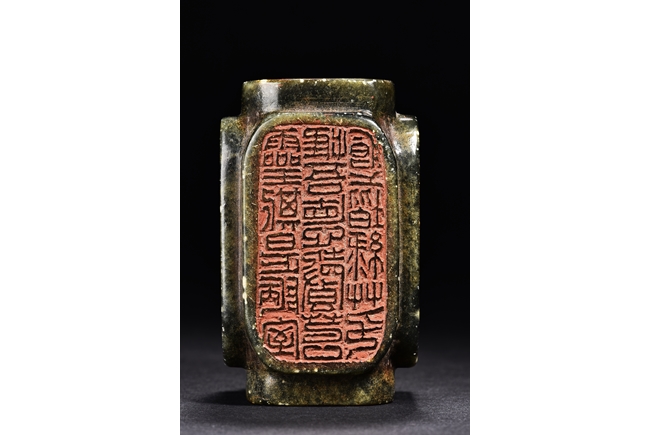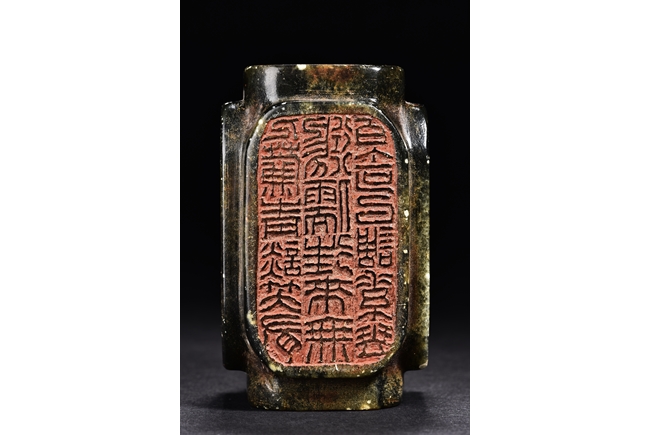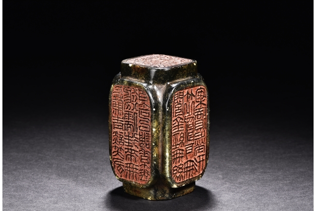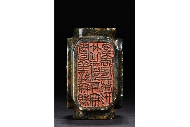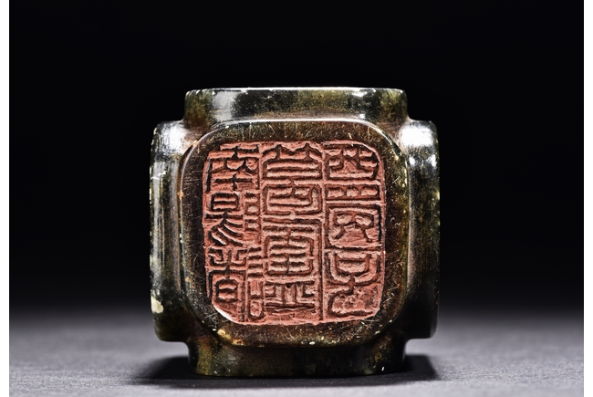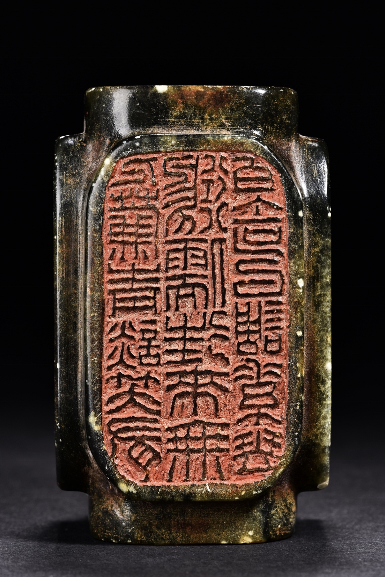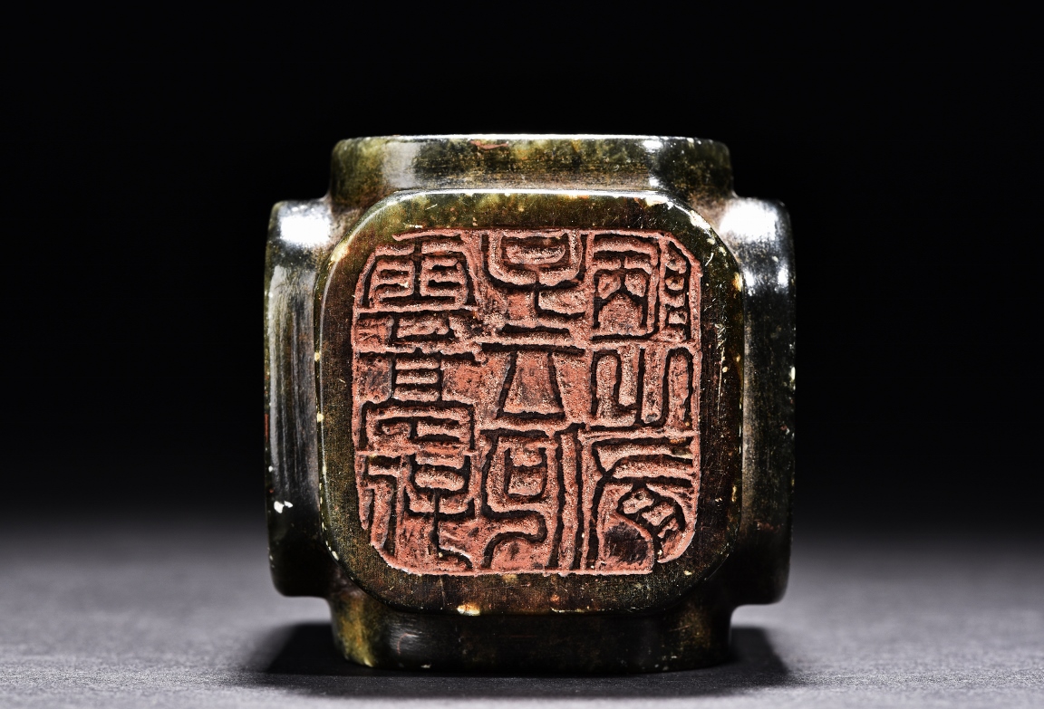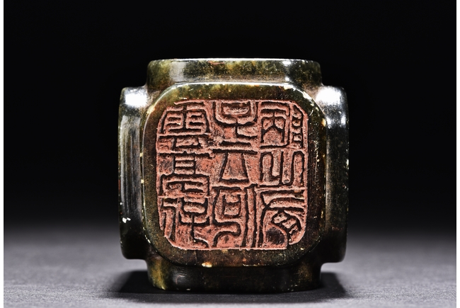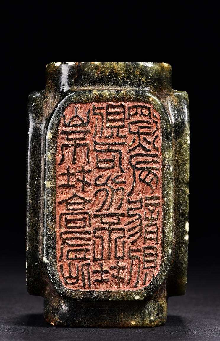 Of rectangular form, the seal is carved on with characters mark in seal script on each side, the stone is of semi-translucent mottled dark spinach tone. Qing Dynasty period.