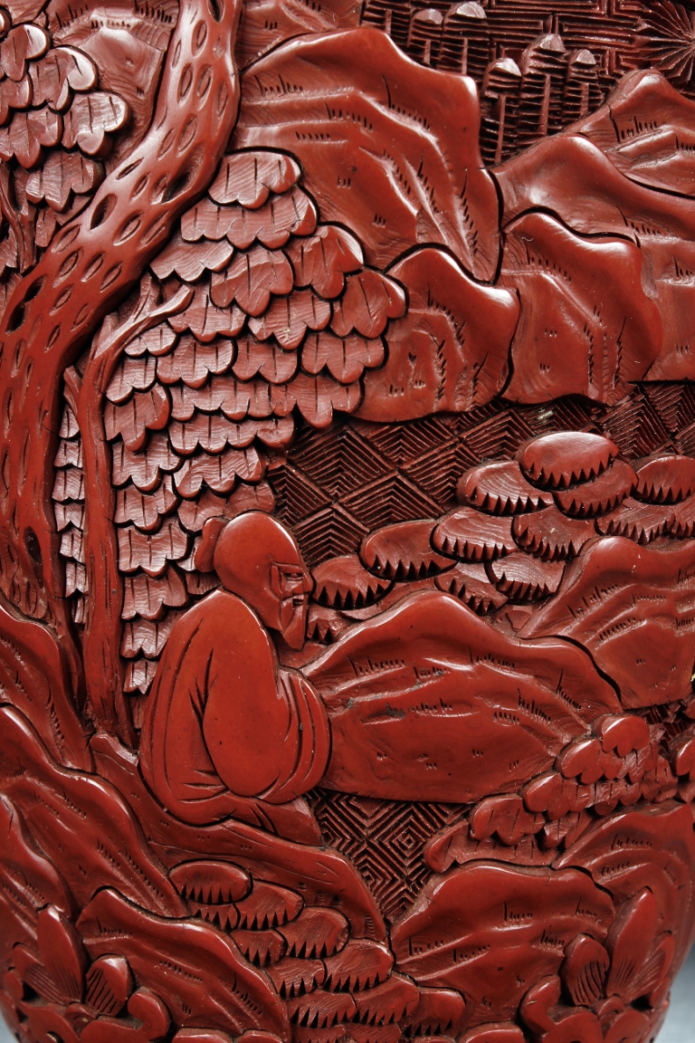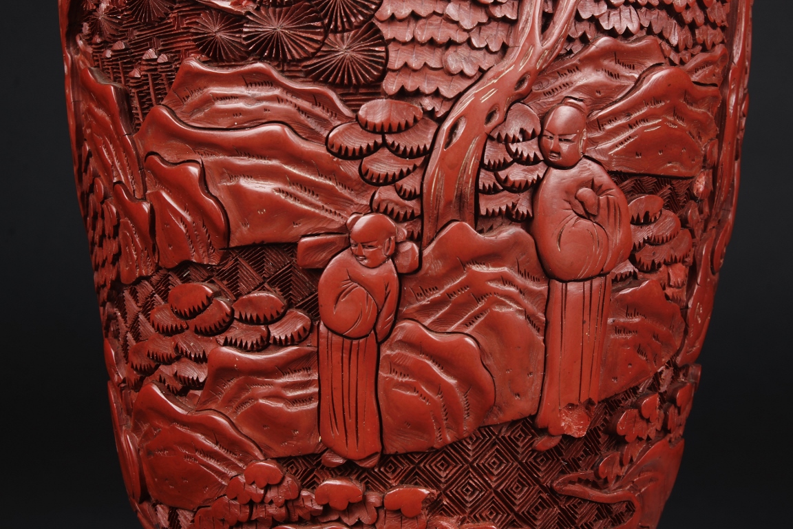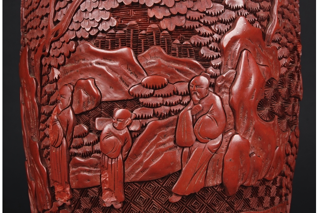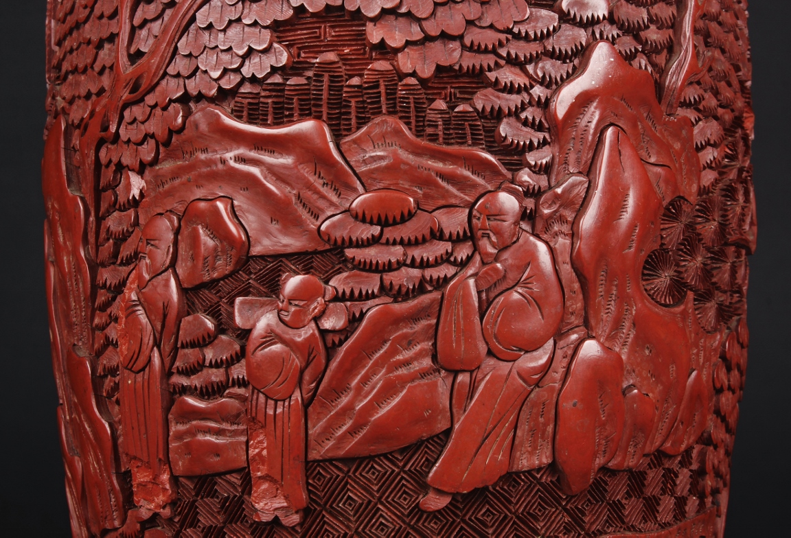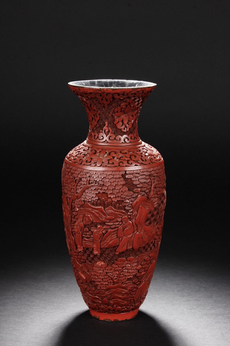 The exterior carved with scene of scholars in garden with trees and rocks, all reserved in diaper motif ground; the neck carved with scrolling flowering design. Qing Dynasty period.