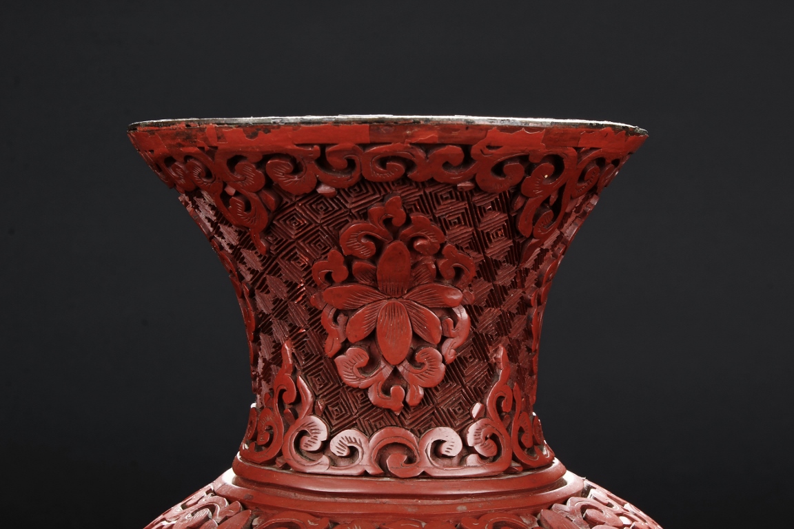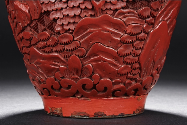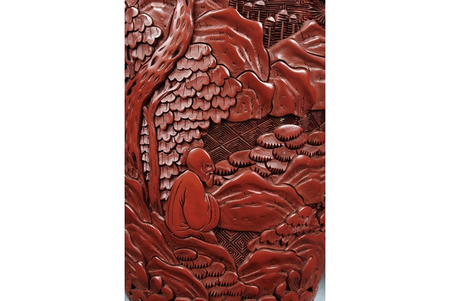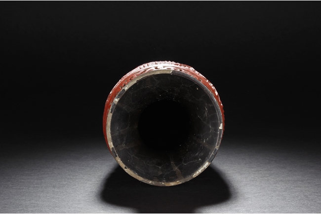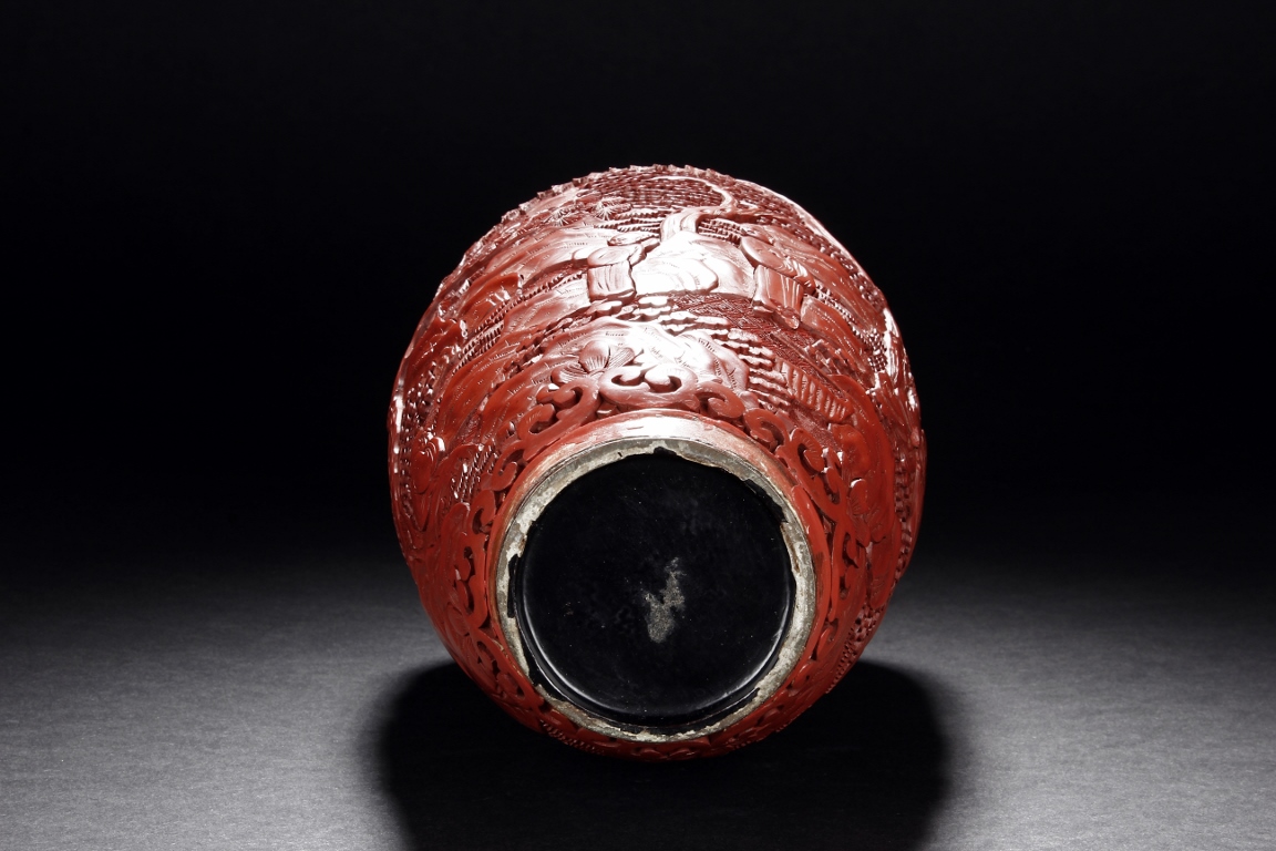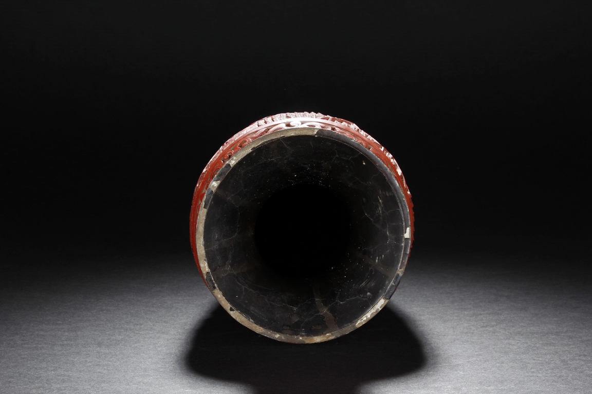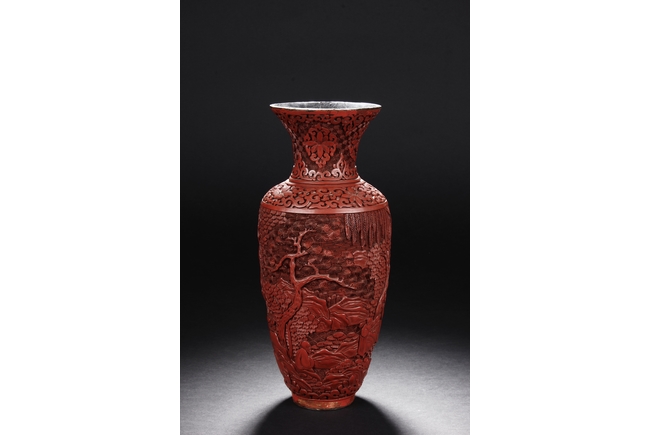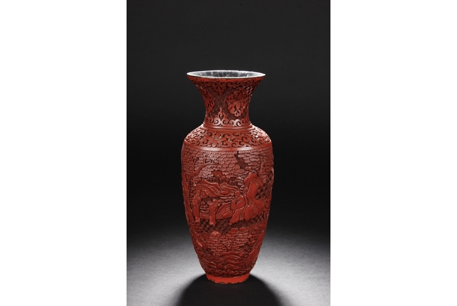 The exterior carved with scene of scholars in garden with trees and rocks, all reserved in diaper motif ground; the neck carved with scrolling flowering design. Qing Dynasty period.