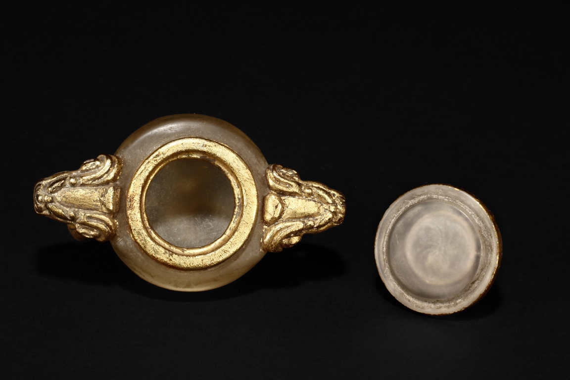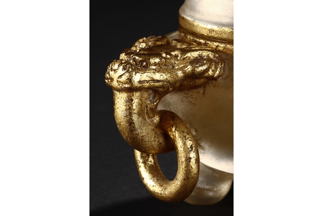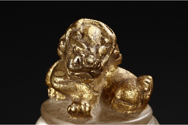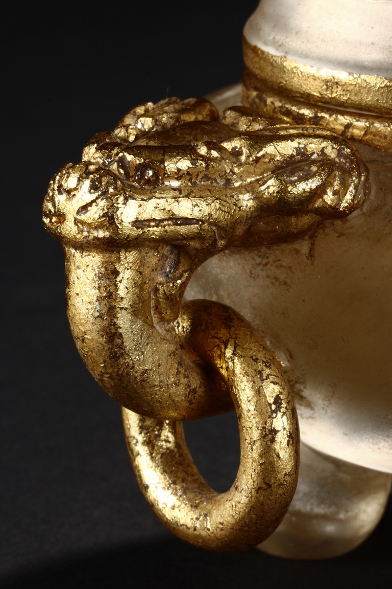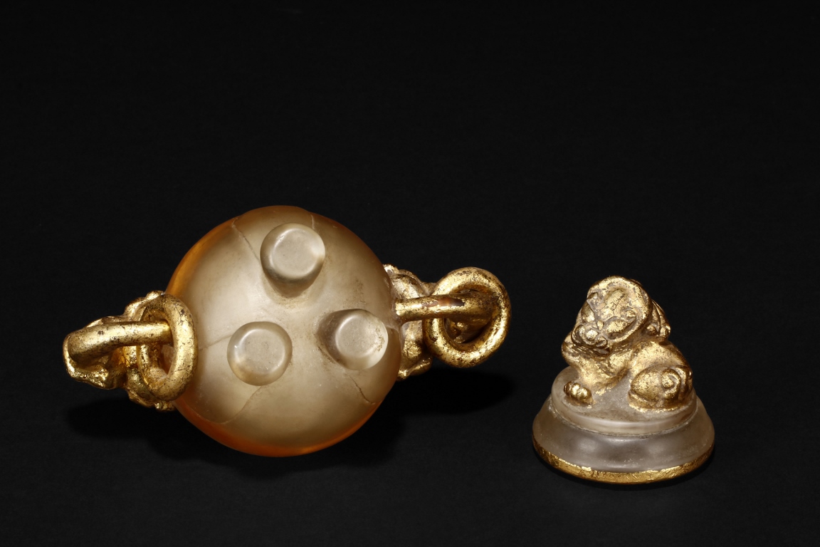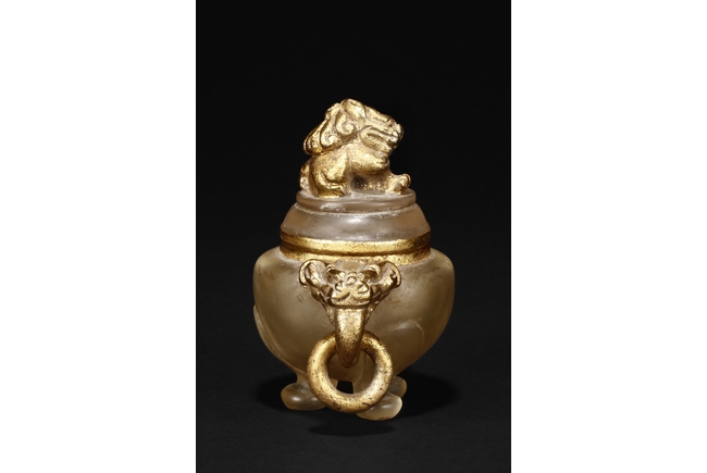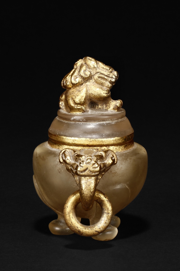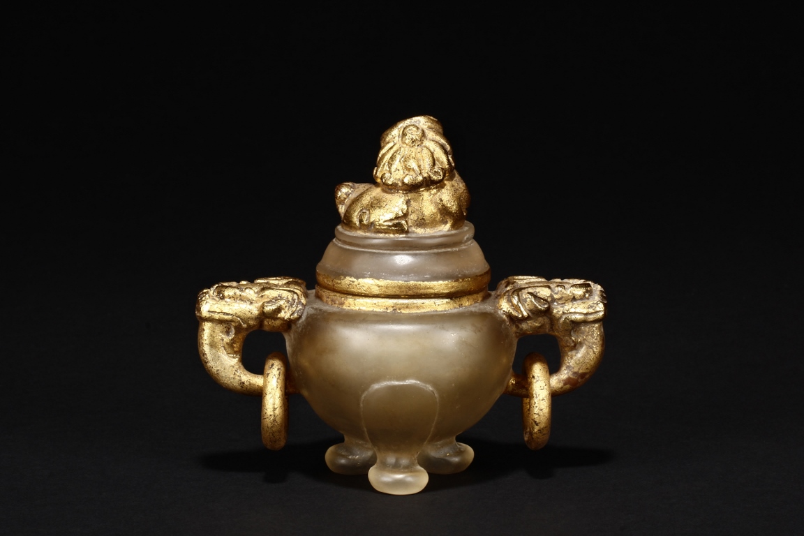 The hemispherical body is supported by three short legs spreading outwards, two lion mask handles with ring attached to the sides, and a lion cub mounted on top as finial. The handles, finial, and rims all gilt, on top of smoky colored crystal. Qing Dynasty period.