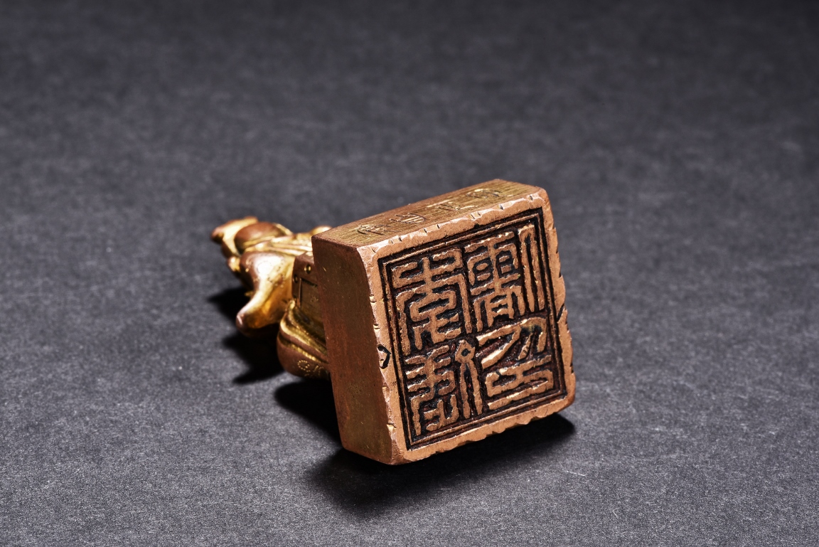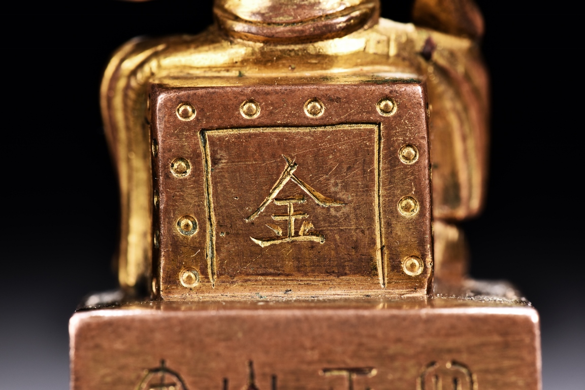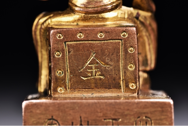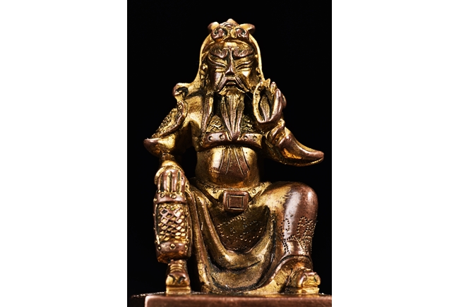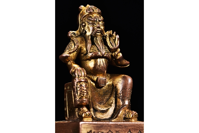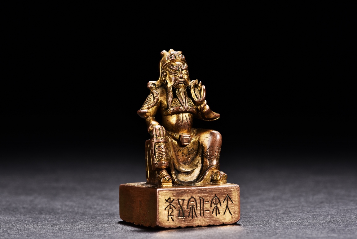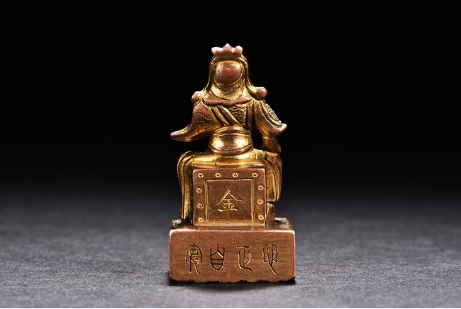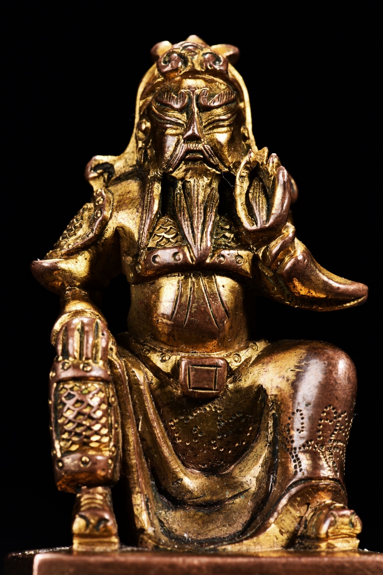 The gilt bronze seal is surmounted by a seated Guanyu wearing armour, with right hand resting on lap and left hand touching his long beard, all extremely detailed, the back of the square seat cast with a single character 'Jin'. The front cast with five characters 'Da Song Ren Zong Wu Nian'. The reverse cast with four characters 'Xin Zheng Zi Guan' in seal script.