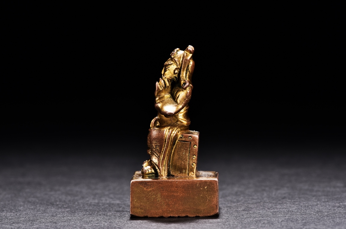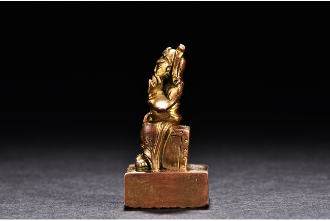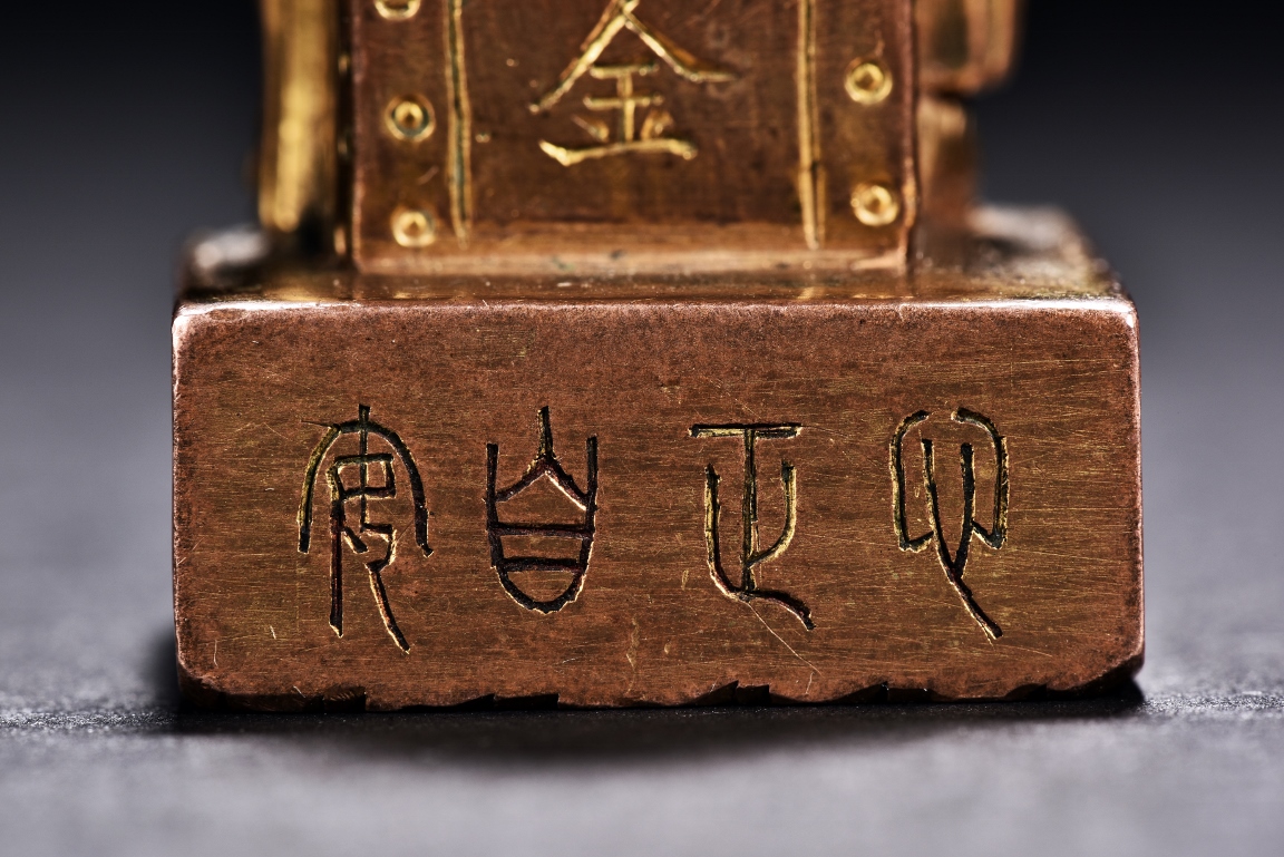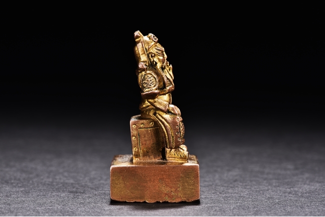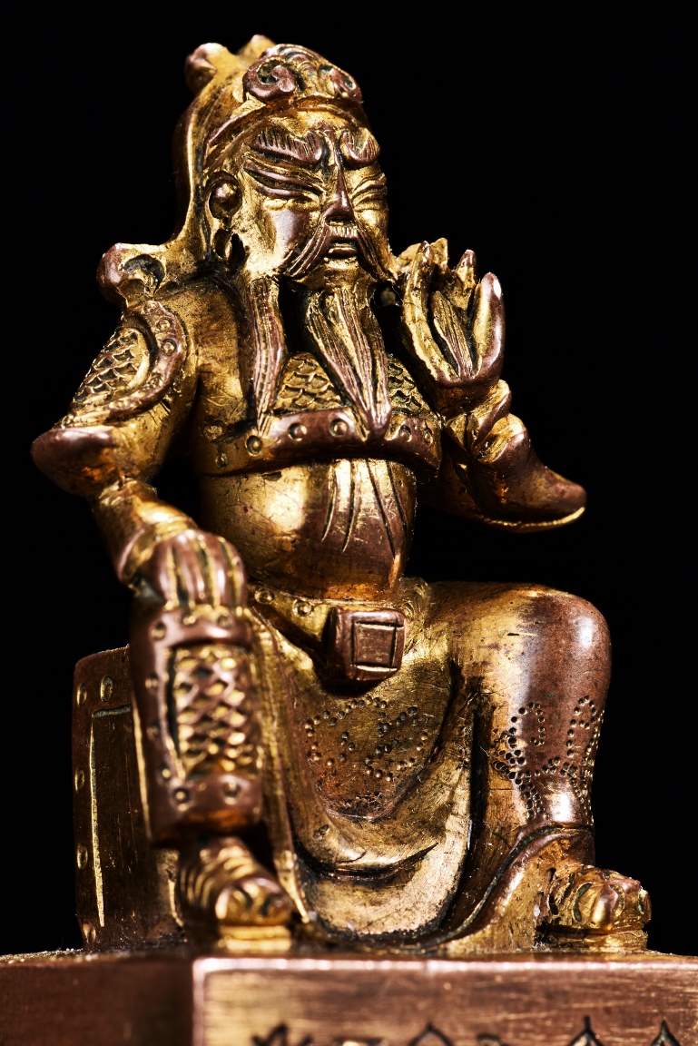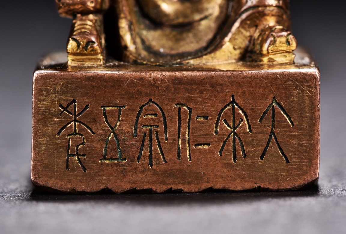 The gilt bronze seal is surmounted by a seated Guanyu wearing armour, with right hand resting on lap and left hand touching his long beard, all extremely detailed, the back of the square seat cast with a single character 'Jin'. The front cast with five characters 'Da Song Ren Zong Wu Nian'. The reverse cast with four characters 'Xin Zheng Zi Guan' in seal script.