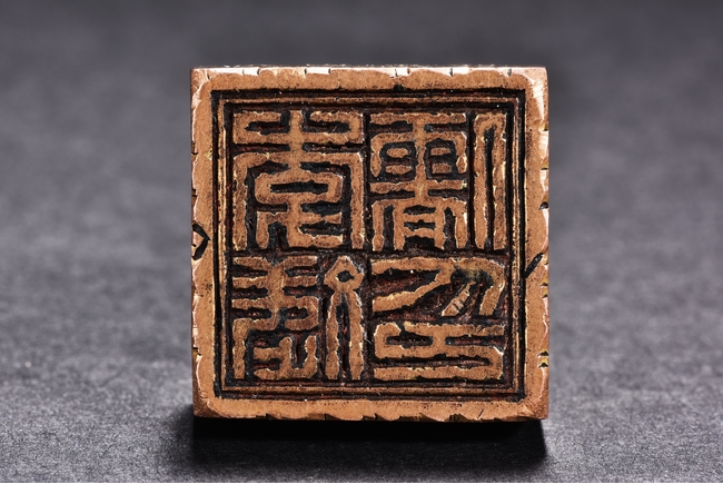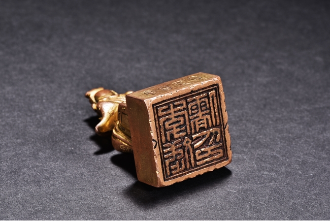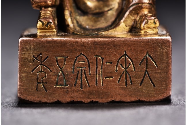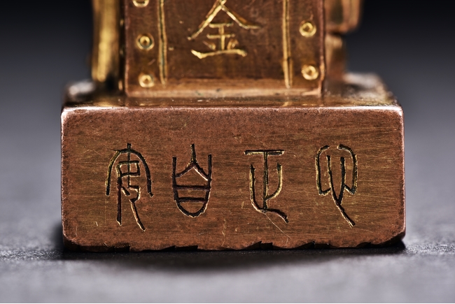 此件銅鎏金印章保存完整,人物雕刻細膩,表情栩栩如生,關公左手捂須,鬍鬚刻畫之細膩,清晰可見,應屬古代銅印鈕中之精品。印章正面刻有“大宋仁宗五年”篆體字,背刻''心正自官'’四字篆體字。