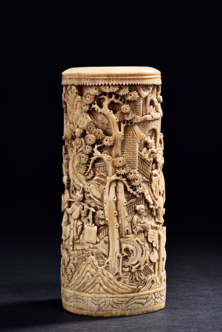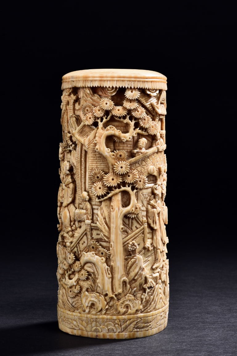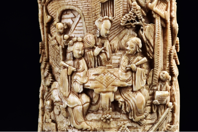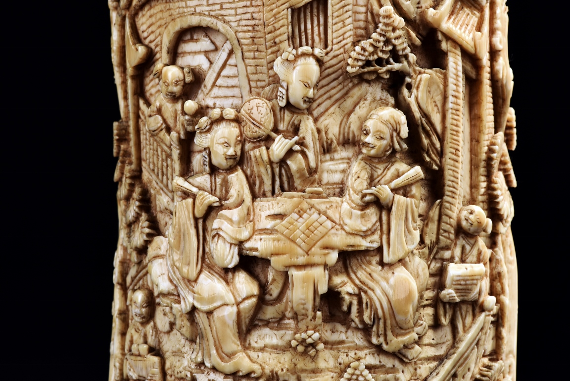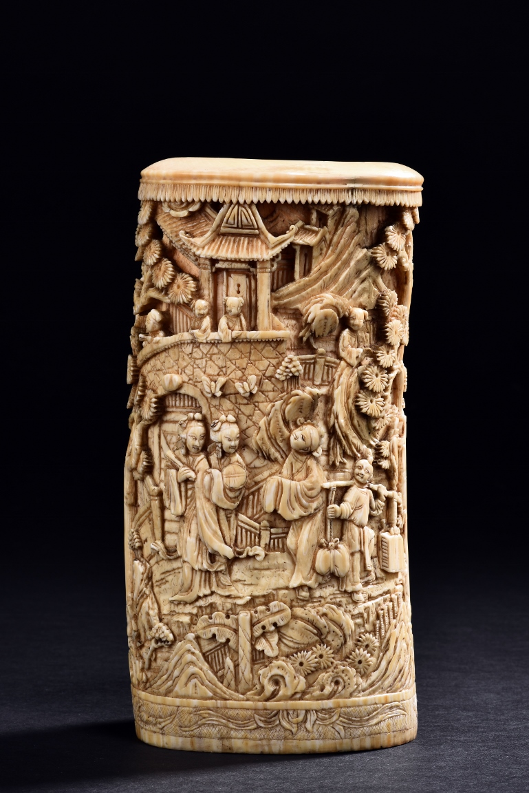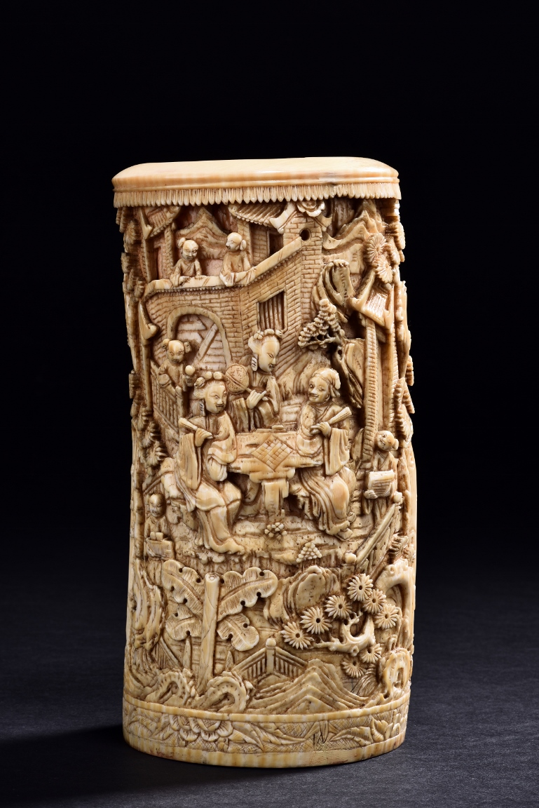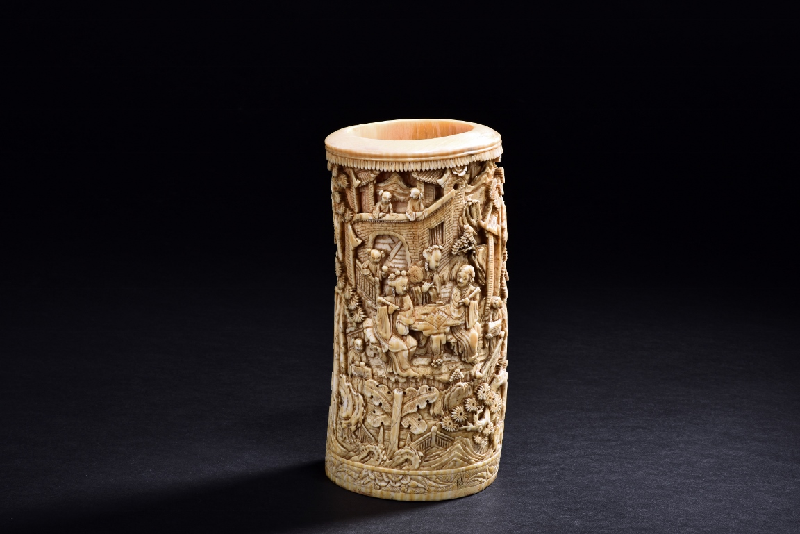 The brushpot is delicately carved in continous scene of various figures gathering in a garden and a gentleman conversing with two ladies in relief, along with pavillions, pine trees, surrounded by a floral band below and a leave band above.