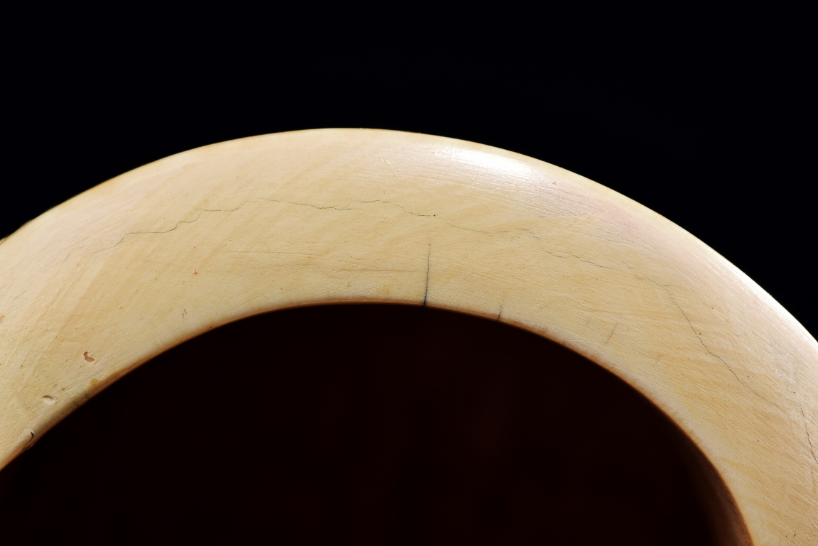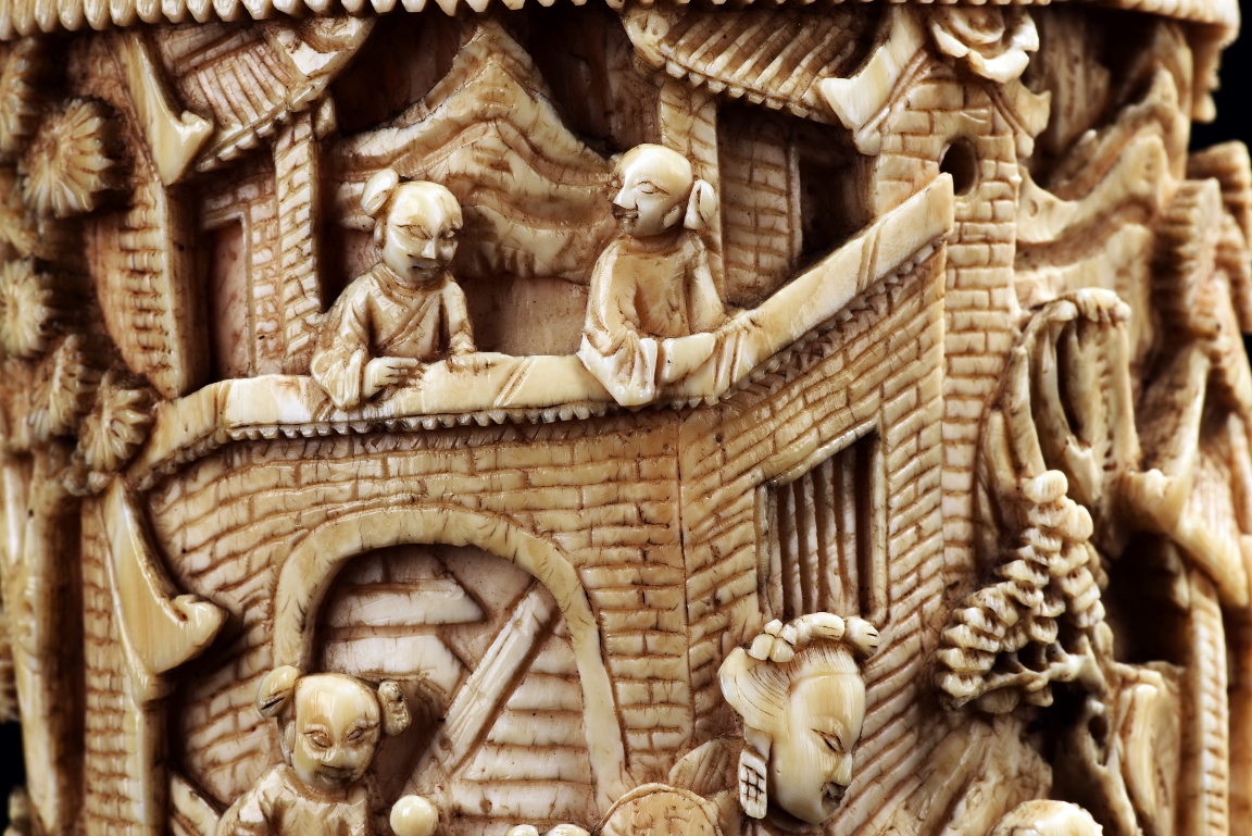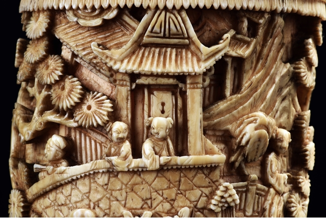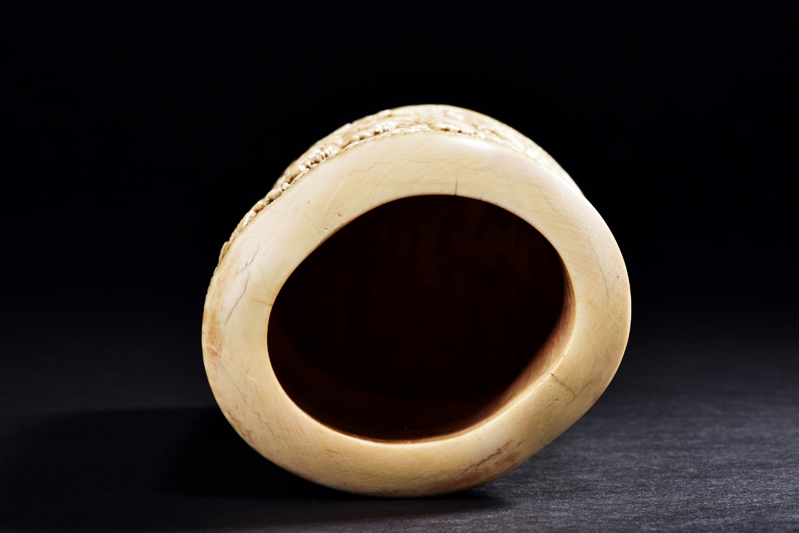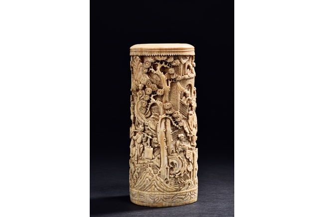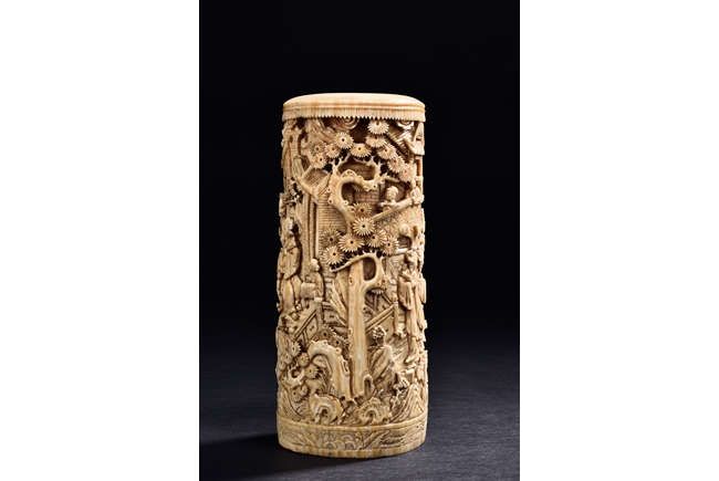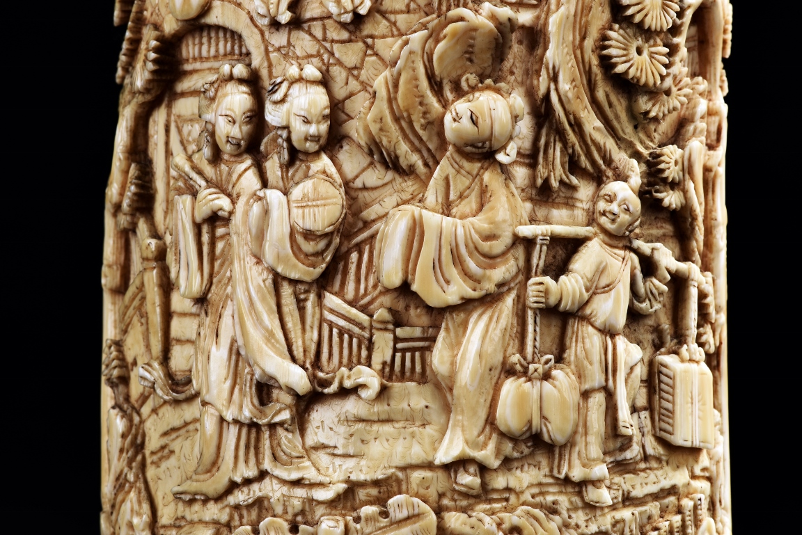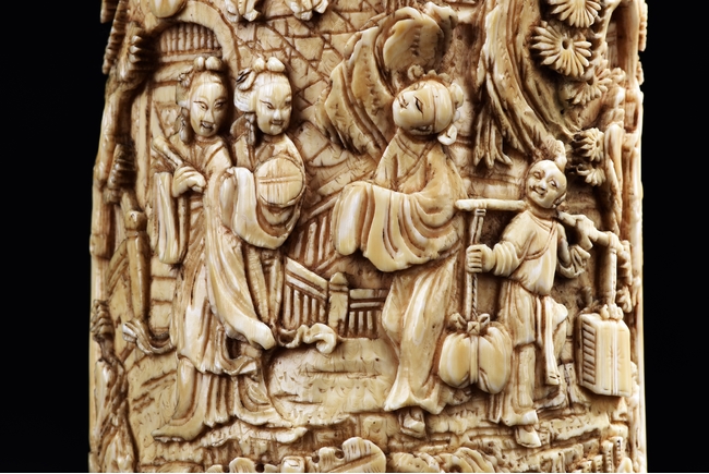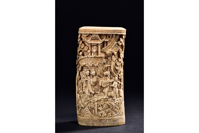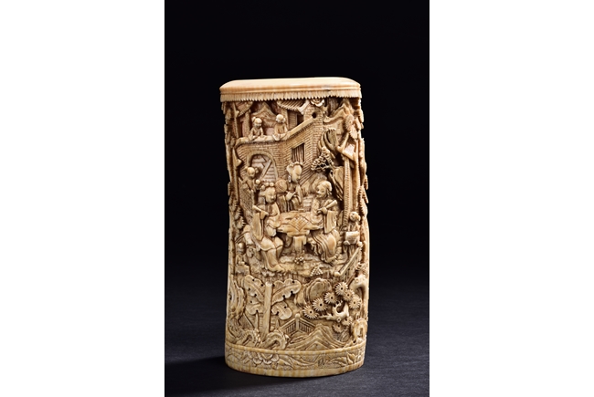 The brushpot is delicately carved in continous scene of various figures gathering in a garden and a gentleman conversing with two ladies in relief, along with pavillions, pine trees, surrounded by a floral band below and a leave band above.