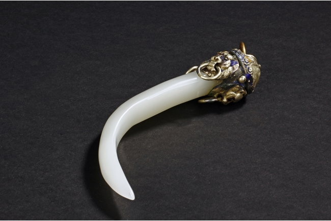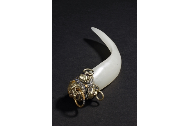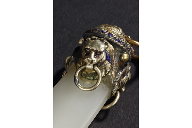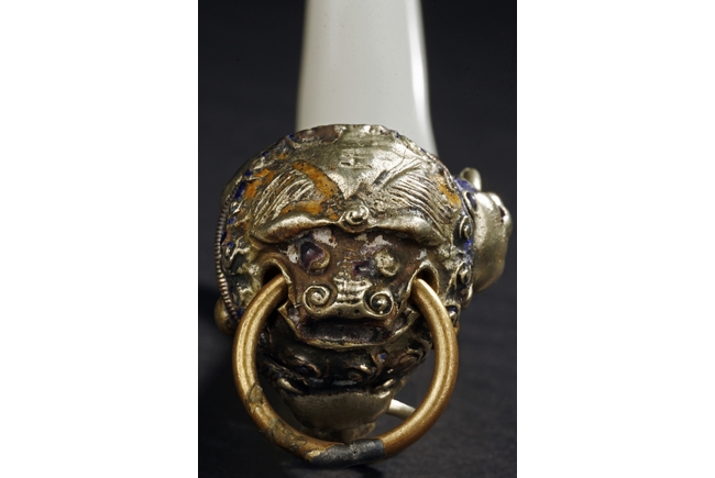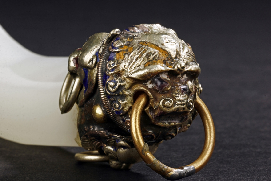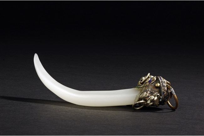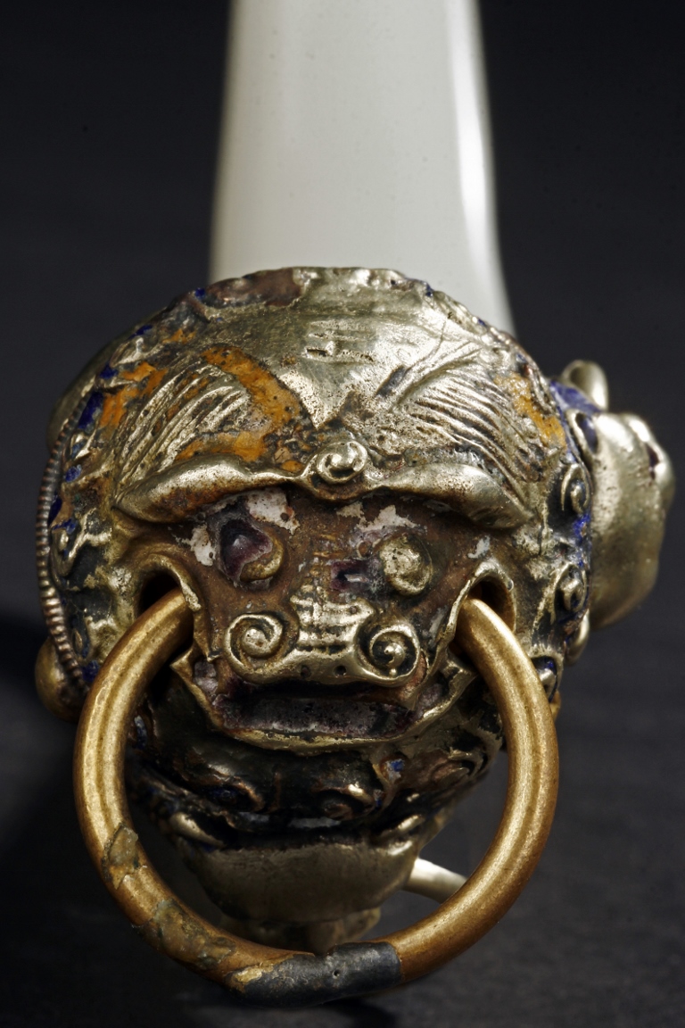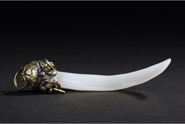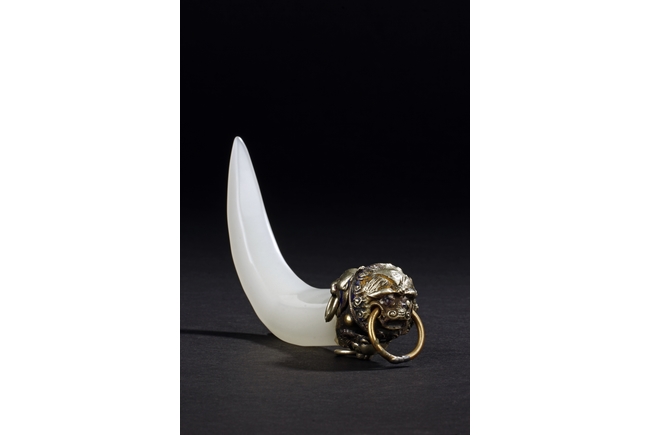 The white jade model is carved in the shape of a arched tusk, the handle is carved with bronze mythical beast mask with loose rings.