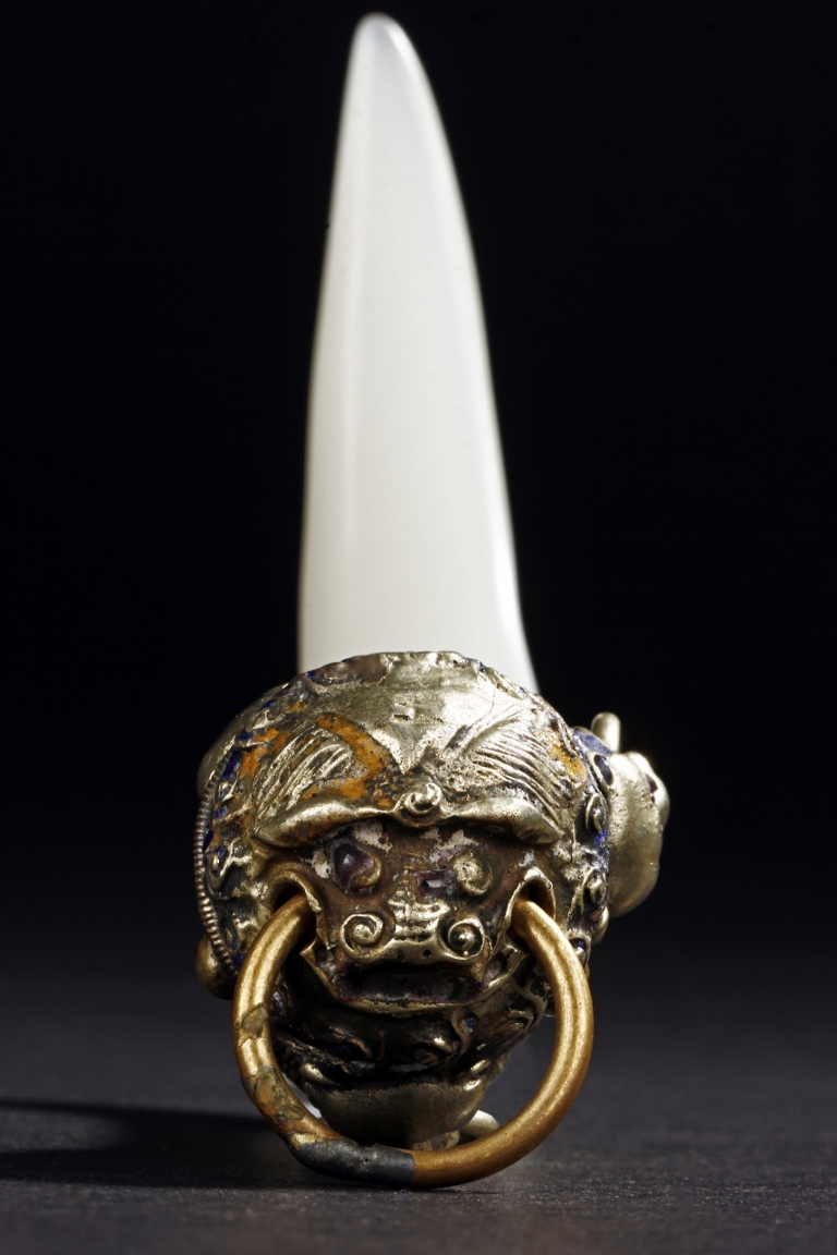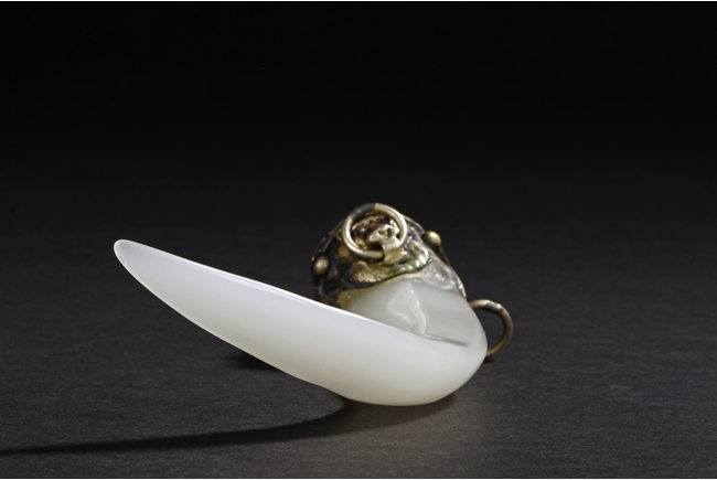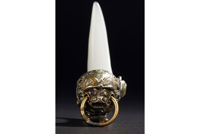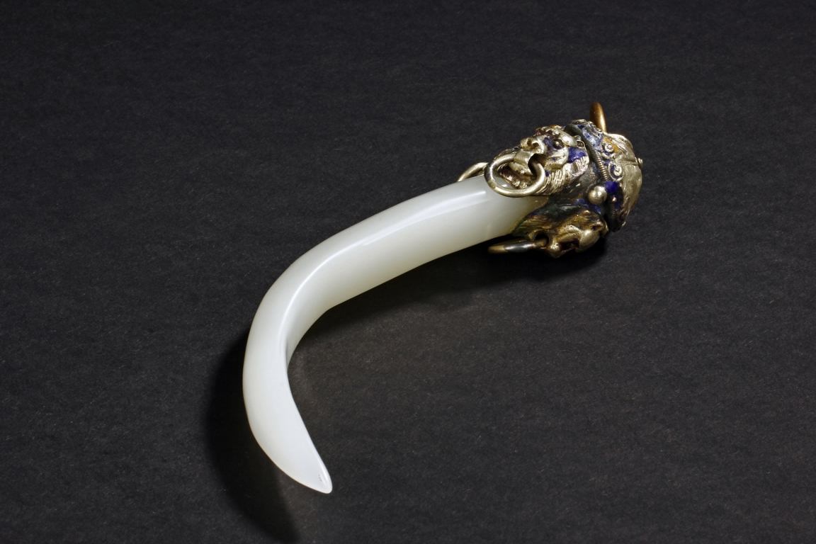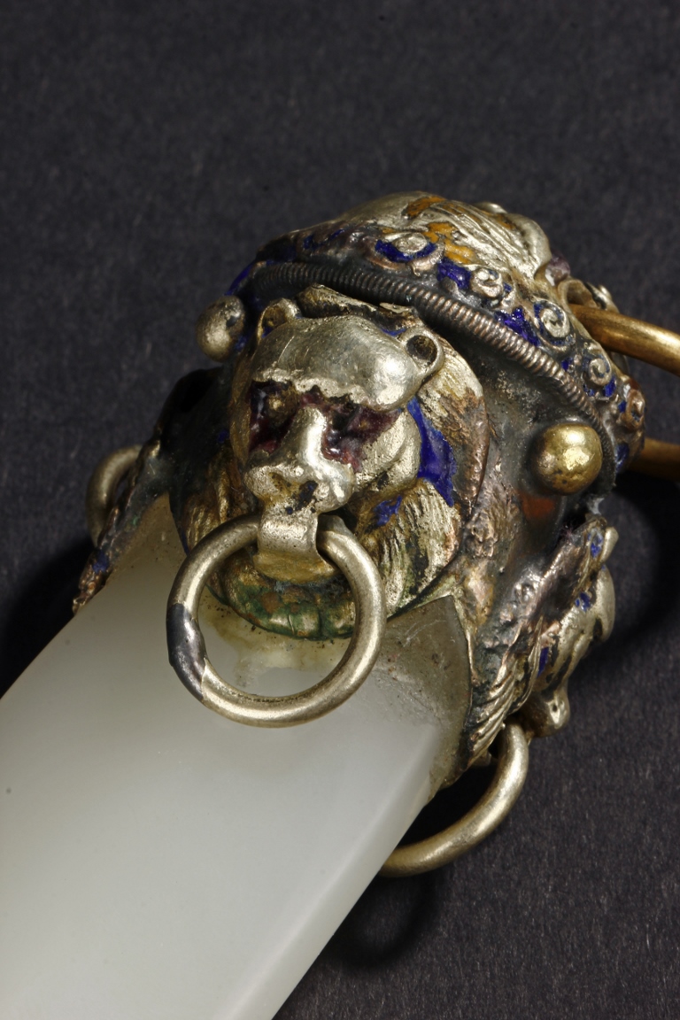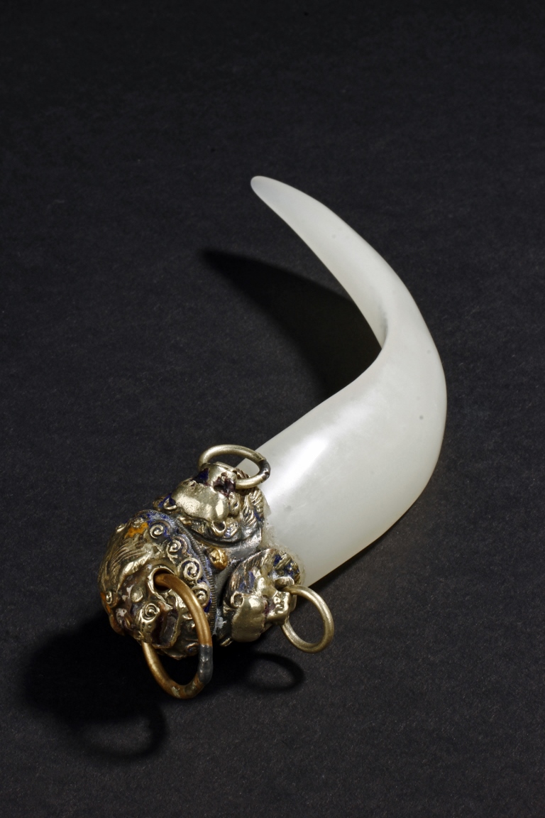 The white jade model is carved in the shape of a arched tusk, the handle is carved with bronze mythical beast mask with loose rings.