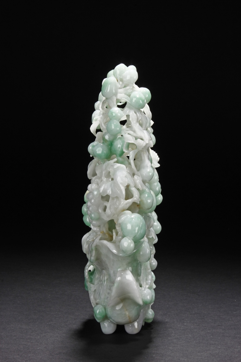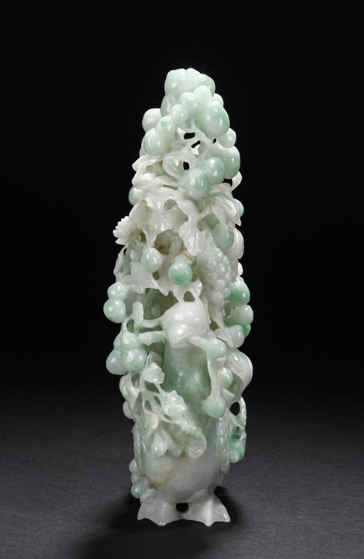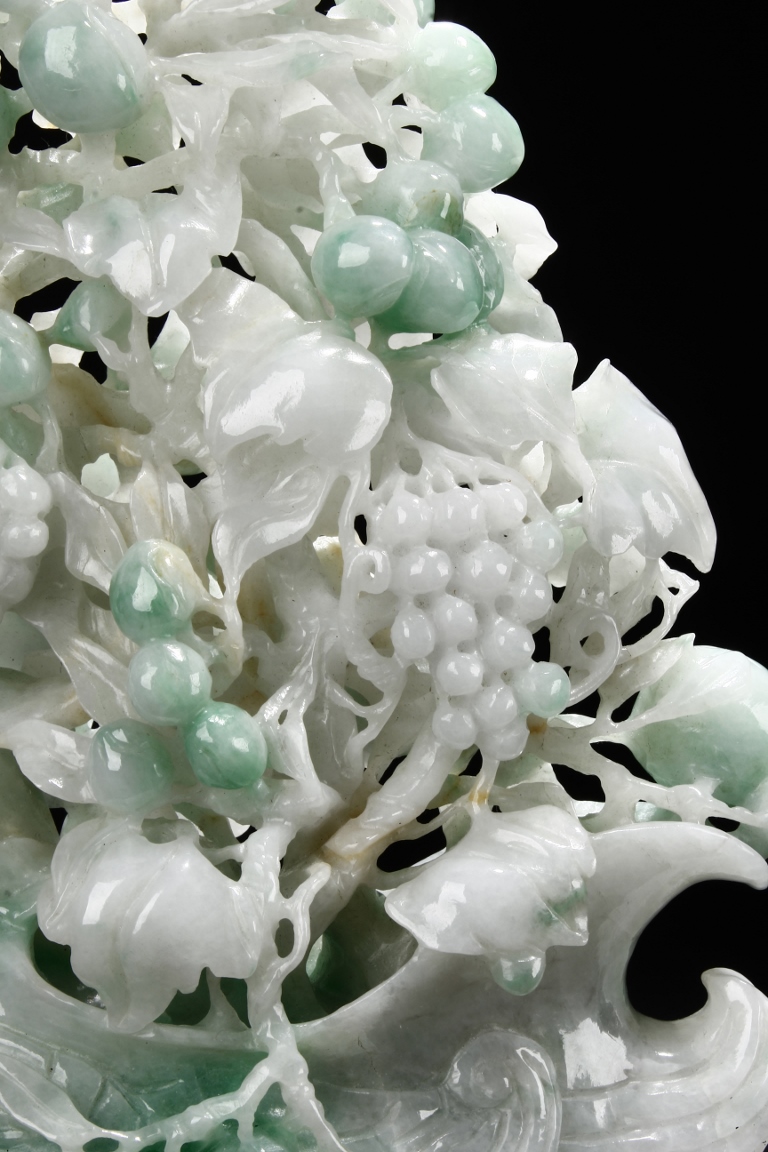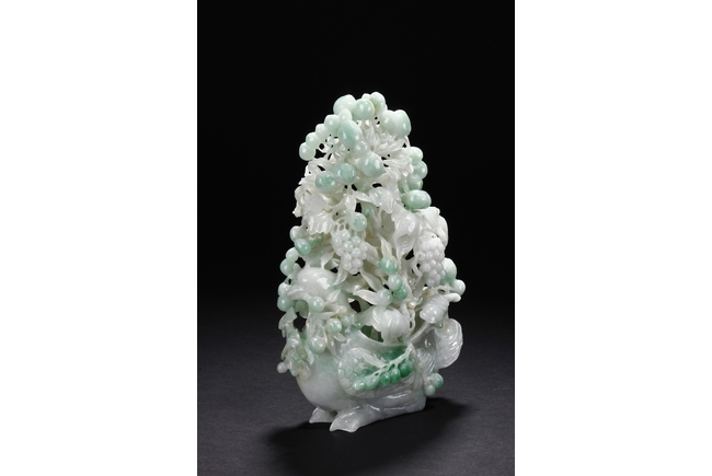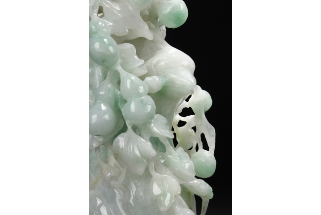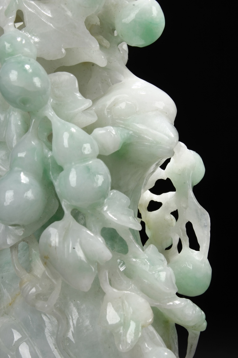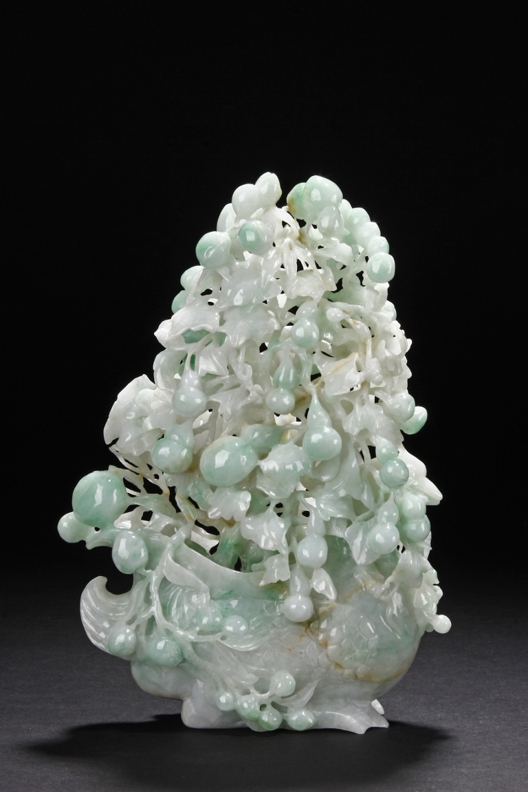 The jadeite boulder is carved and pierced with a seated magpie carrying on the back with blossoming peaches and double gourds on either side. The stone is of white-greenish tone.