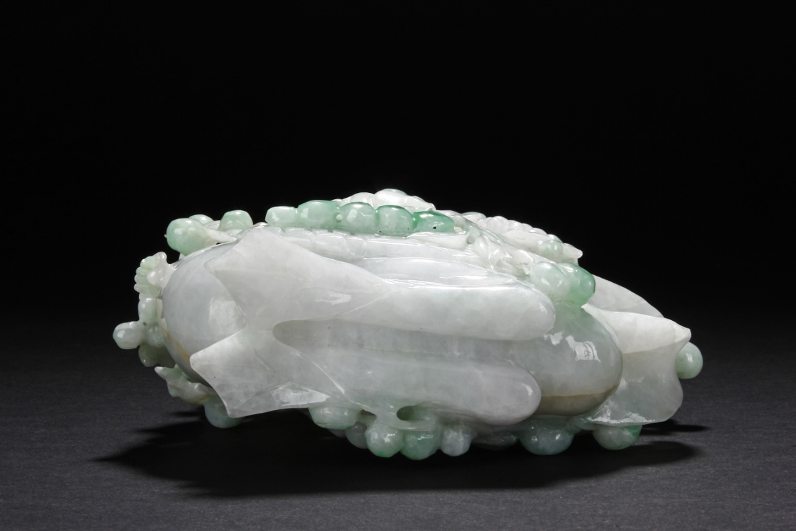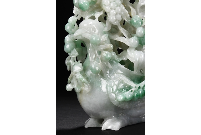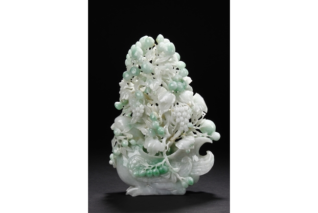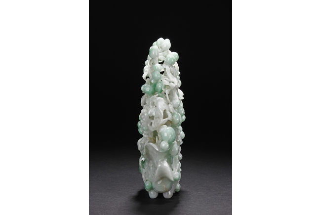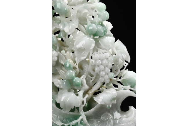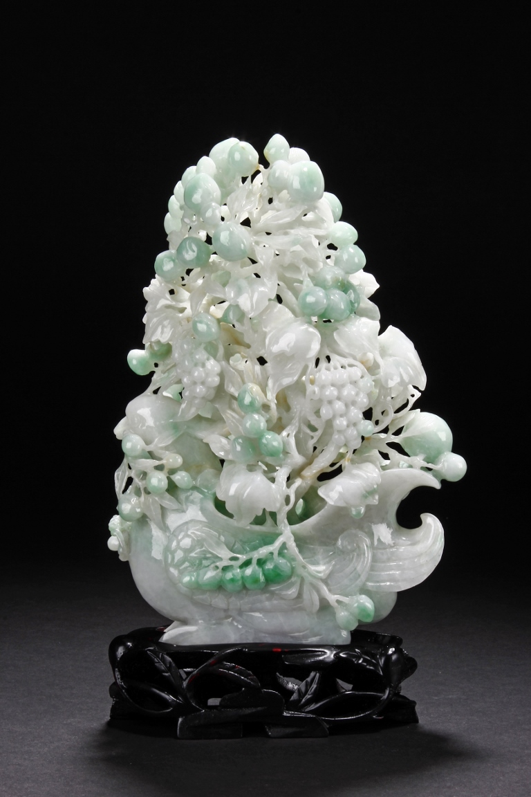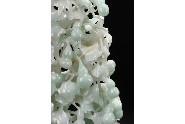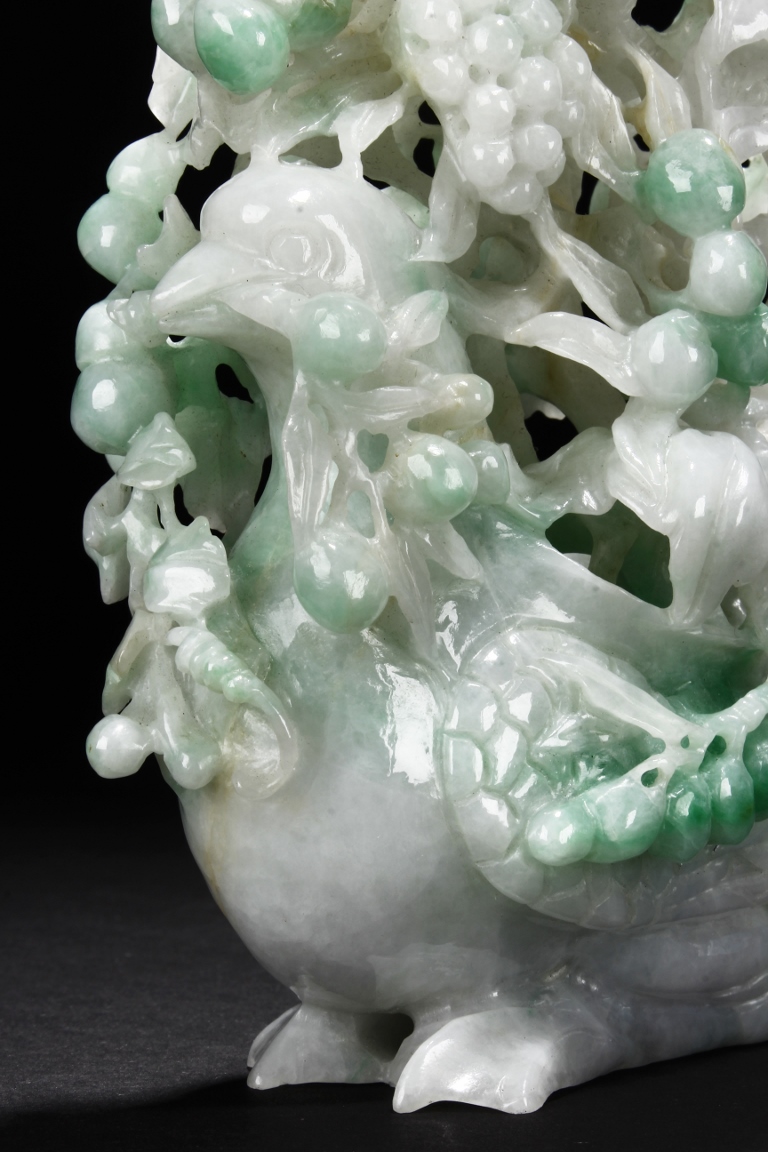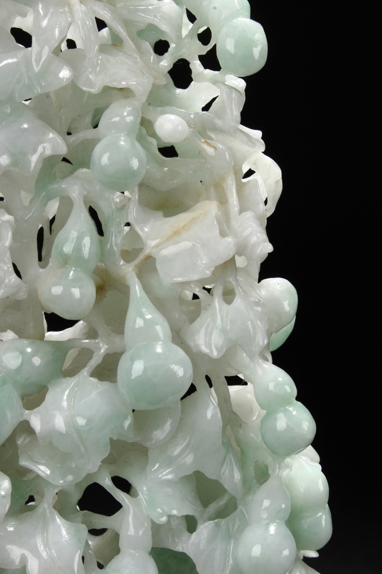 The jadeite boulder is carved and pierced with a seated magpie carrying on the back with blossoming peaches and double gourds on either side. The stone is of white-greenish tone.