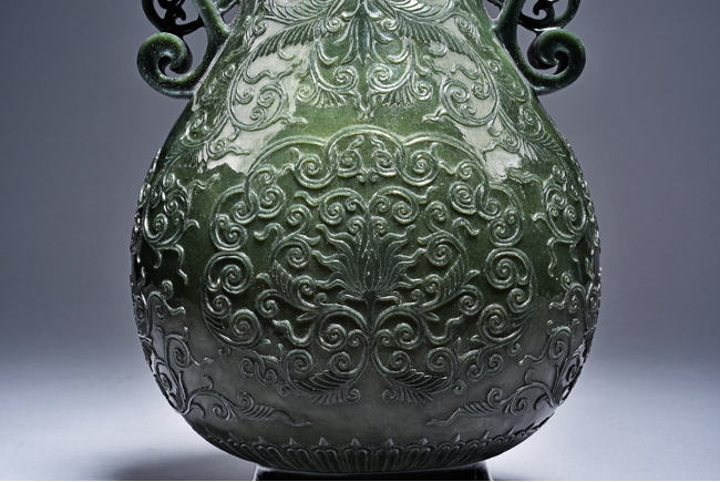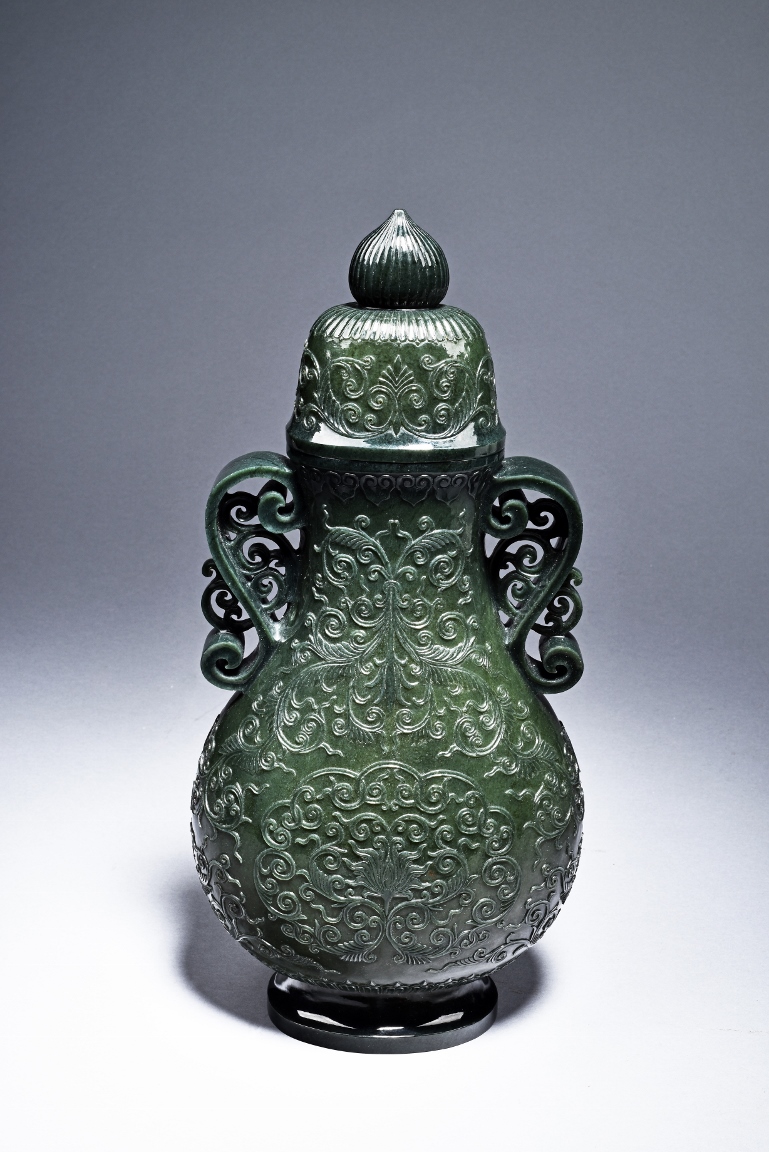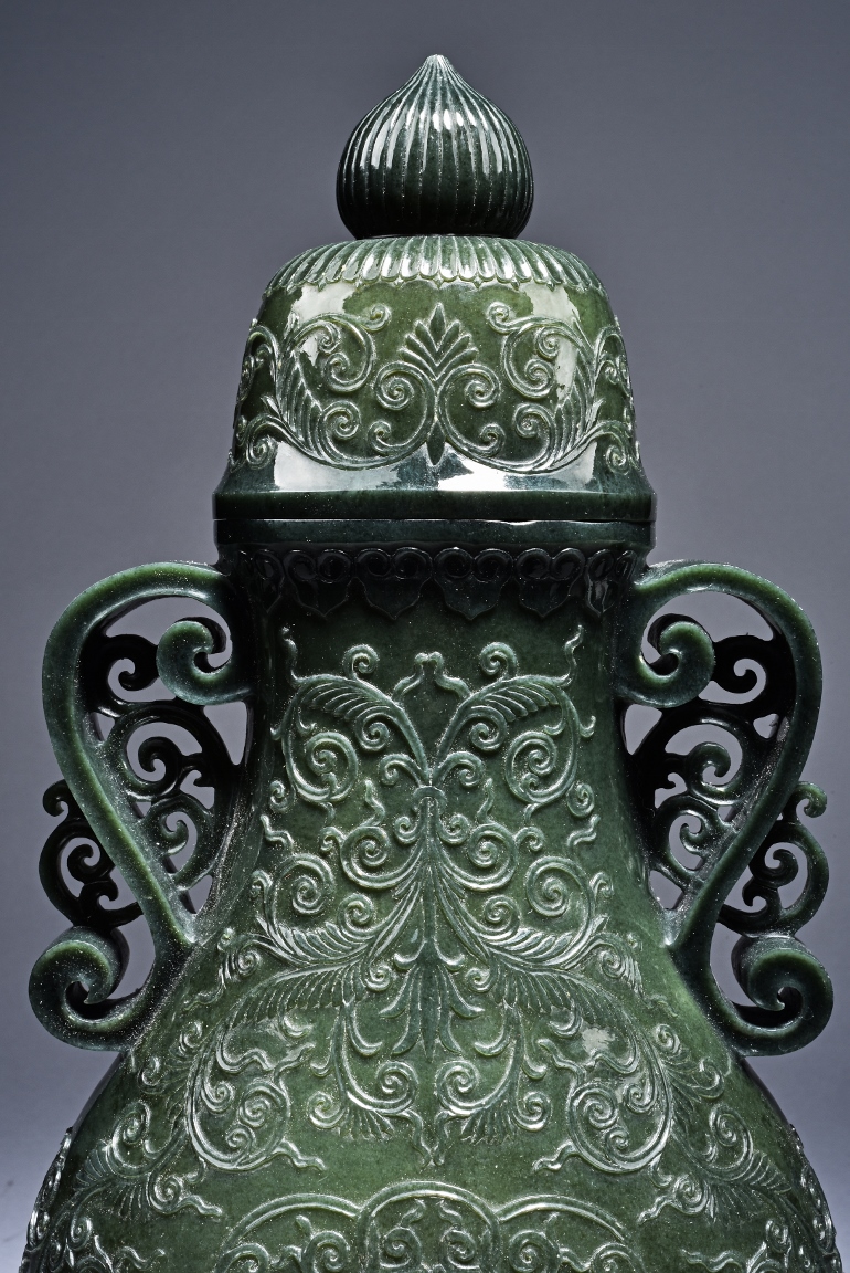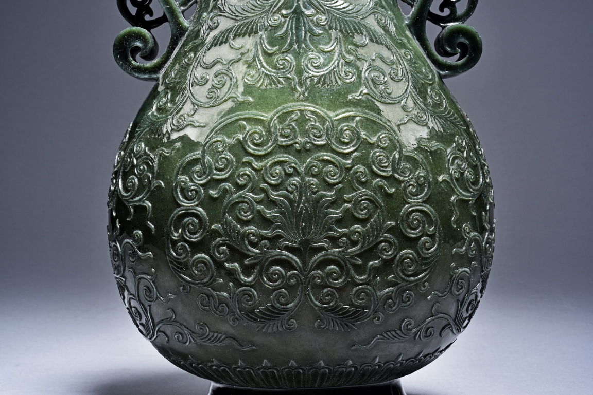 Of elegant hu form and supported on a high splayed stand, the body delicately carved in low relief with scrolling foliage, the handles pierced with scrolling openworks, the finial in the form of chrysanthemum lobes. The stone is of spinach green translucent tone. Late Qing Dynasty period.