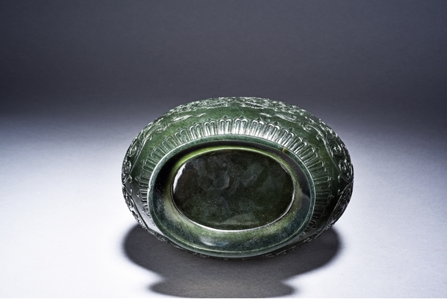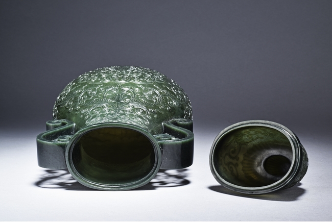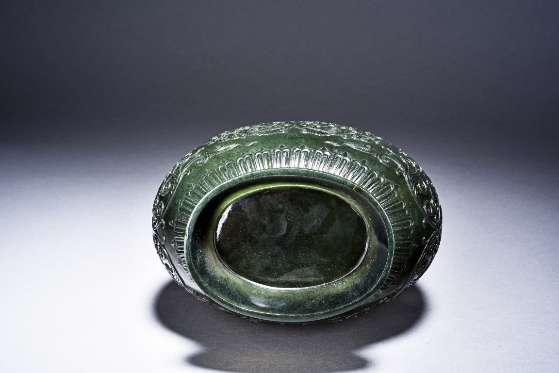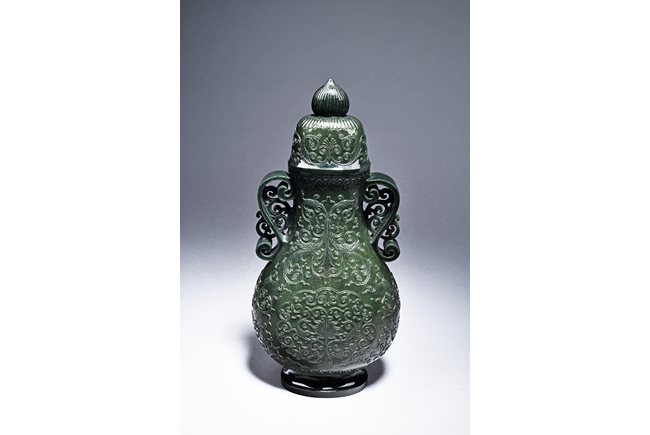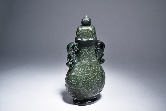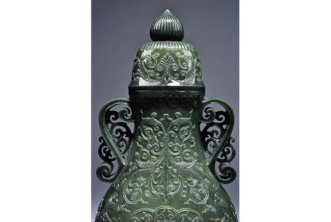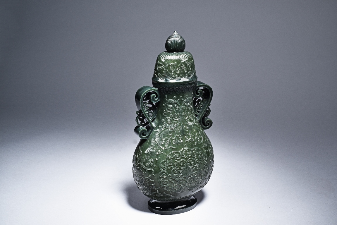 Of elegant hu form and supported on a high splayed stand, the body delicately carved in low relief with scrolling foliage, the handles pierced with scrolling openworks, the finial in the form of chrysanthemum lobes. The stone is of spinach green translucent tone. Late Qing Dynasty period.