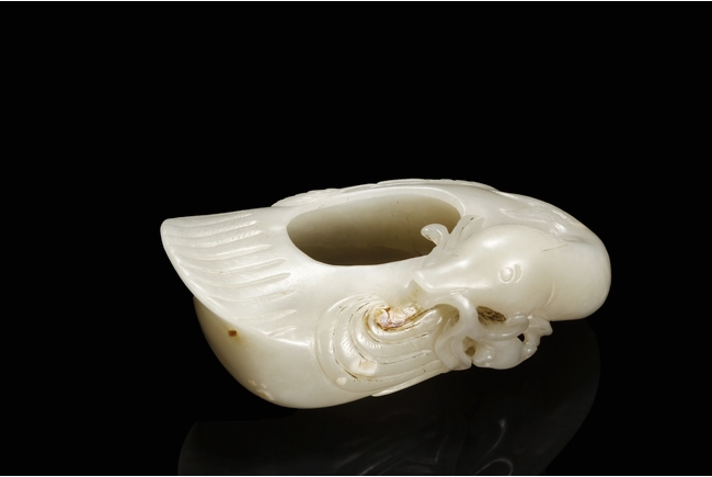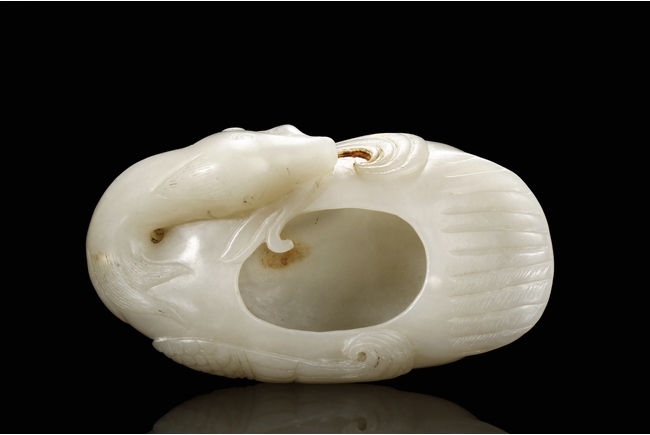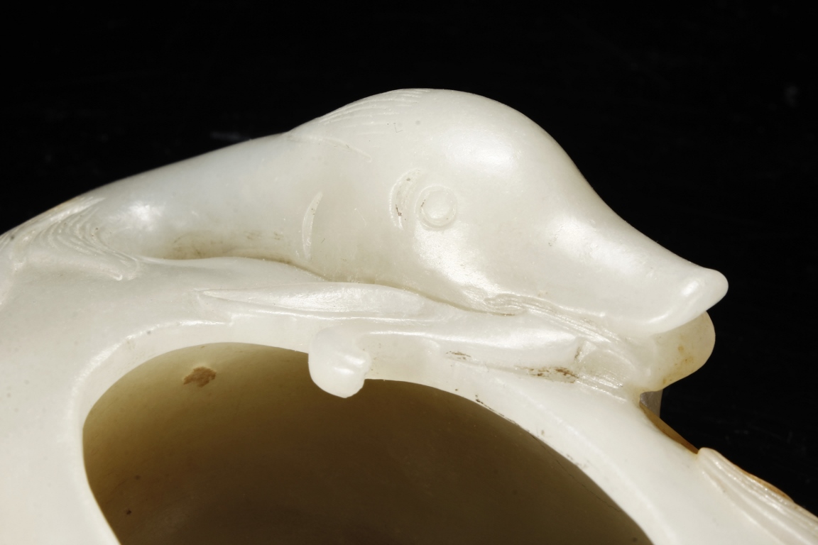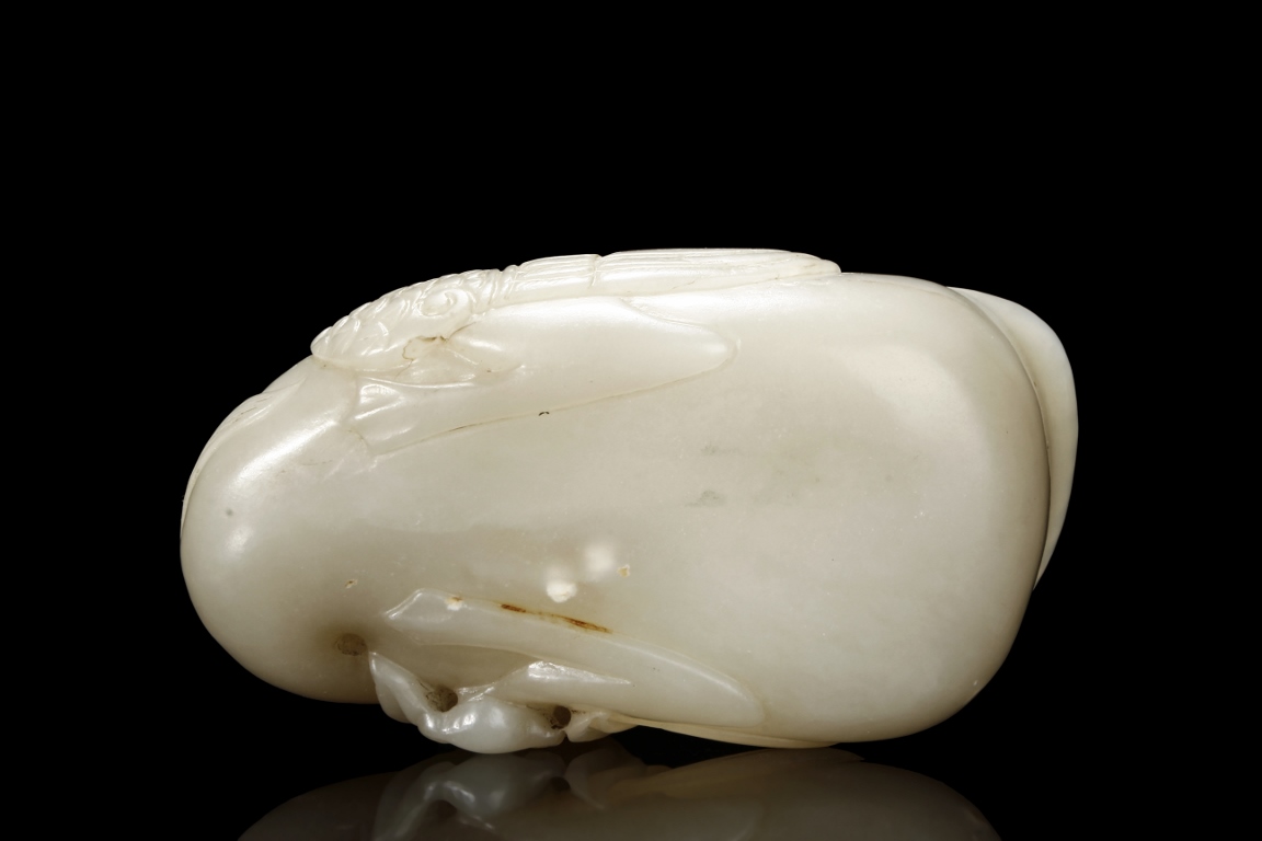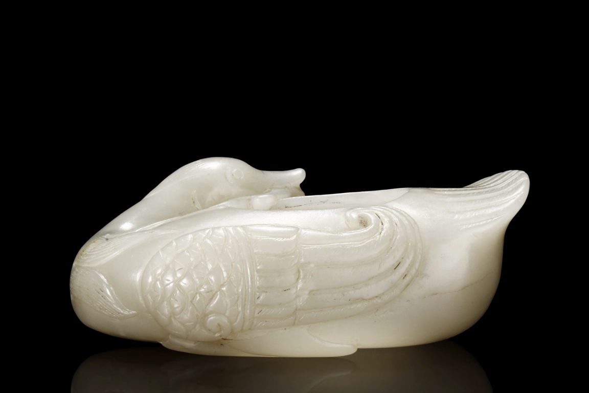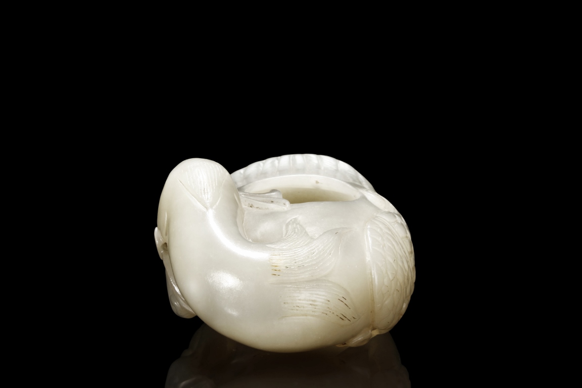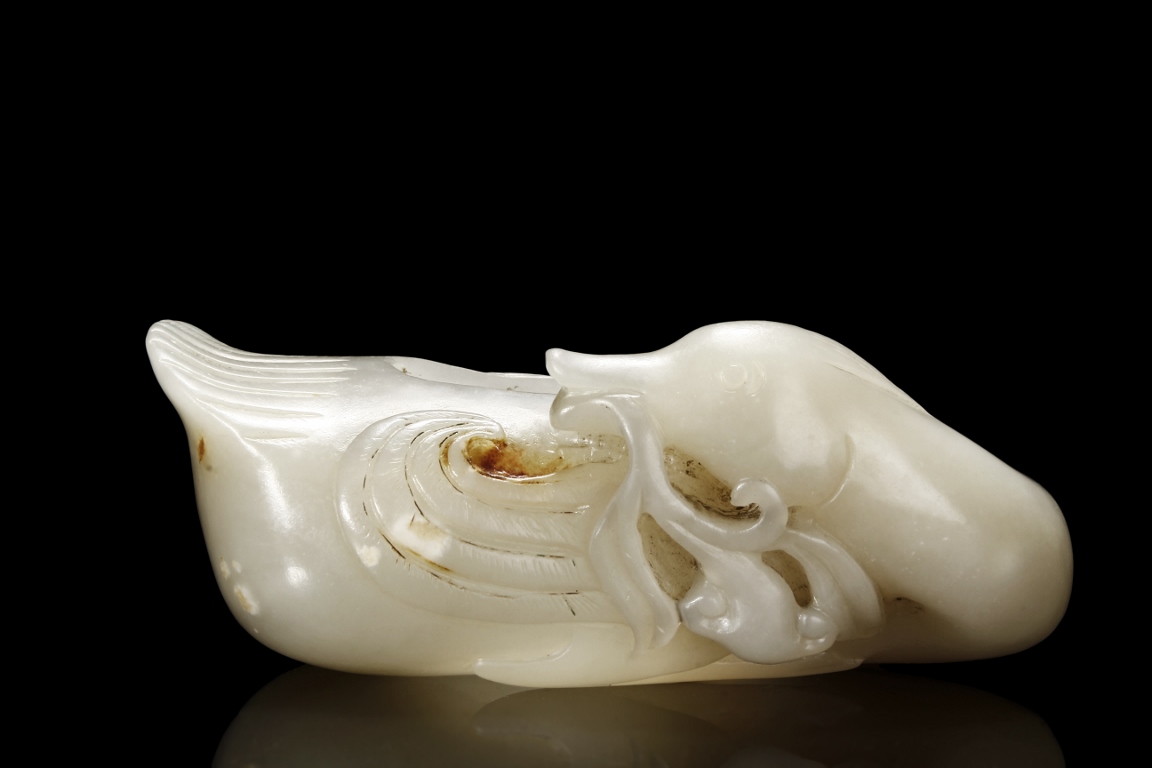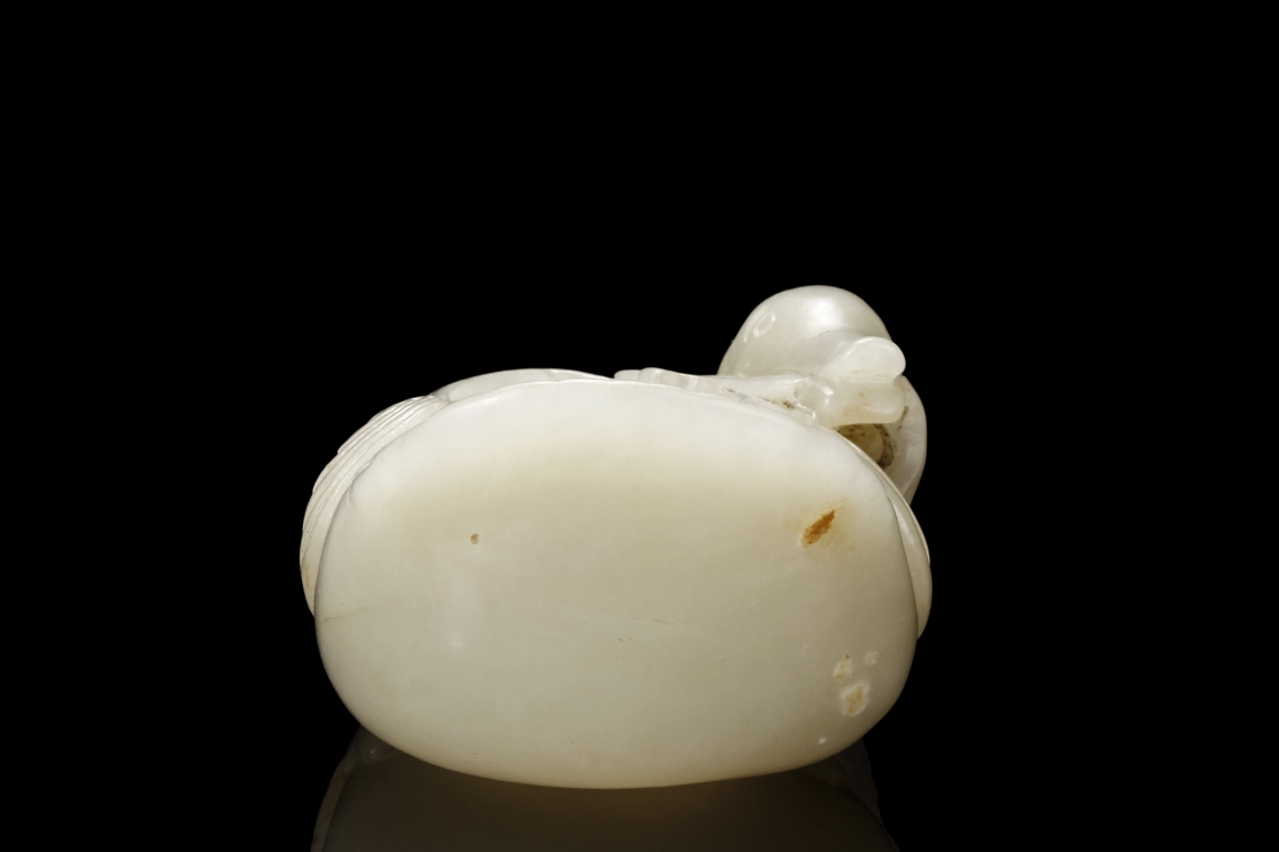 Modelled in the form of duck grasping a branch of millet in its bill, the feathers incised with lines, the stone is of white tone with russet inclusions. Qing Dynasty period.