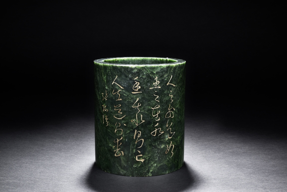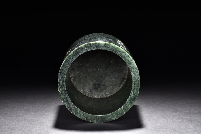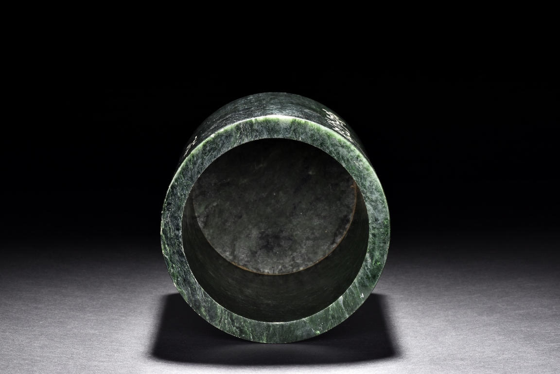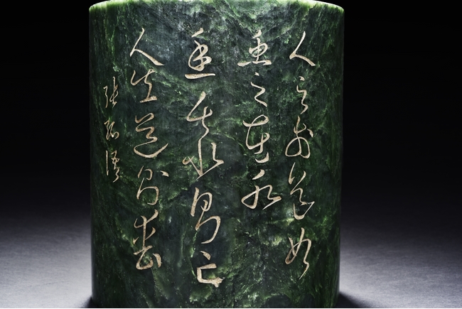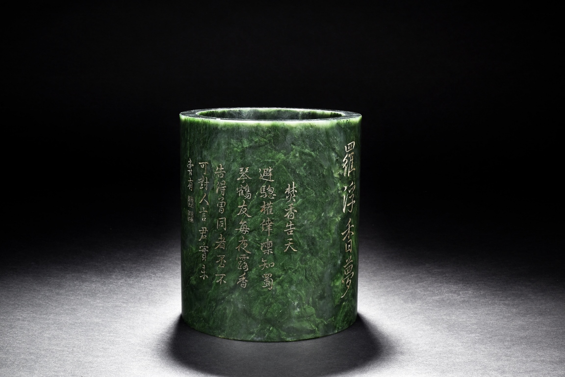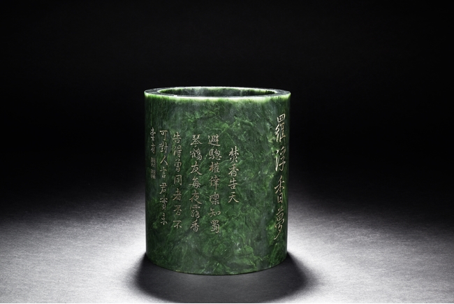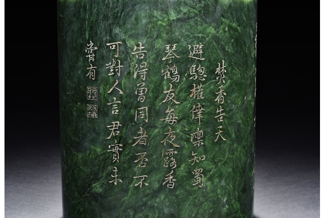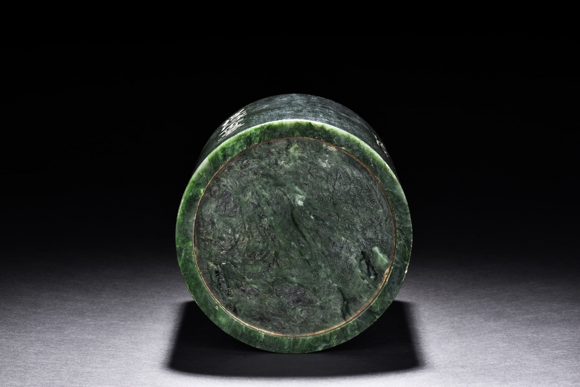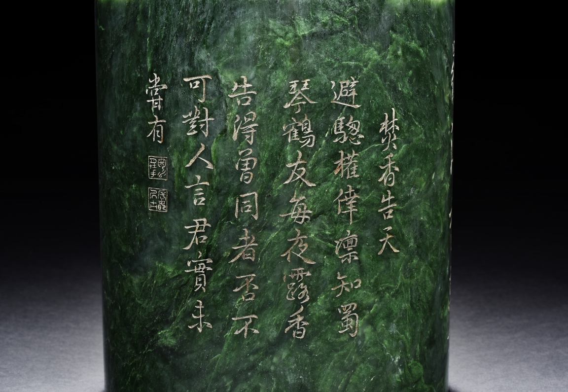 Of circular section, the spinach jade brushpot is incised with poems in semi-cursive form and seal marks to the exterior. The stone is of translucent spinach green tone.