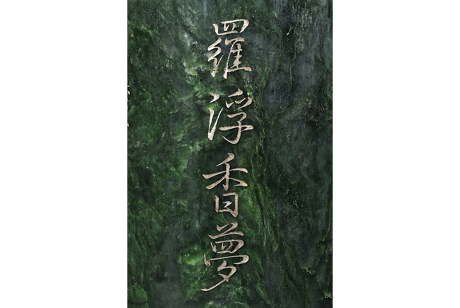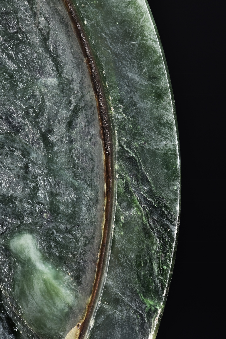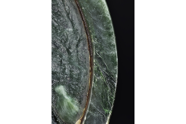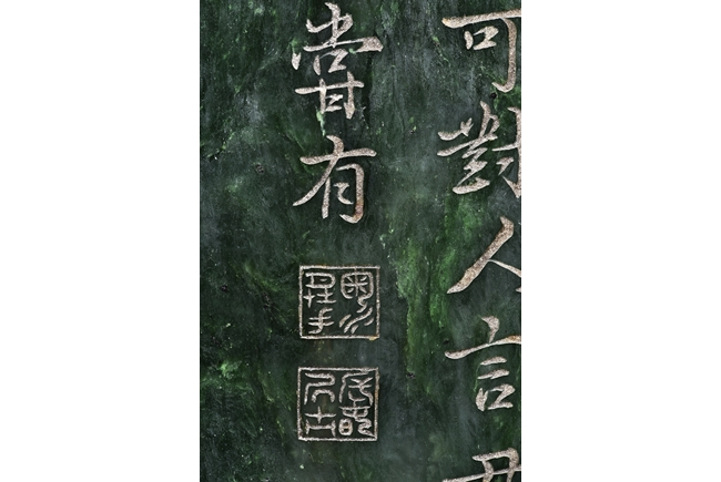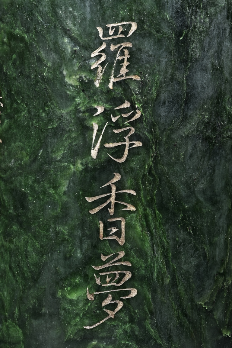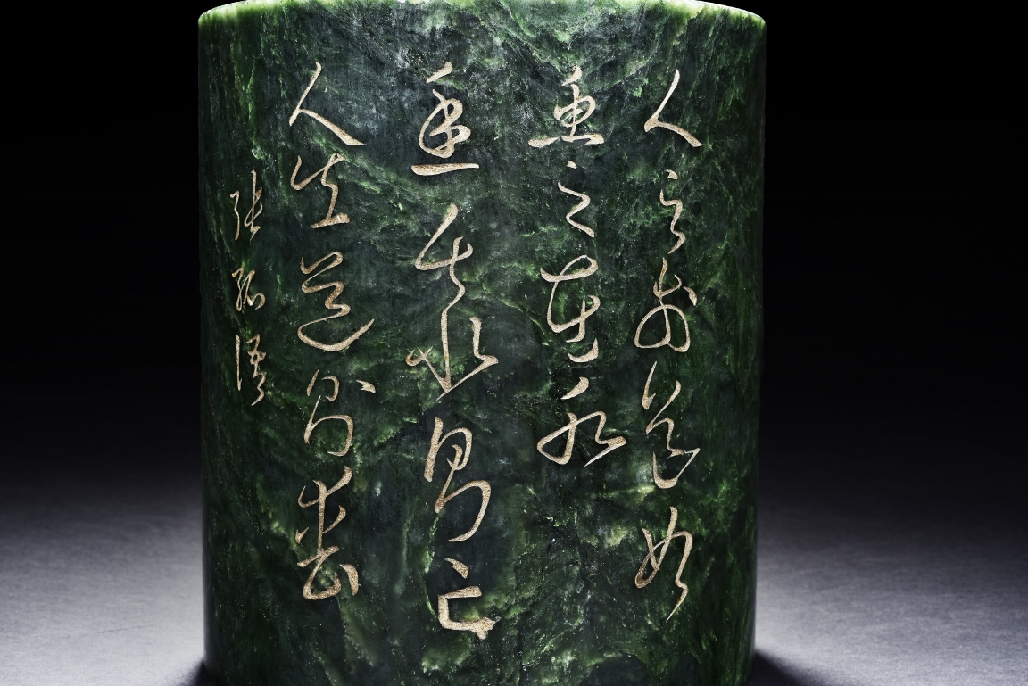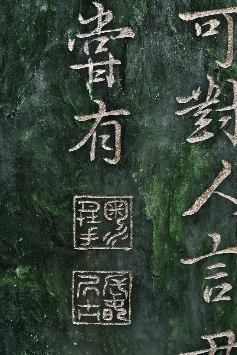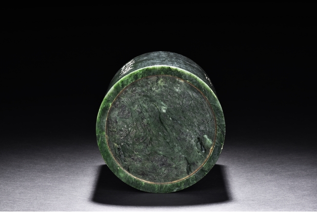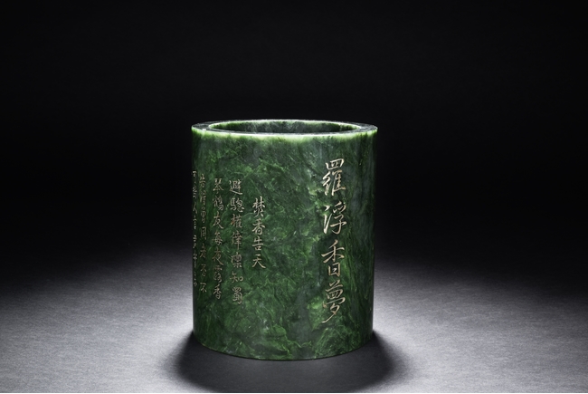 Of circular section, the spinach jade brushpot is incised with poems in semi-cursive form and seal marks to the exterior. The stone is of translucent spinach green tone.