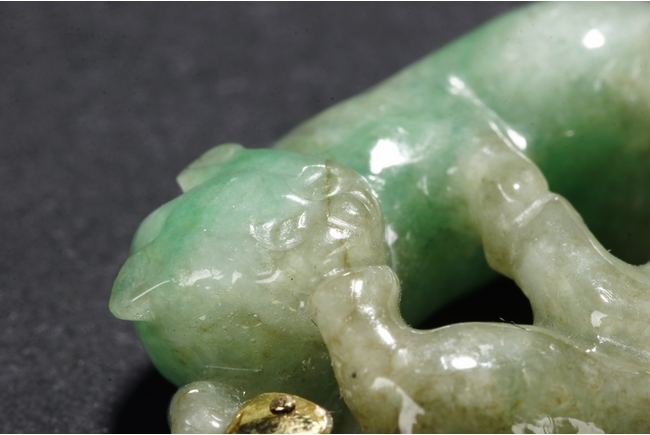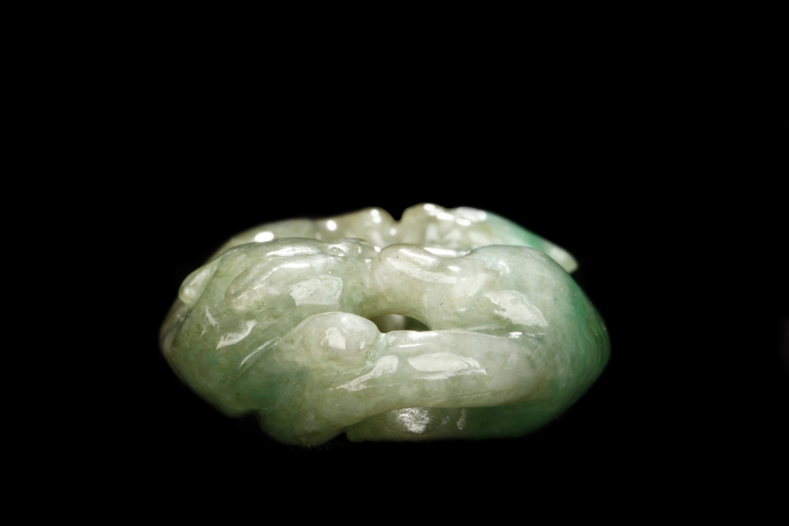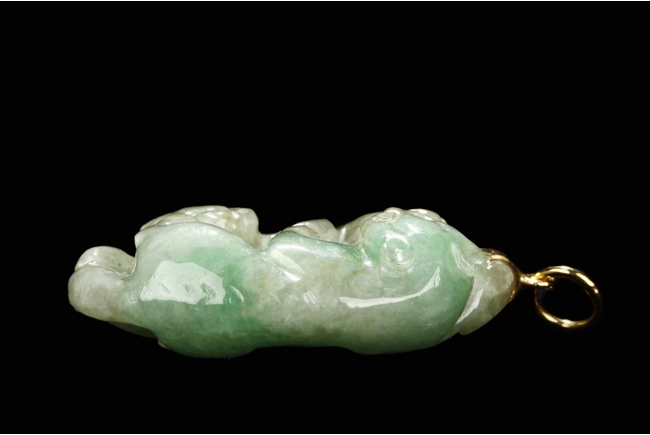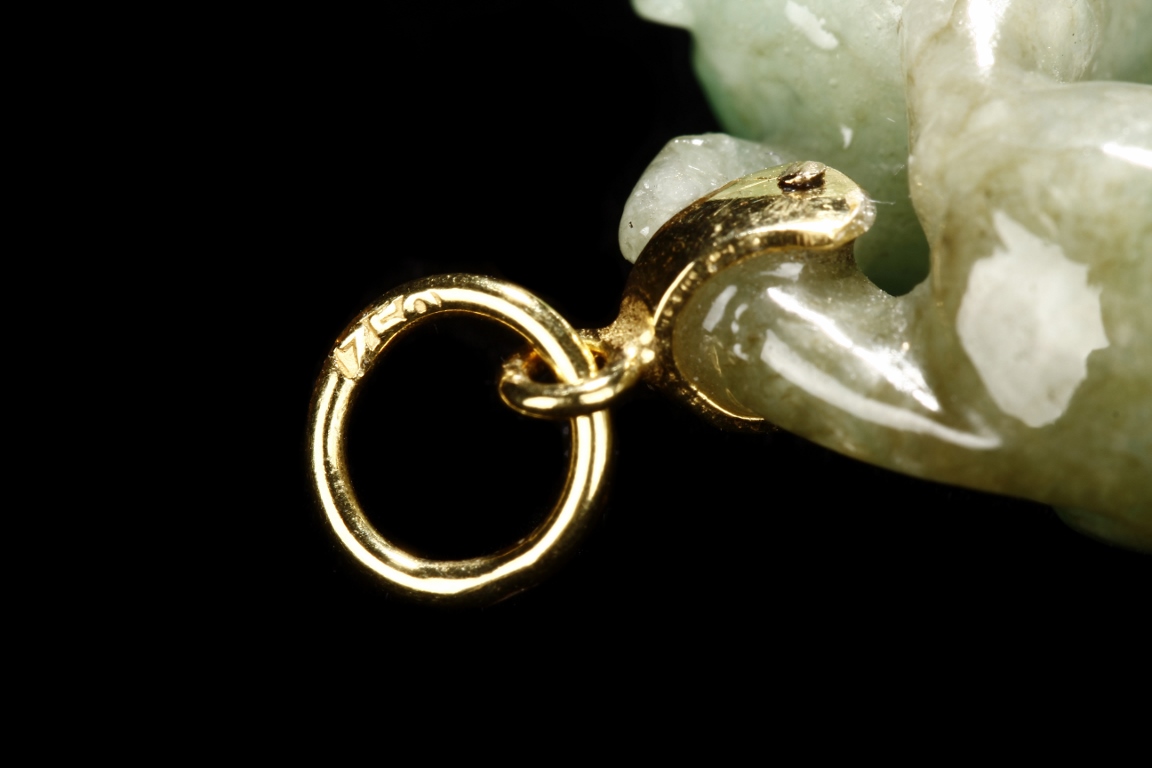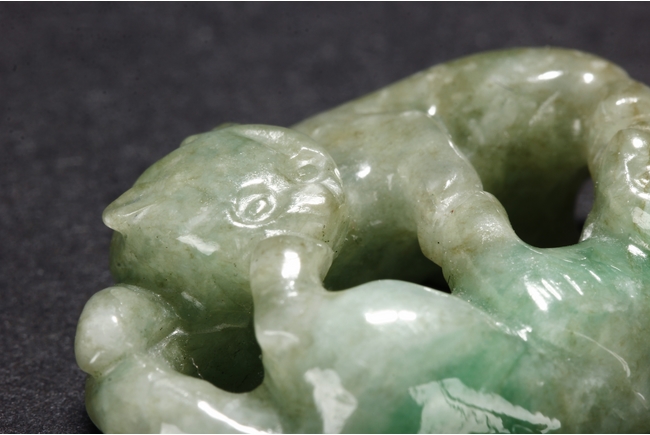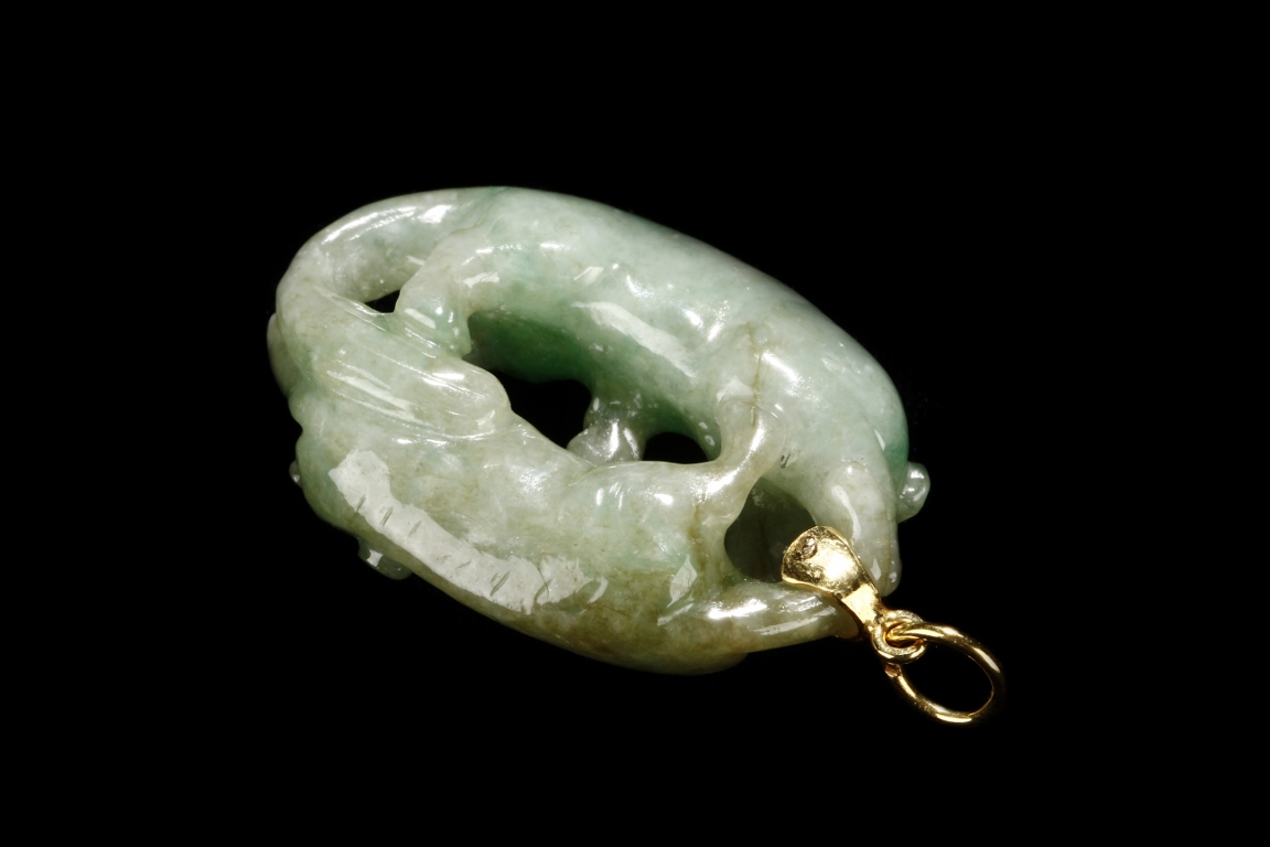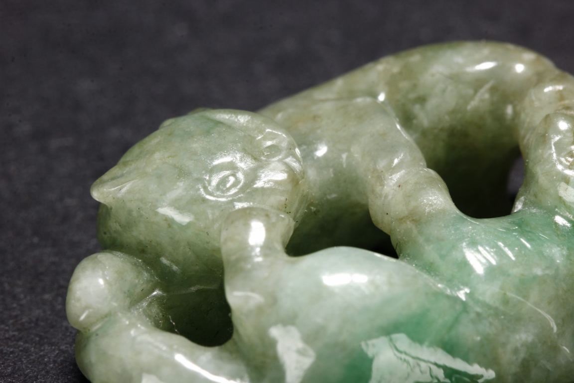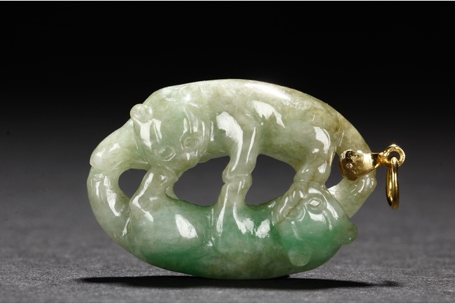 The jadeite pendant is carved with two buddhist lions playing with each other. The stone is of mottled greenish-white tone with russet inclusions.Qing Dynasty period.