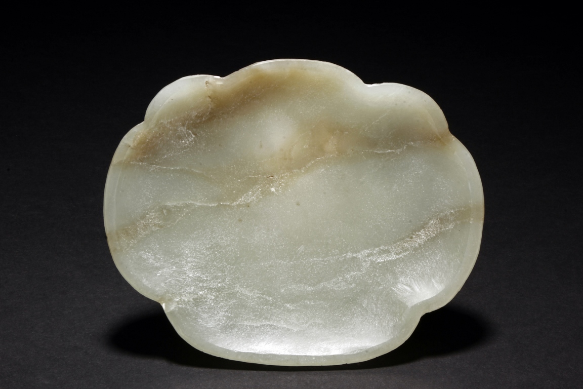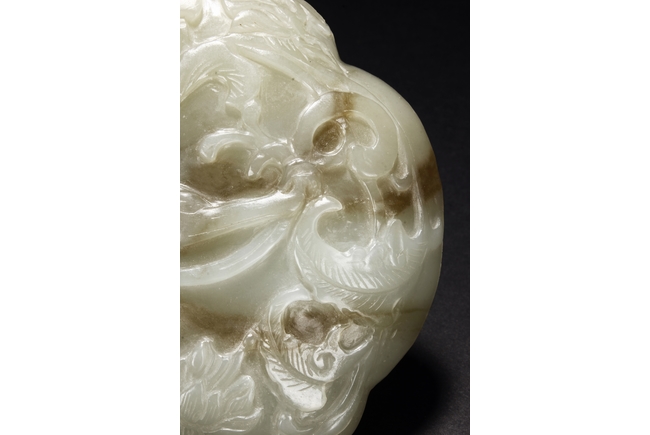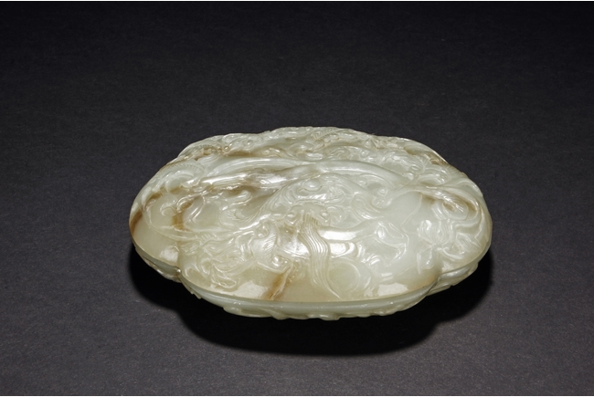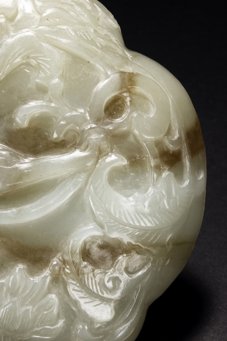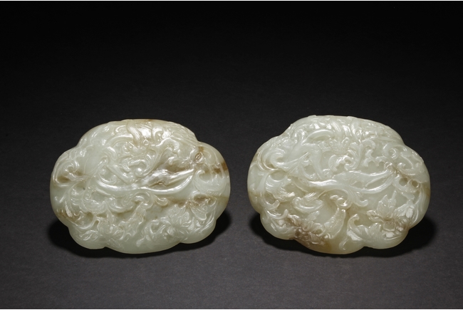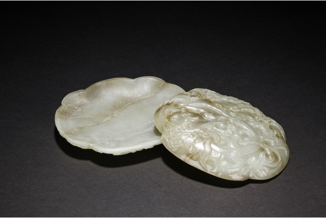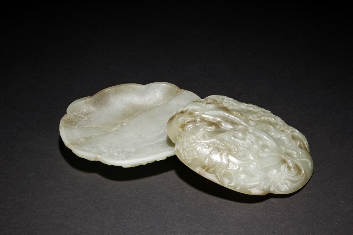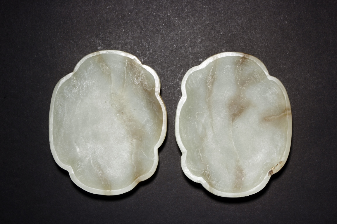Each ink paste box is carved in low relief to the exterior with foliate patterns, the stone is of celadon tone with russet inclusions. Qing Dynasty period.
