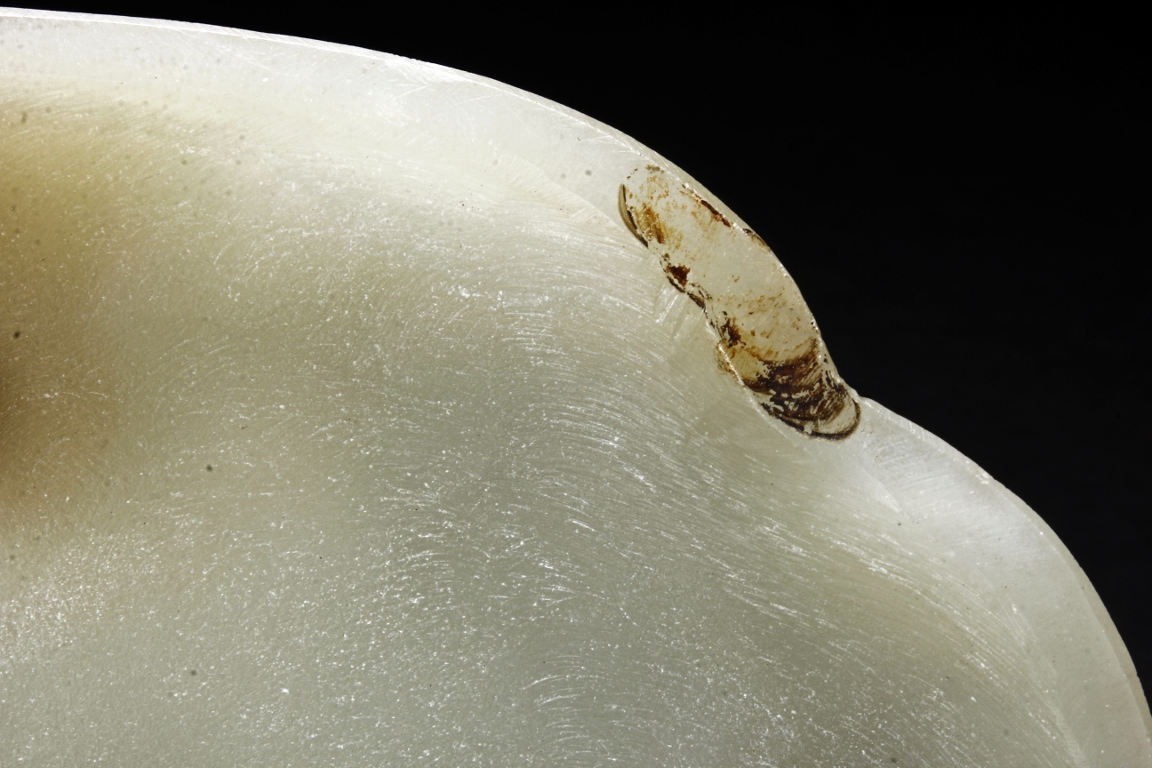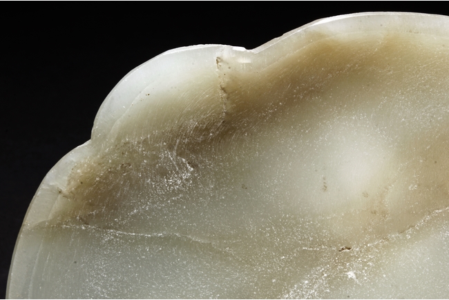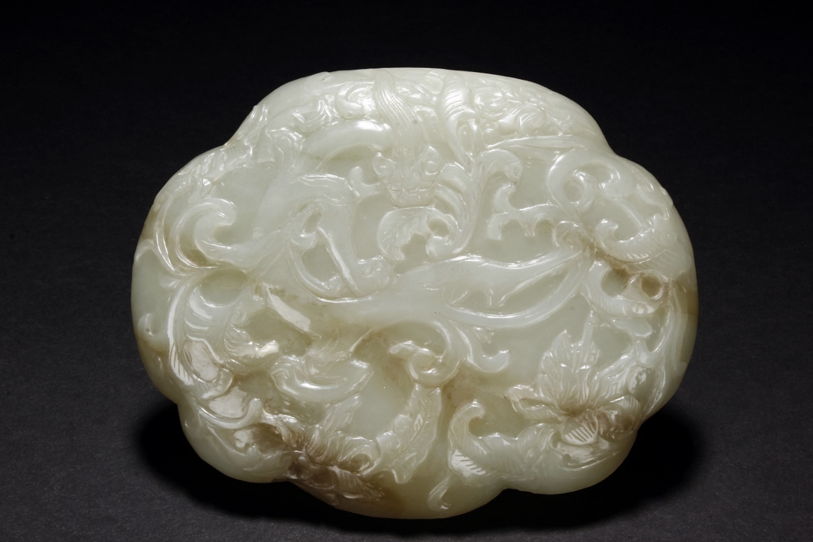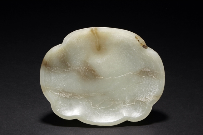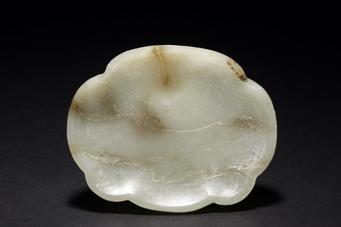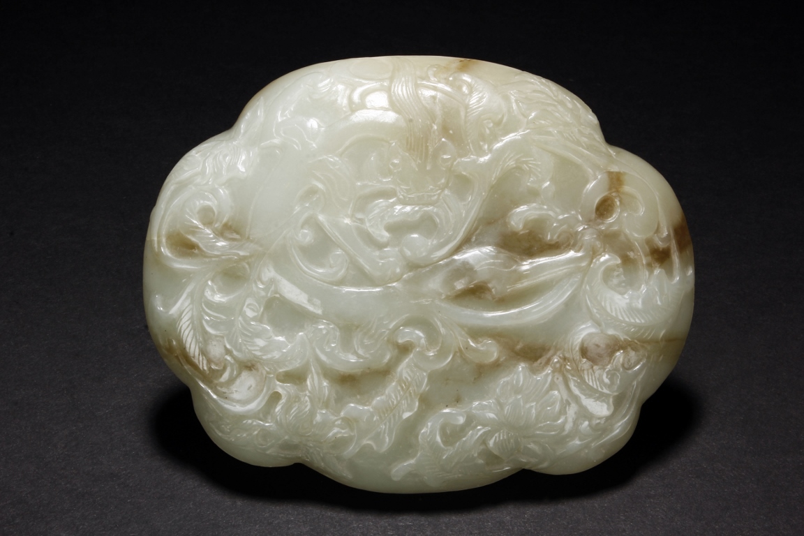 Each ink paste box is carved in low relief to the exterior with foliate patterns, the stone is of celadon tone with russet inclusions. Qing Dynasty period.