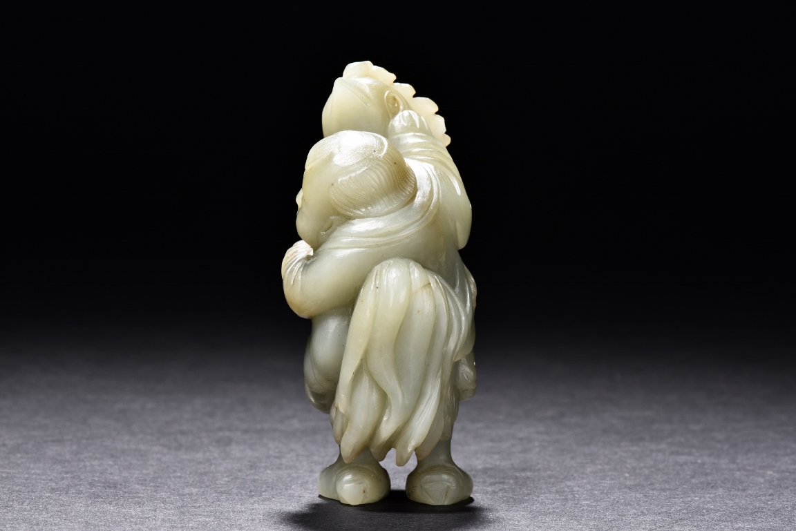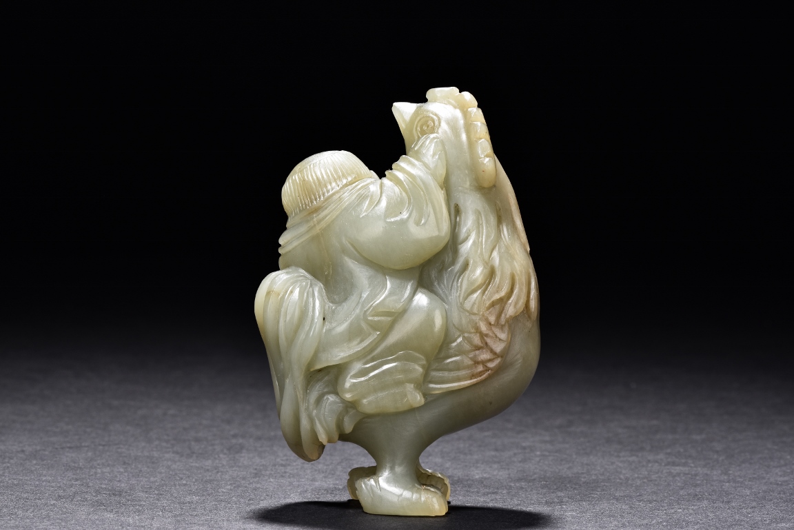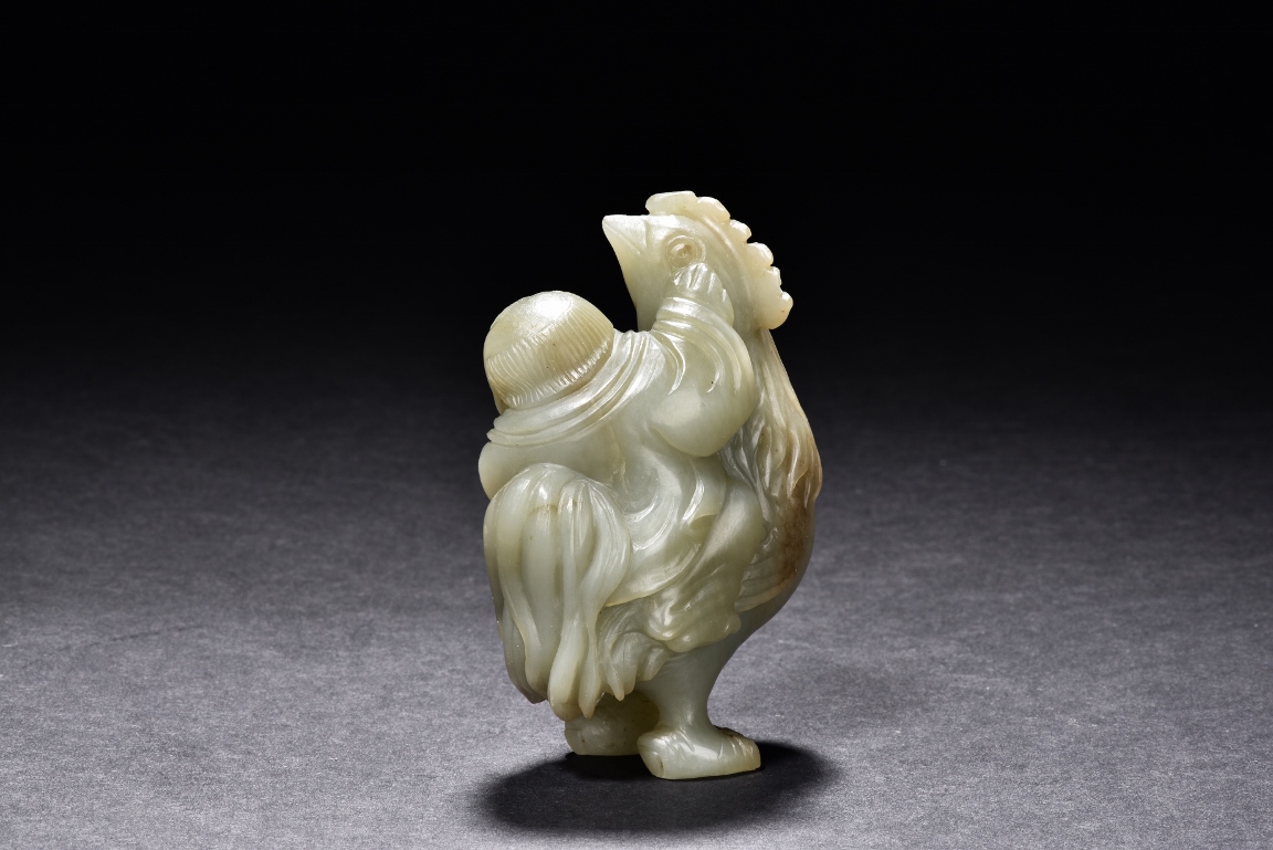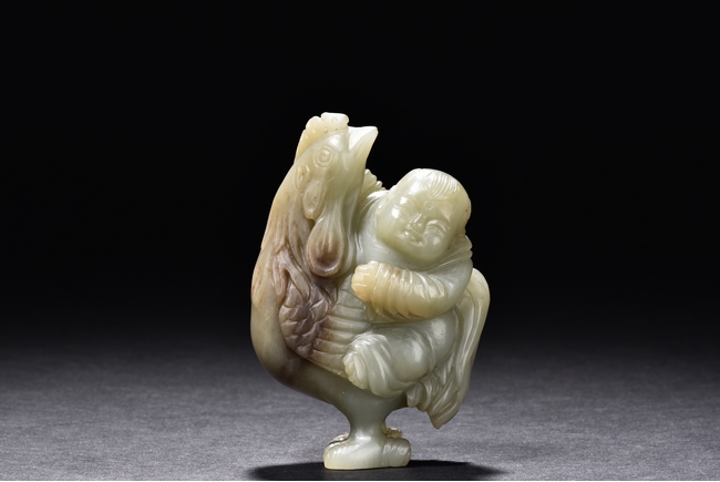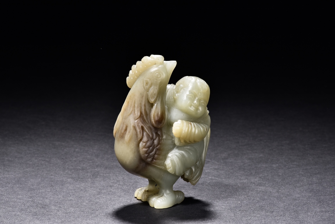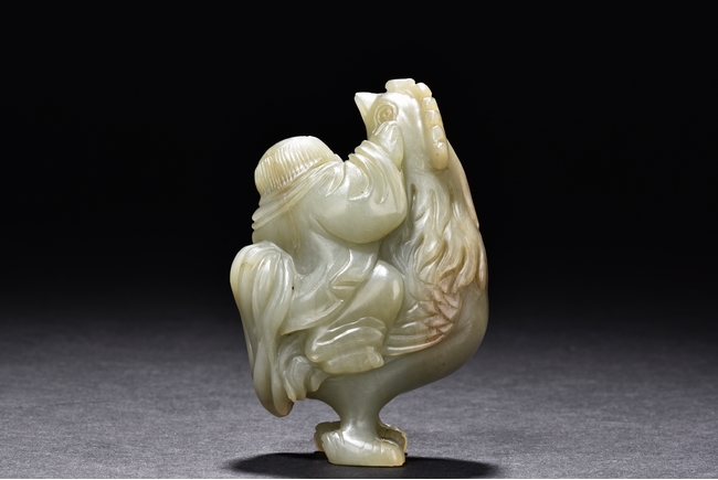Modelled as a small child sitting upon a rooster, the child shown with a joyful expression, the hair detailed with incised lines, the rooster feathers incised with details, its head turning to the side. The stone is of celadon tone.Qing Dynasty period.