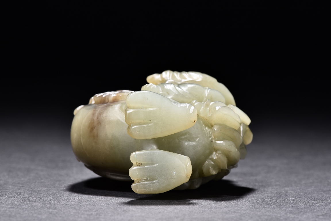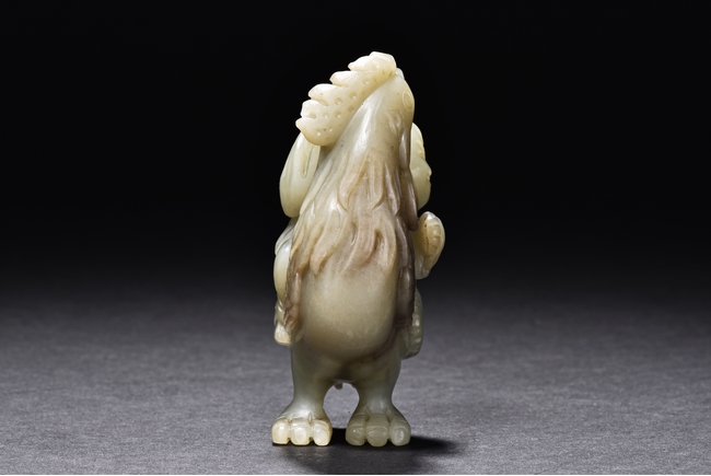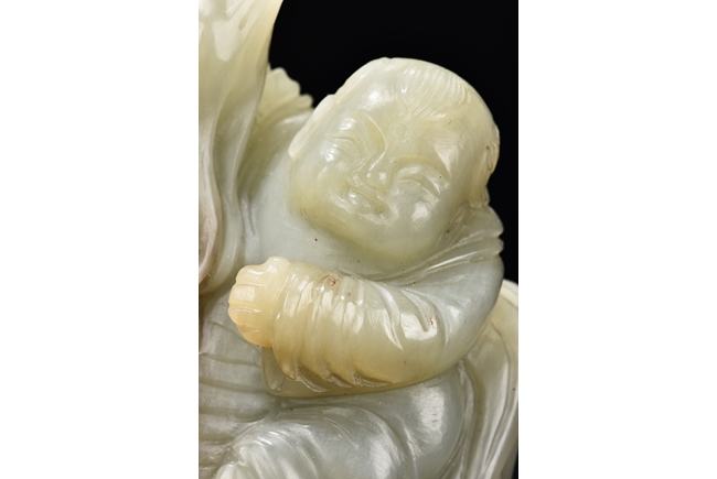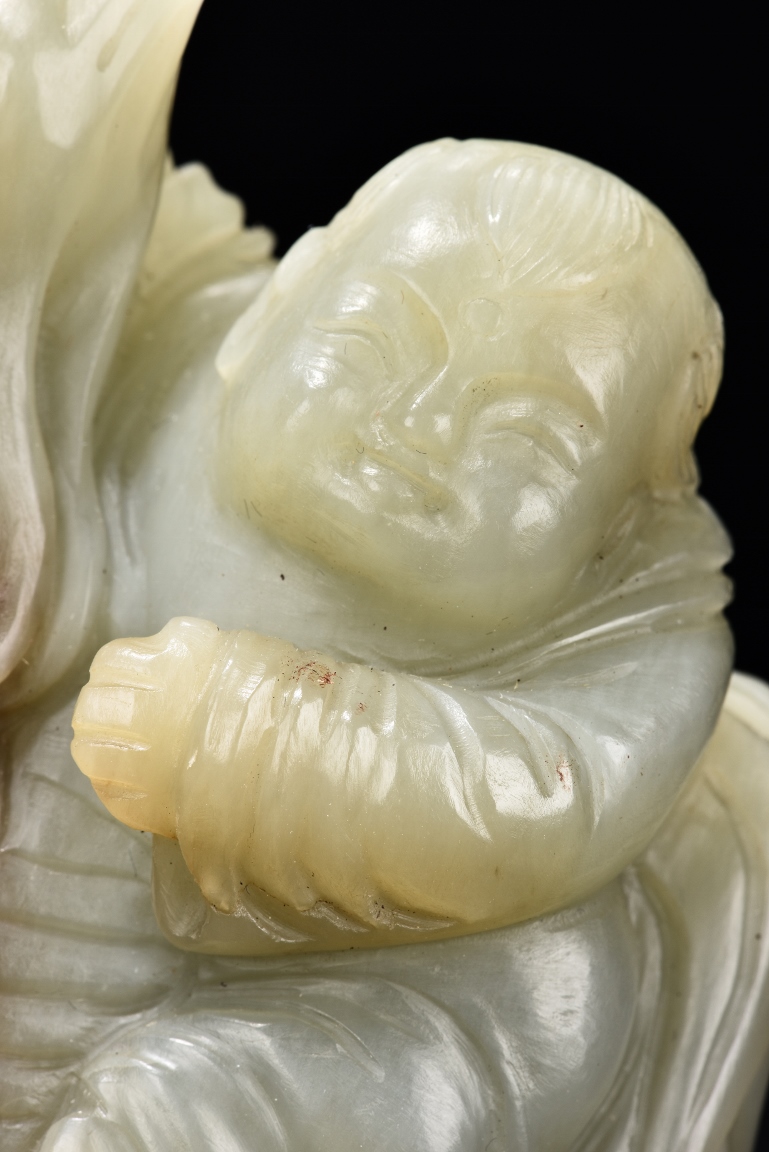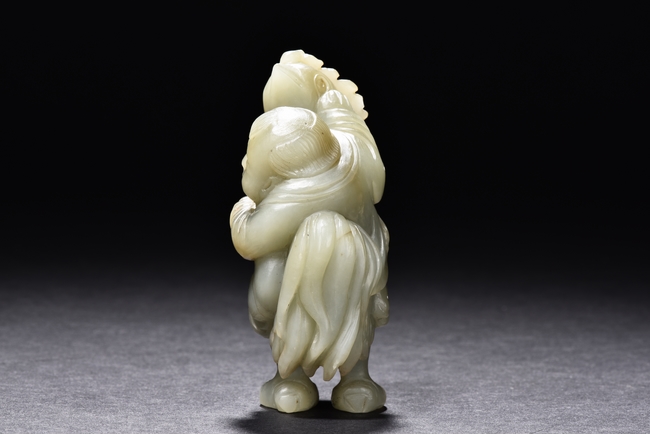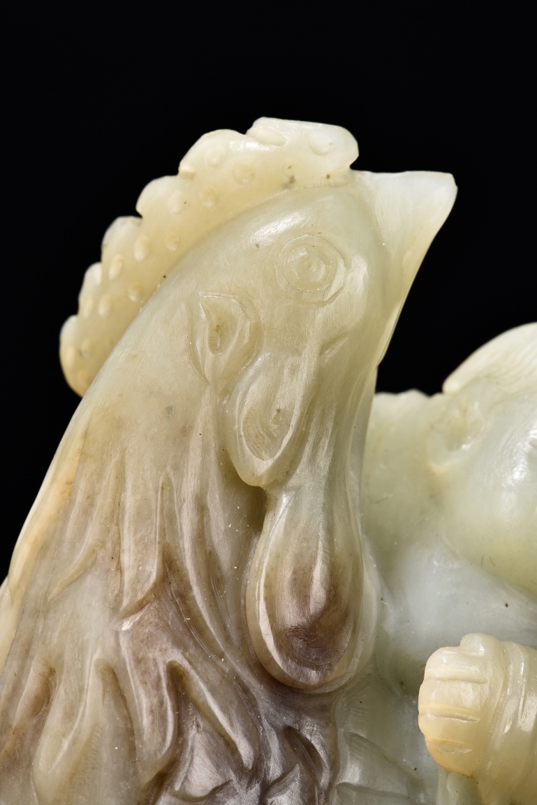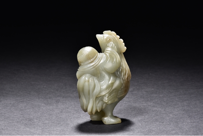 Modelled as a small child sitting upon a rooster, the child shown with a joyful expression, the hair detailed with incised lines, the rooster feathers incised with details, its head turning to the side. The stone is of celadon tone.Qing Dynasty period.