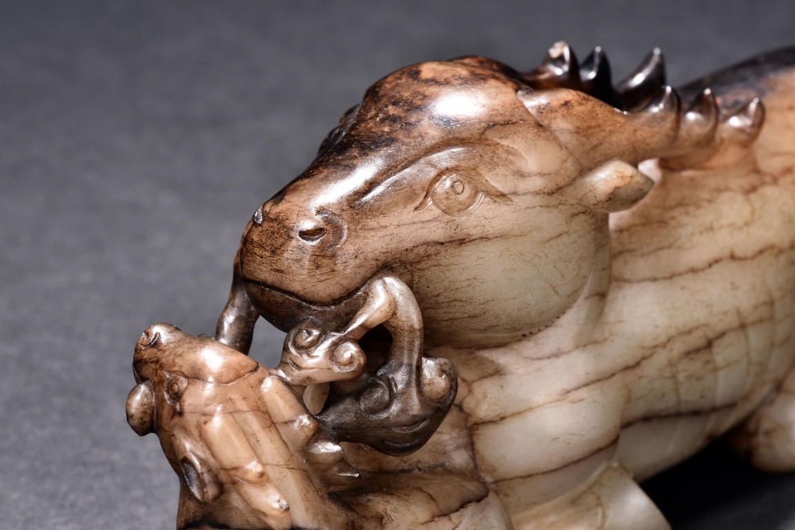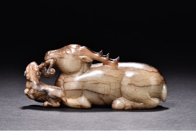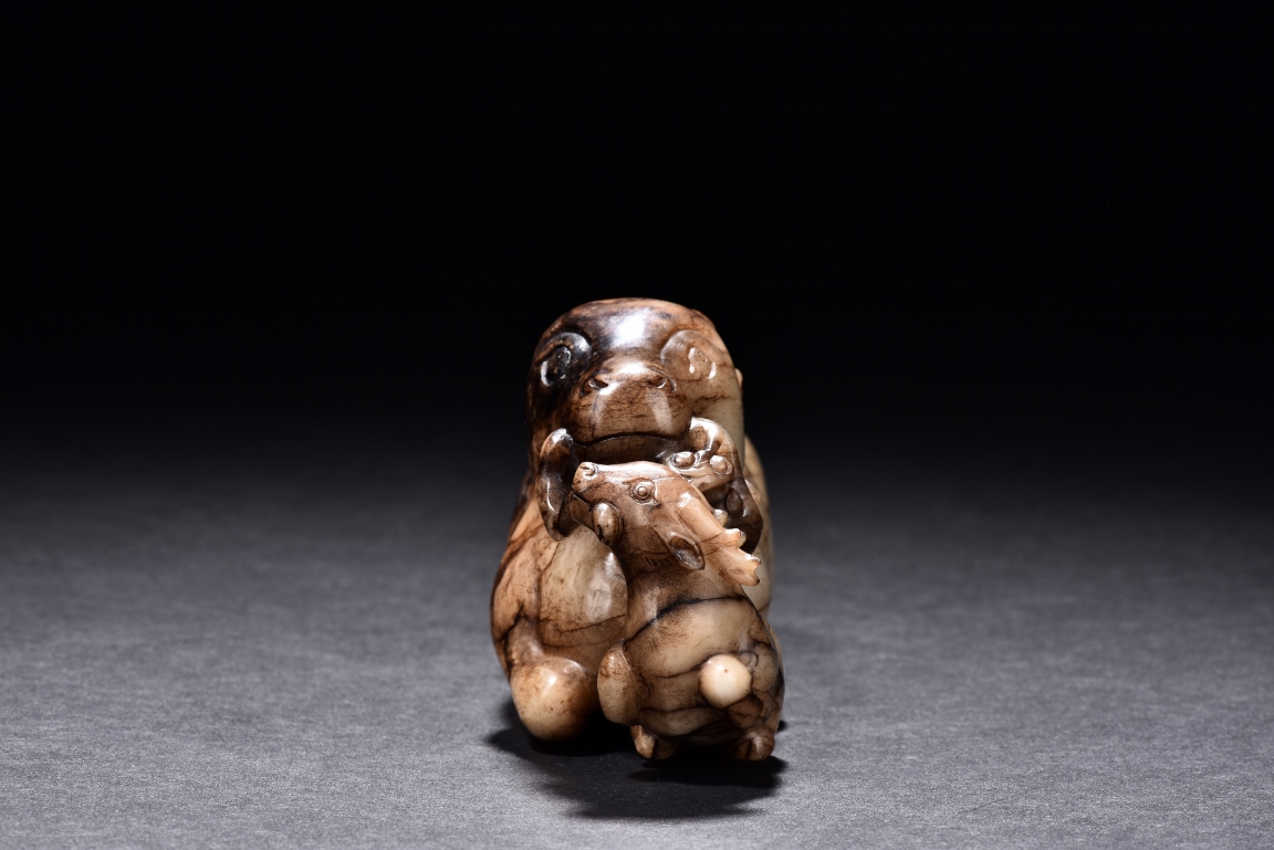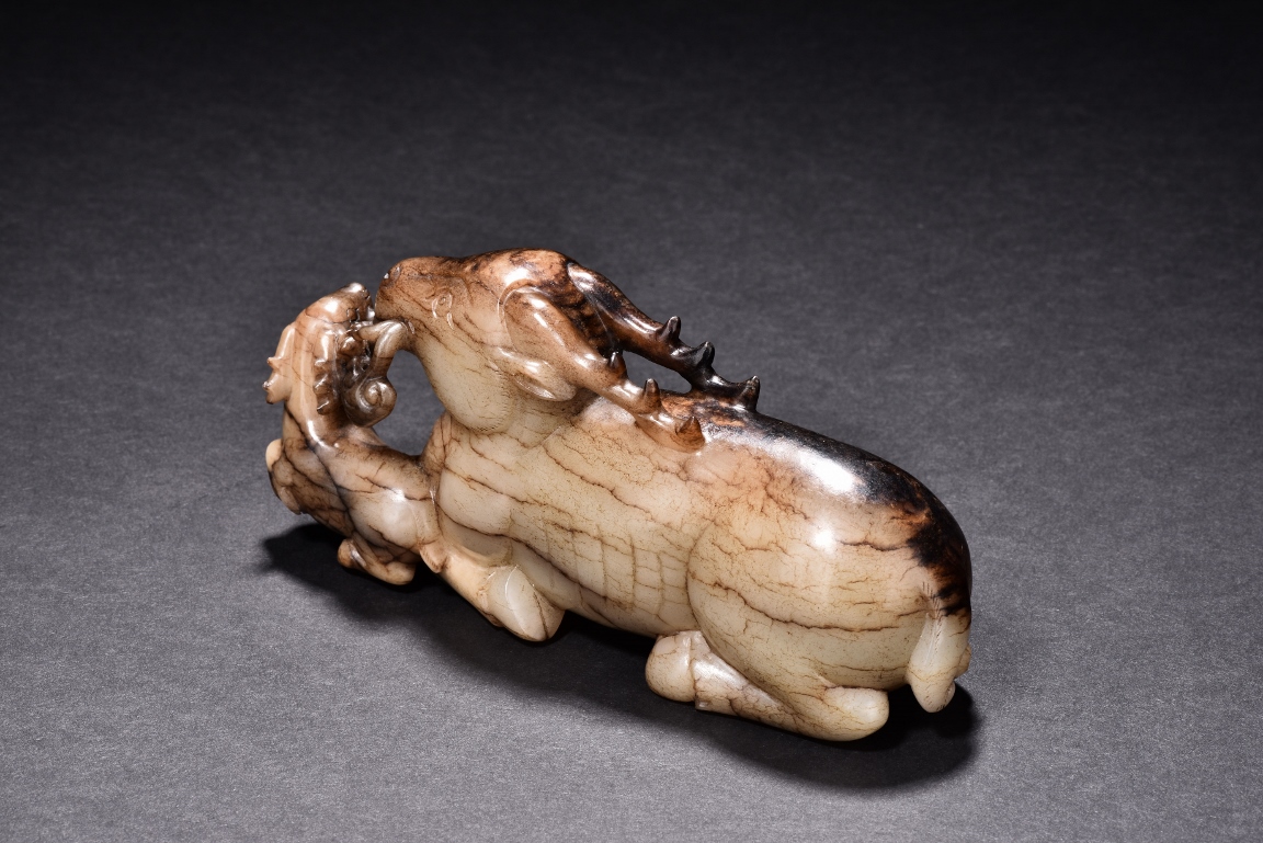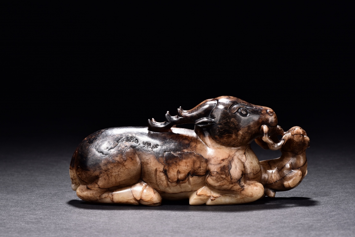Shown seated with legs tusked under body, the deer is finely carved with two horns, its mouth grasping a child deer, facing to the side. One side is of caramel russet tone, to the other side is of extensive mottled brown tone. Accompanied with a GIA certificate. Yuan/Ming Dynasty period.