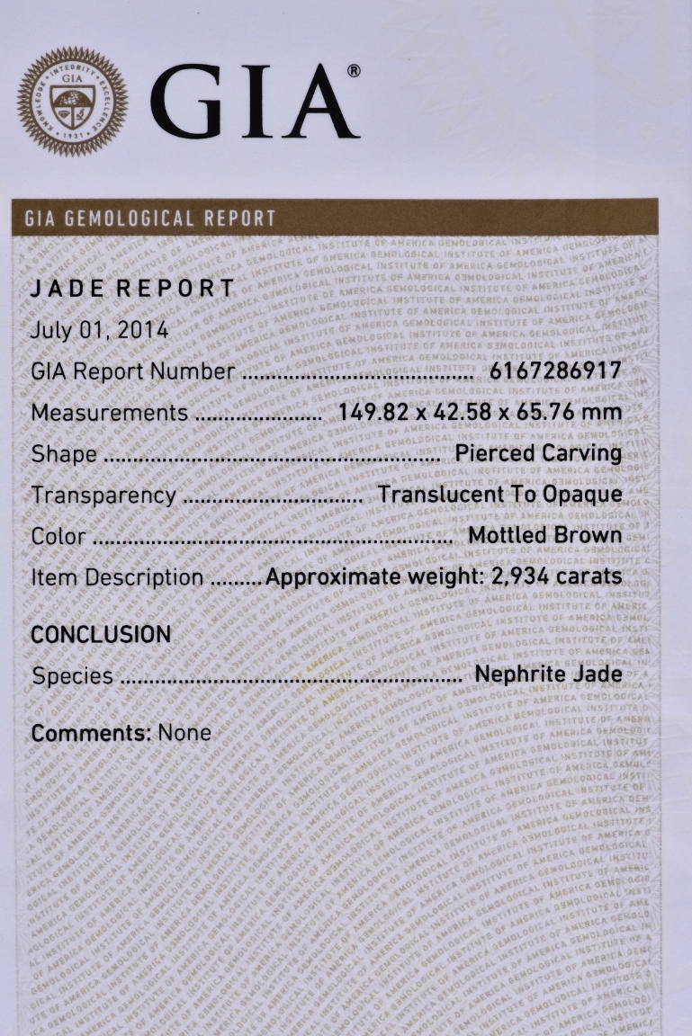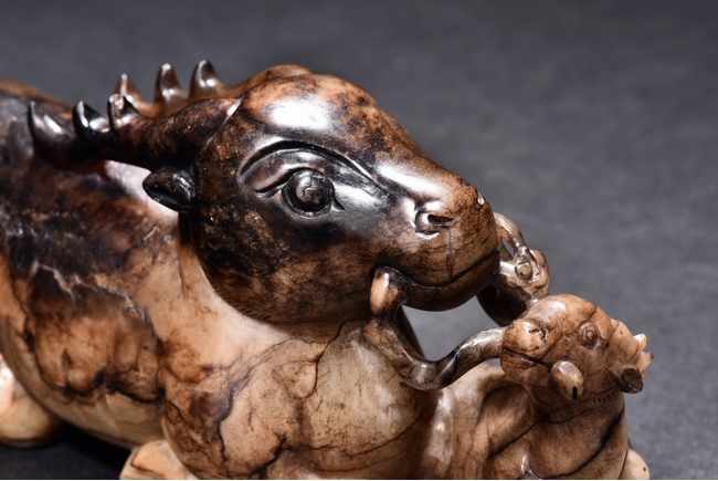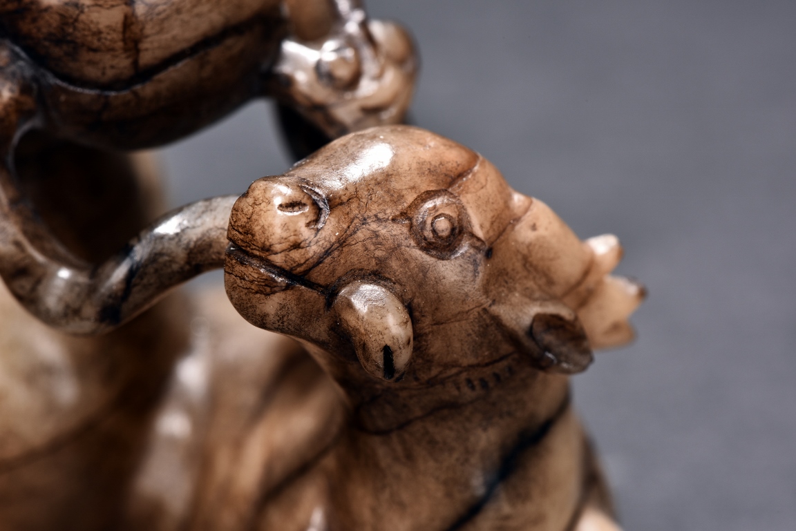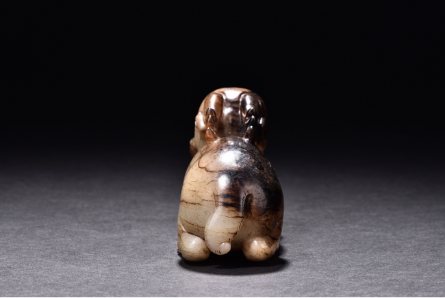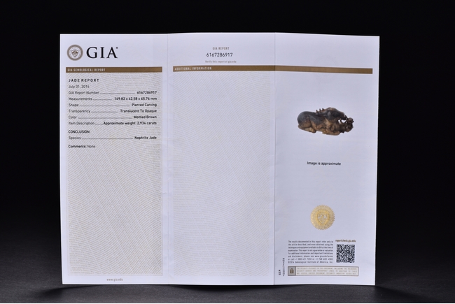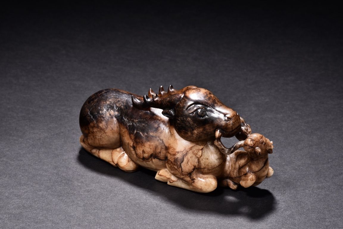 Shown seated with legs tusked under body, the deer is finely carved with two horns, its mouth grasping a child deer, facing to the side. One side is of caramel russet tone, to the other side is of extensive mottled brown tone. Accompanied with a GIA certificate. Yuan/Ming Dynasty period.