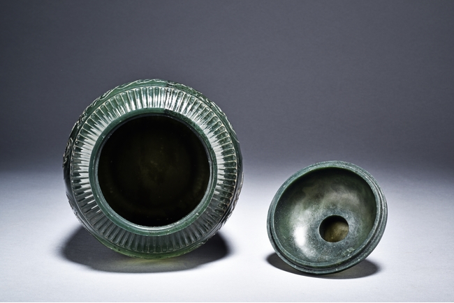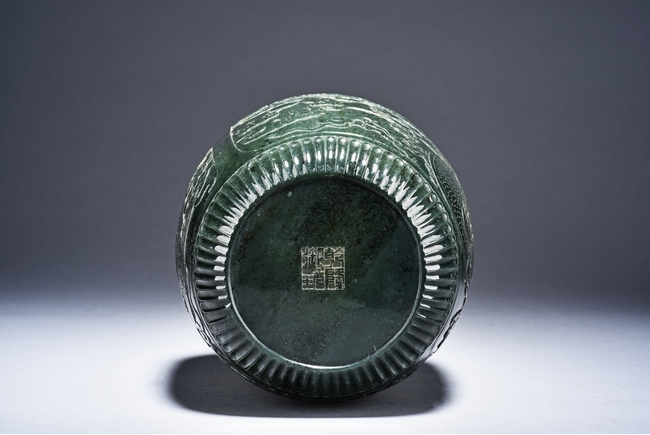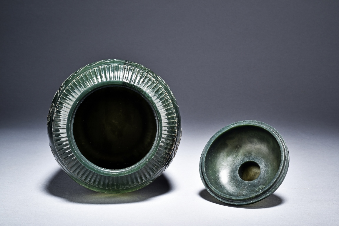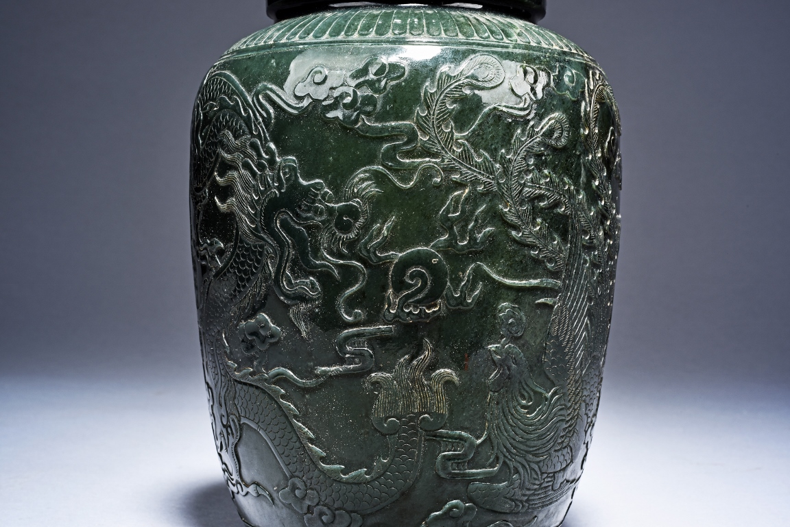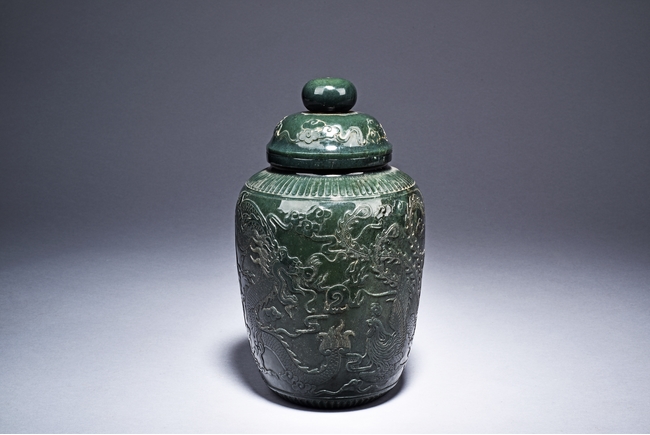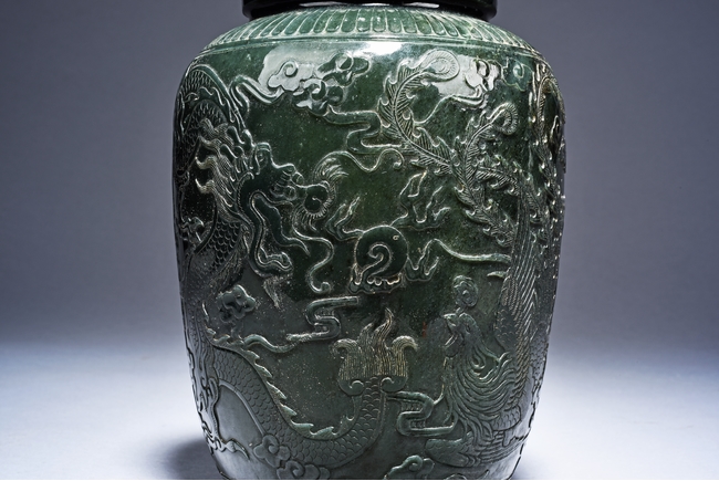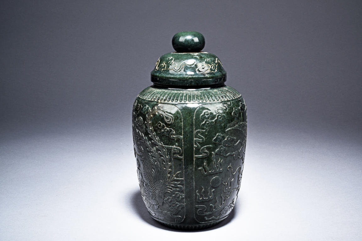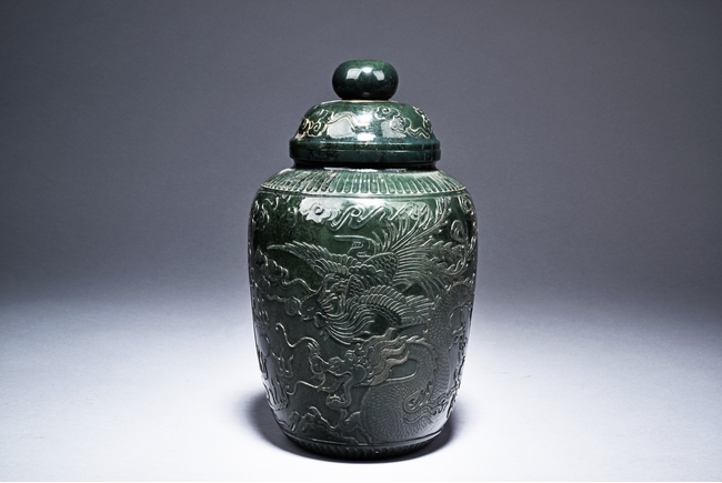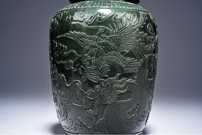 The jar is carved to the exterior with scene of phoenix and dragon. The cover is topped with a knob and decorated with auspicious cloud motif. The bottom bears a four character apocryphal 'Qianlong' mark.