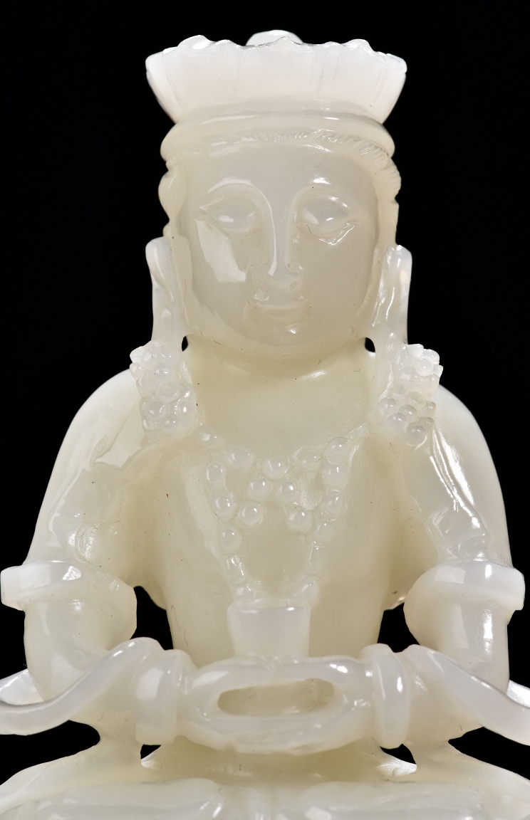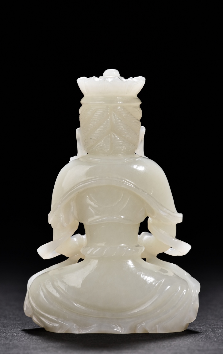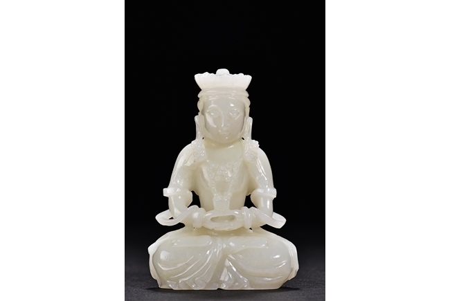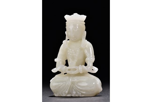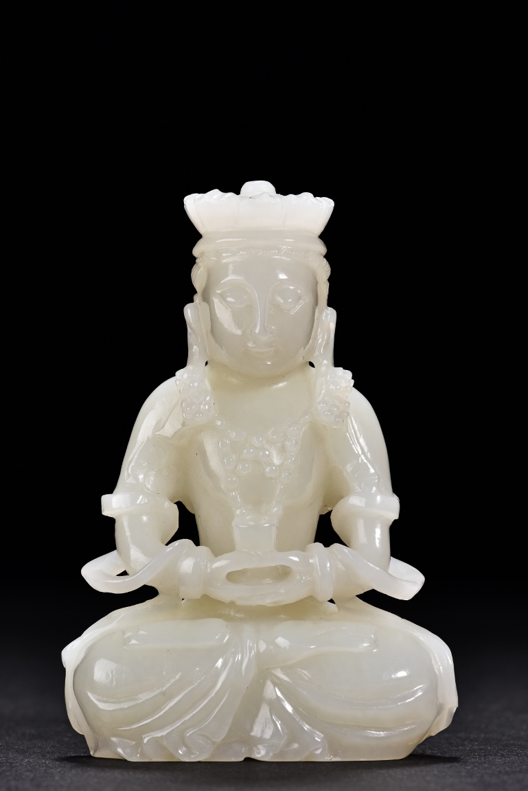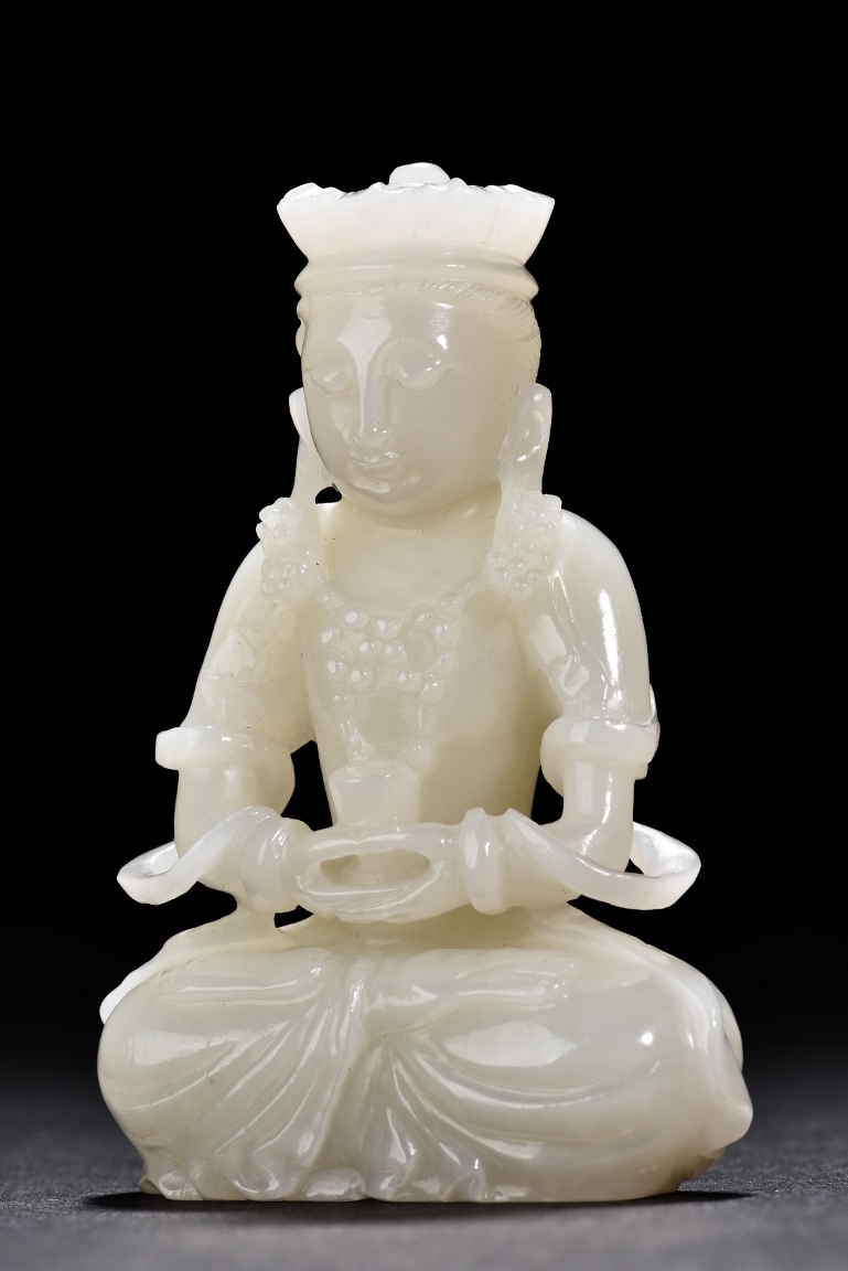 The seated bodhisattva holding a bowl with two hands and wearing beaded jewelry, with celestial scarf trailing around the arms, the face with downcast eyes and serene expression, with a crown tied around the head. Qing Dynasty period.