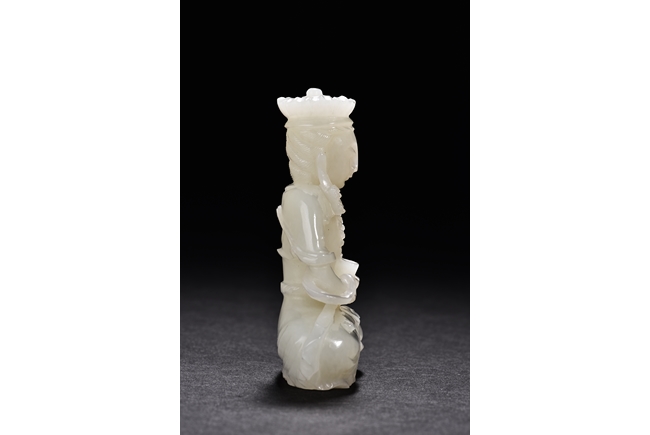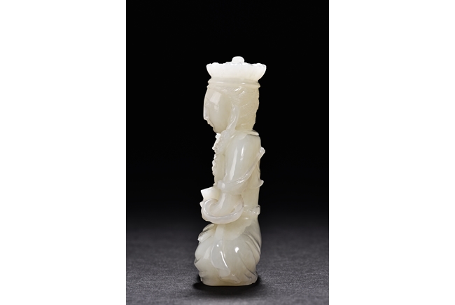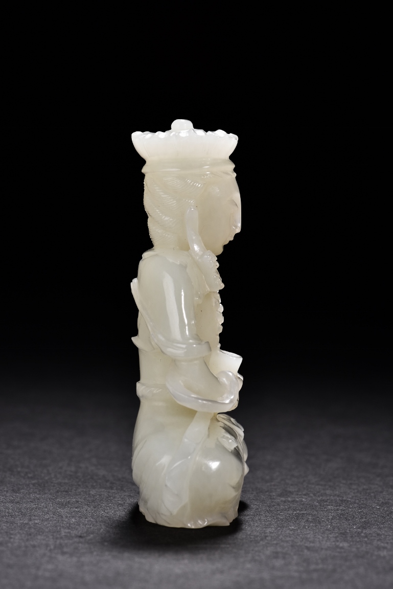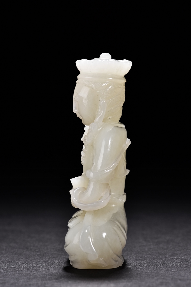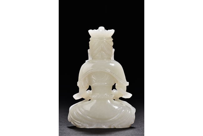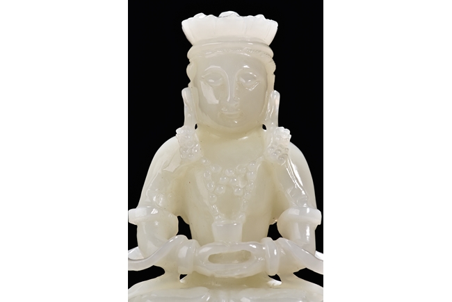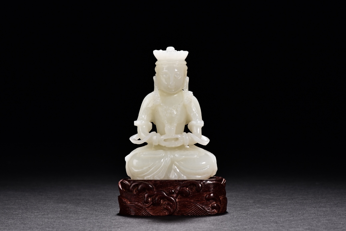 The seated bodhisattva holding a bowl with two hands and wearing beaded jewelry, with celestial scarf trailing around the arms, the face with downcast eyes and serene expression, with a crown tied around the head. Qing Dynasty period.
