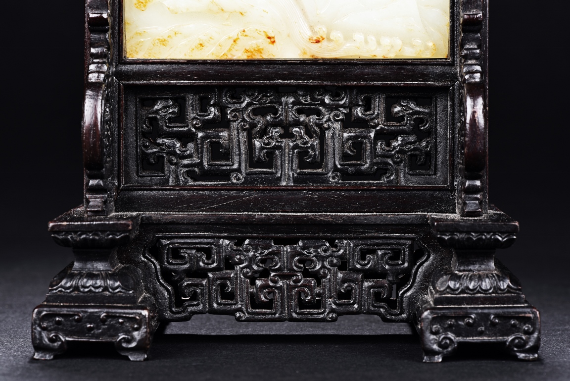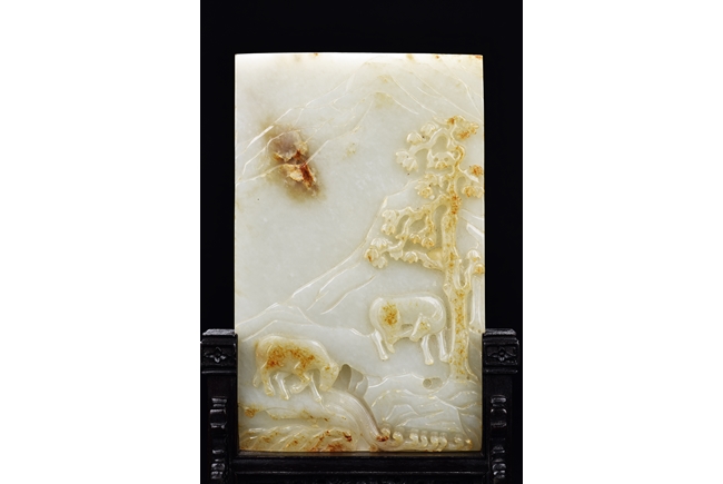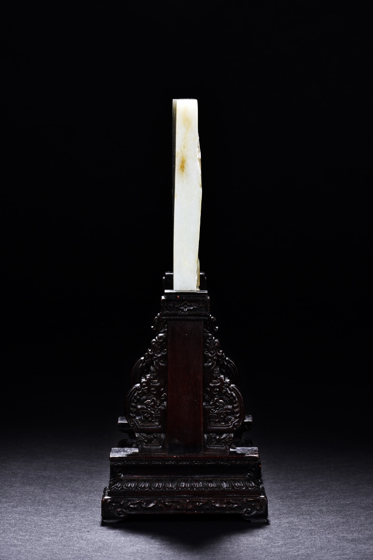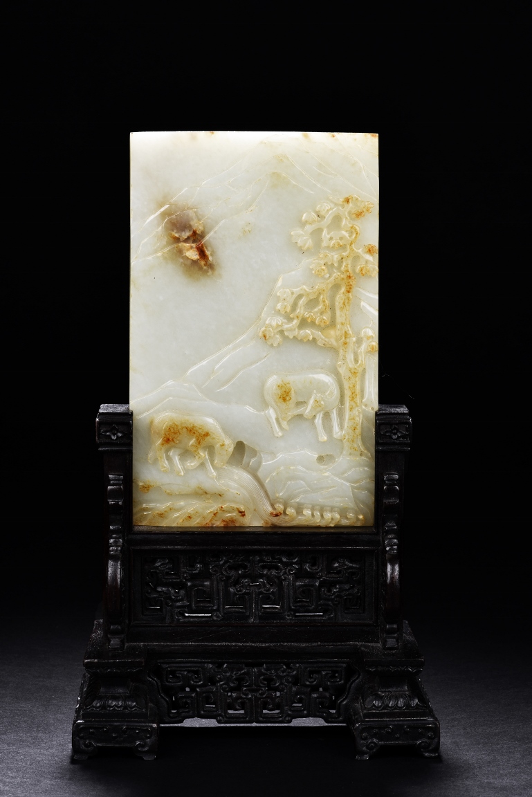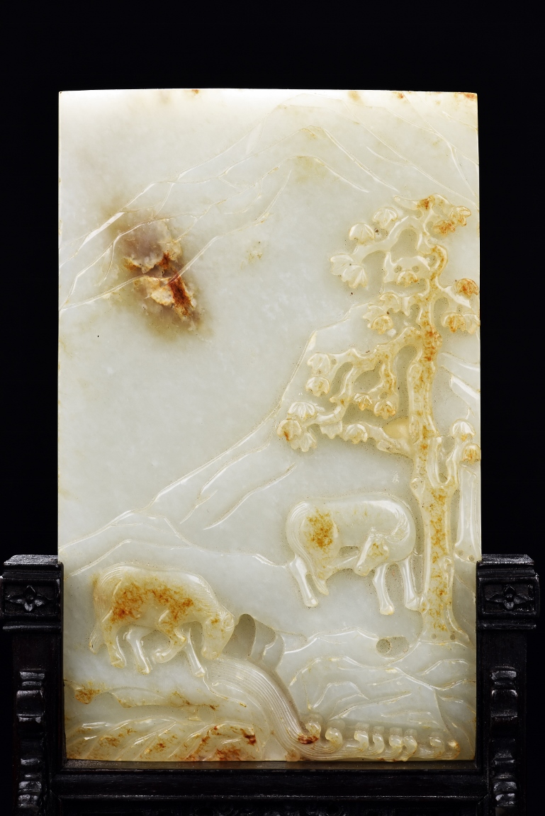 Of rectangular form, the jade plaque was made from Hetian white jade; it is carved with two horses resting under tree within a mountain landscape. The stone is of white and slightly celadonish tone with russet skin and inclusions. The plaque is placed on a hardwood openwork wood stand.