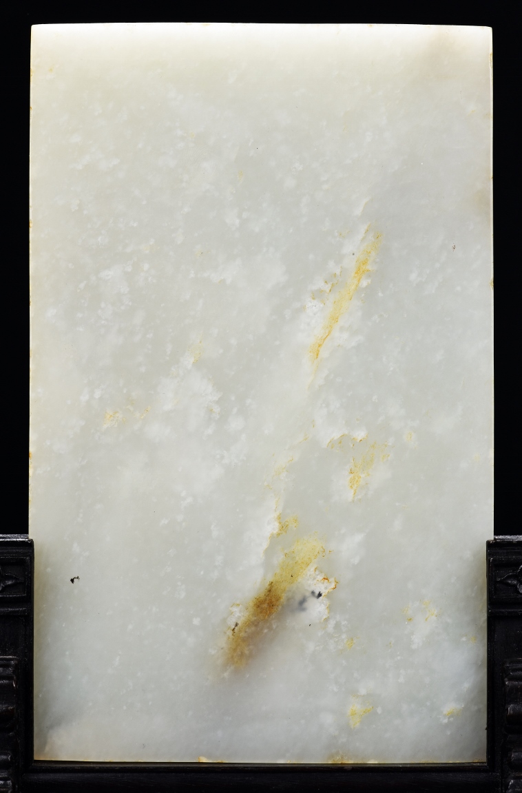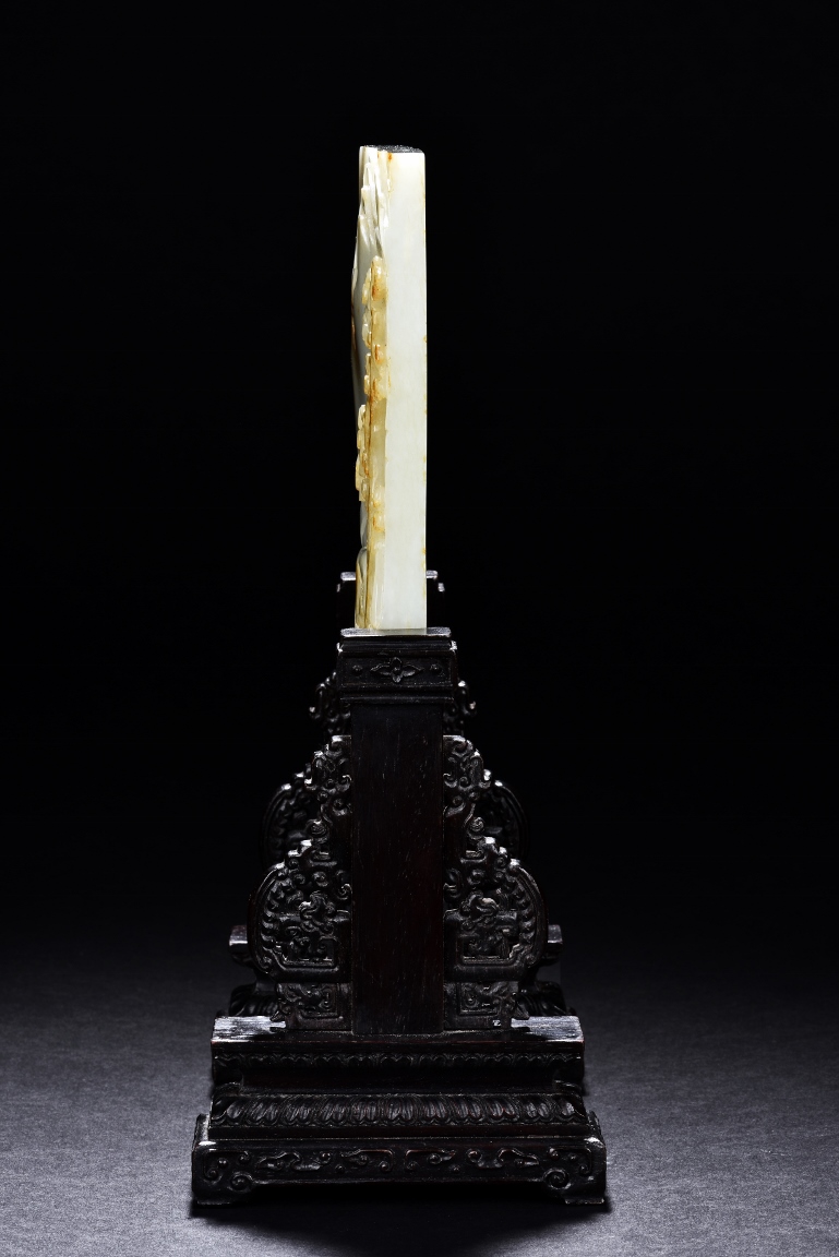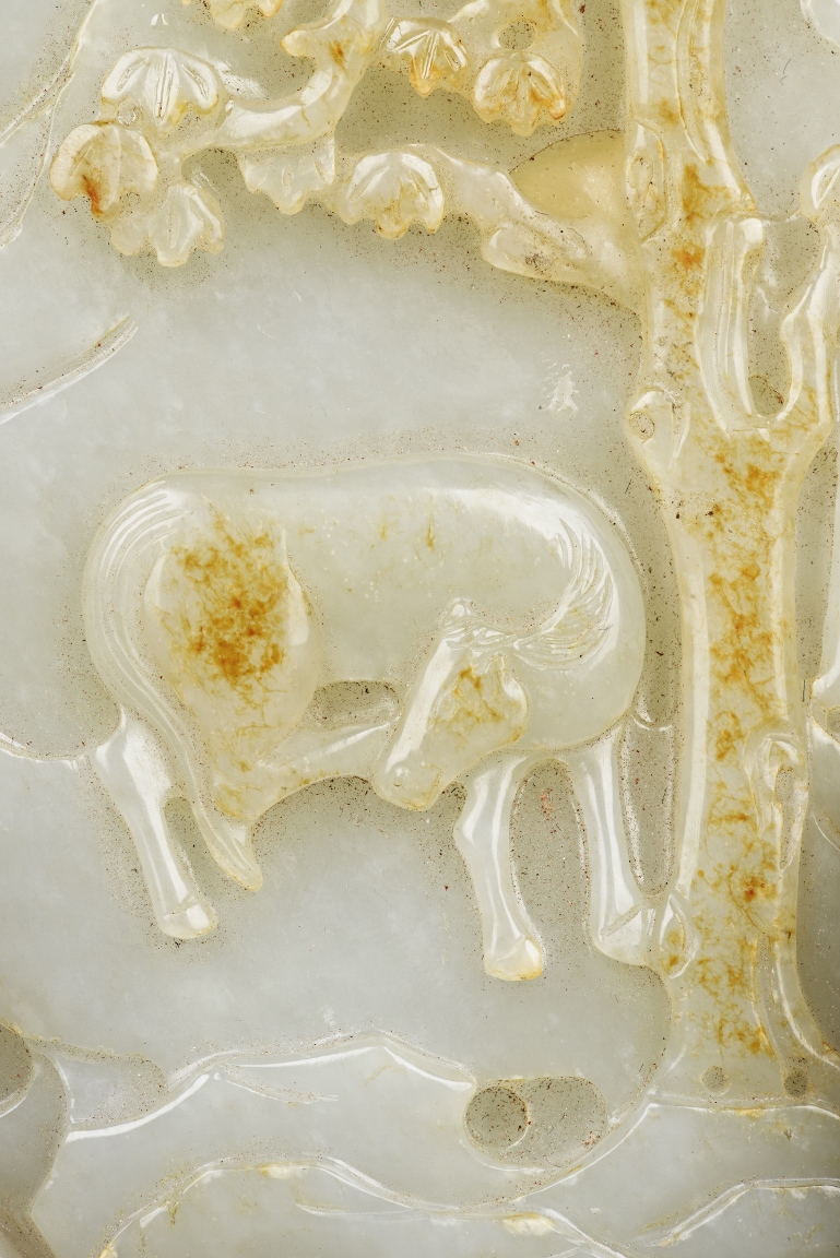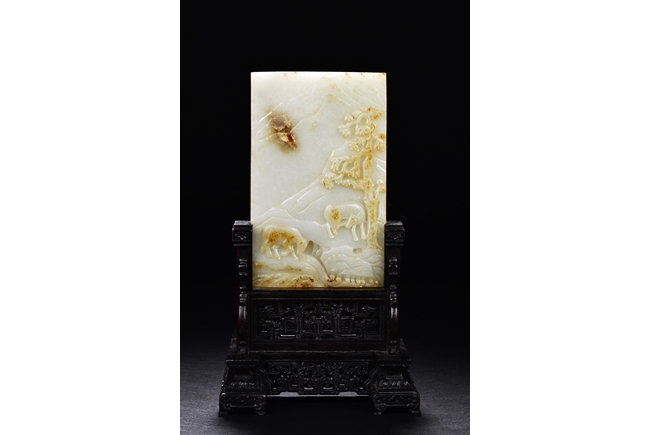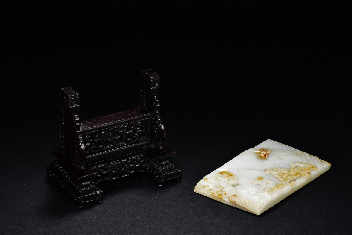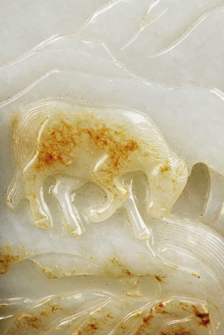 Of rectangular form, the jade plaque was made from Hetian white jade; it is carved with two horses resting under tree within a mountain landscape. The stone is of white and slightly celadonish tone with russet skin and inclusions. The plaque is placed on a hardwood openwork wood stand.