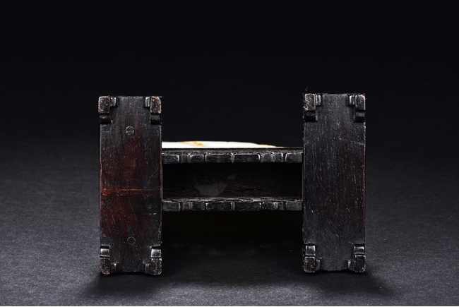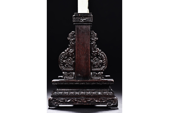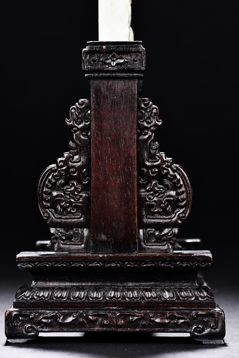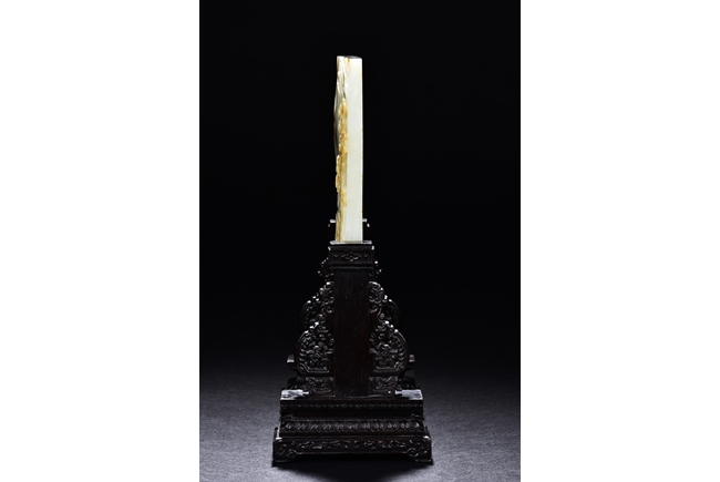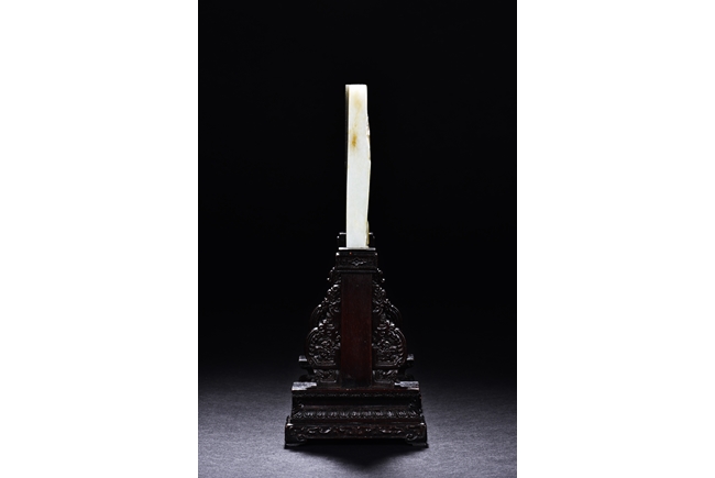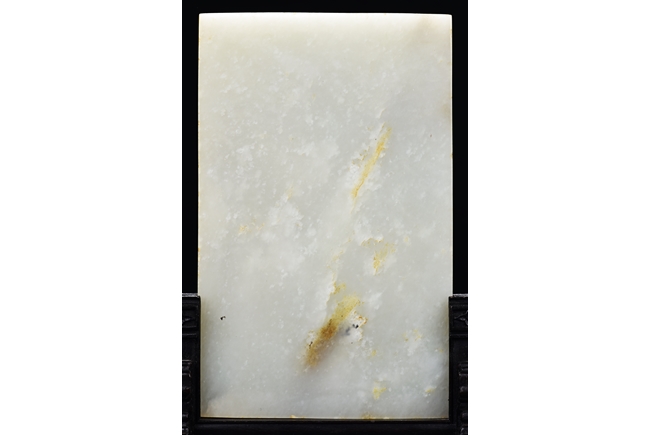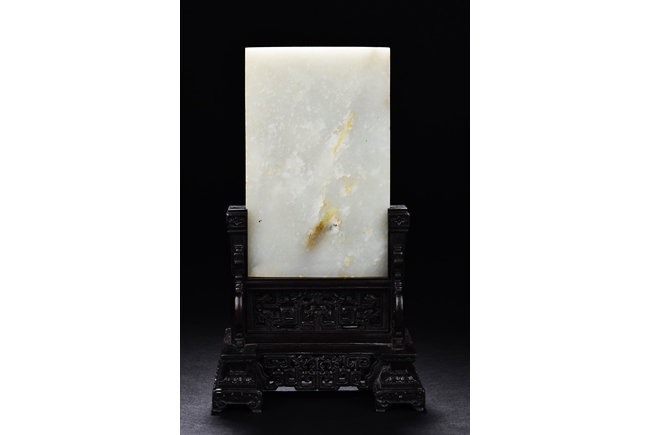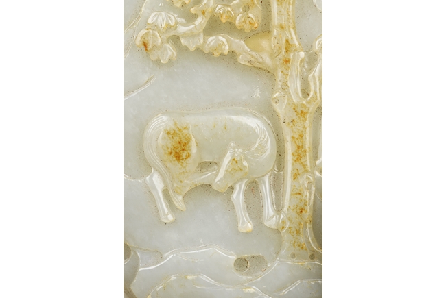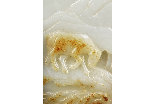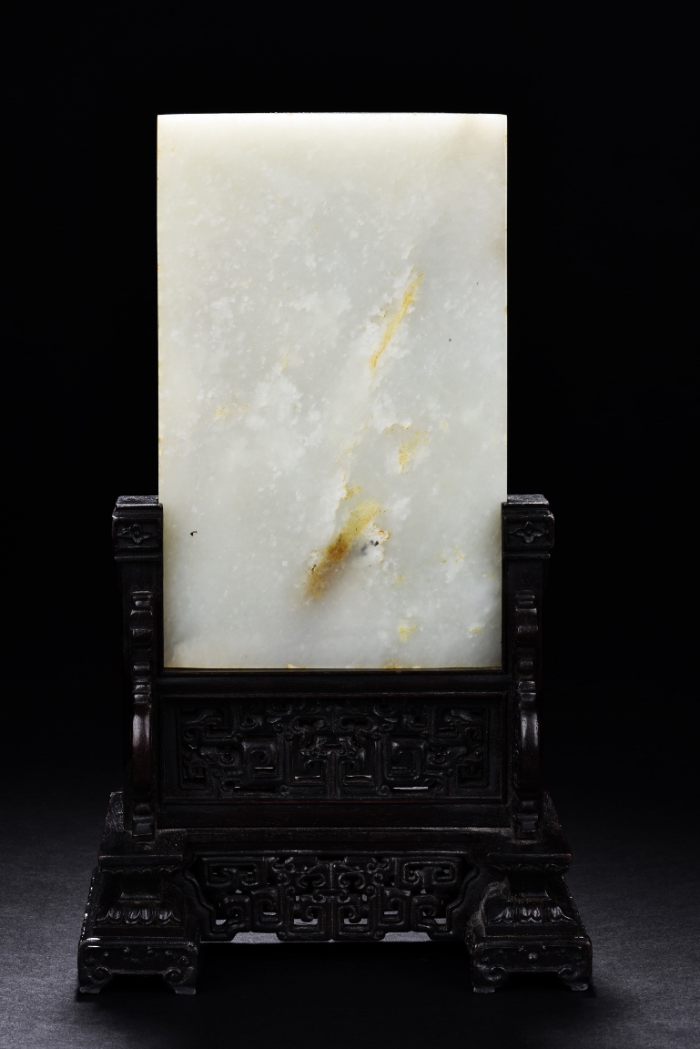 Of rectangular form, the jade plaque was made from Hetian white jade; it is carved with two horses resting under tree within a mountain landscape. The stone is of white and slightly celadonish tone with russet skin and inclusions. The plaque is placed on a hardwood openwork wood stand.