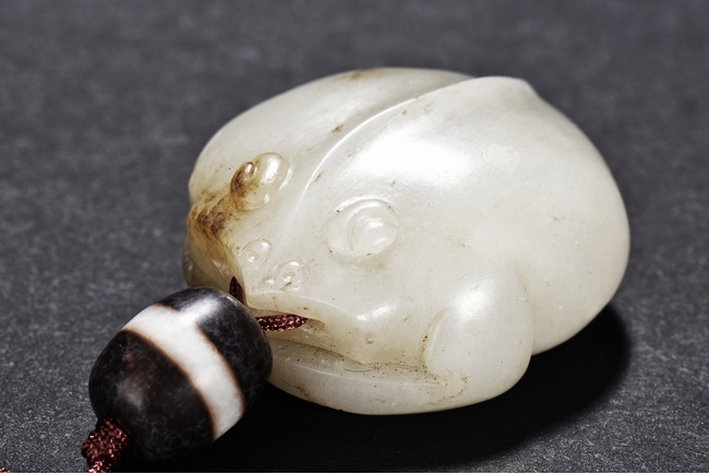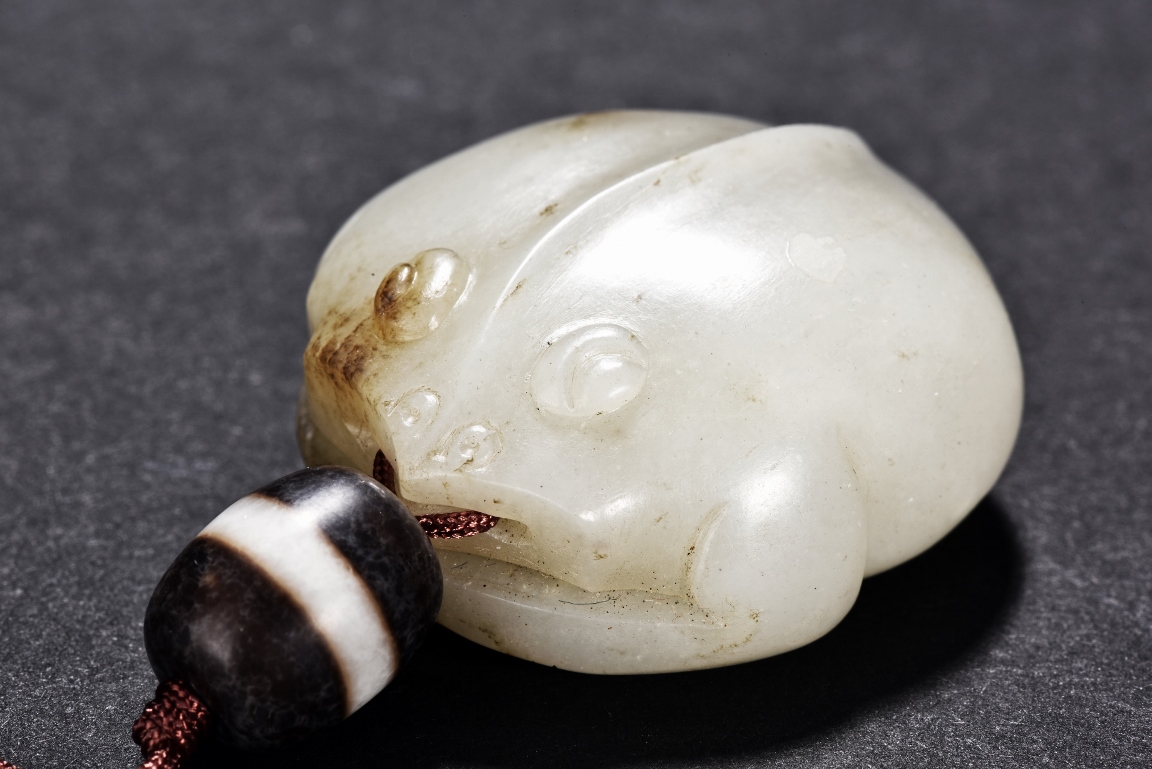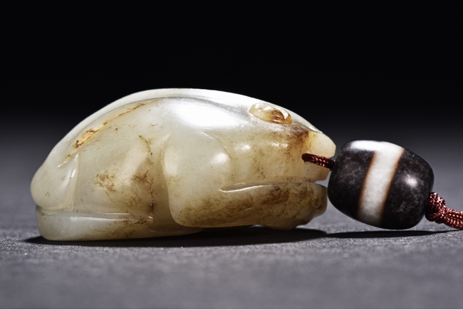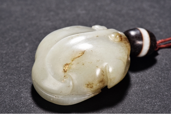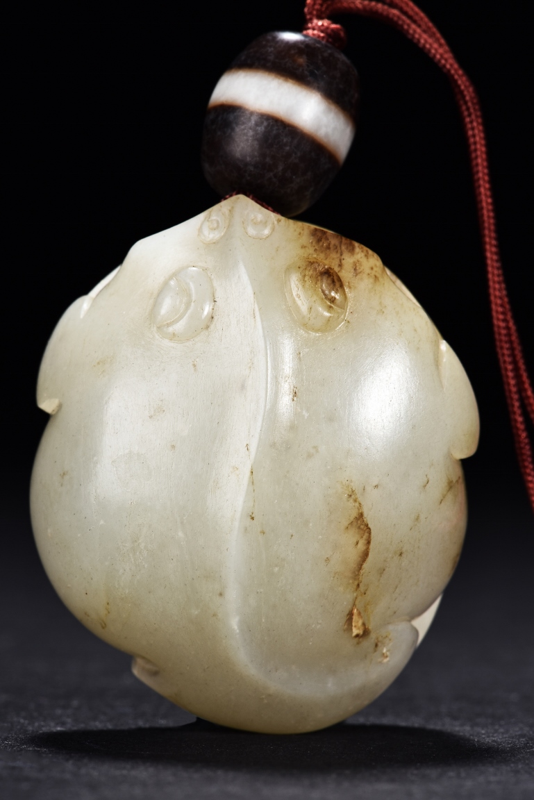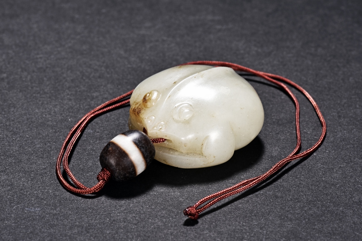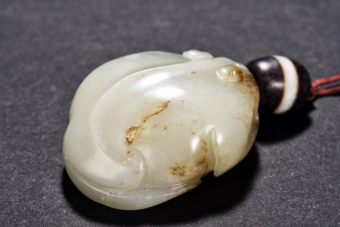The pendant is carved as a toad, carved with two round protruding eyes, with an agate bead. The stone is of white tone with russet inclusion. Qing Dynasty period.
