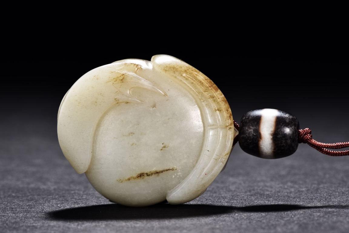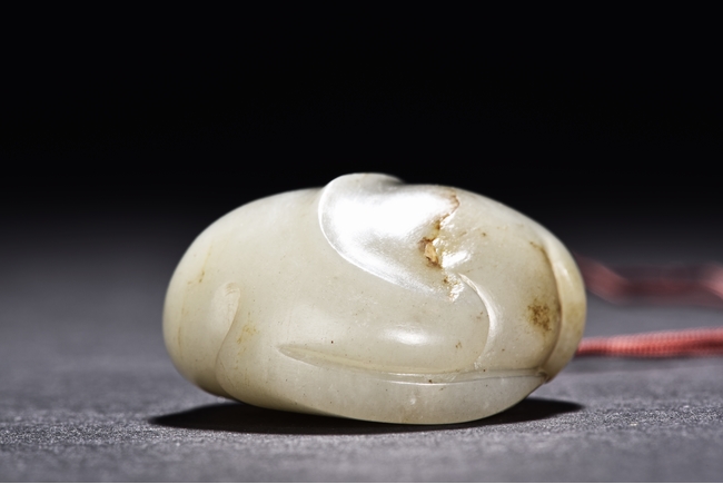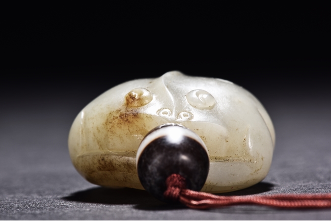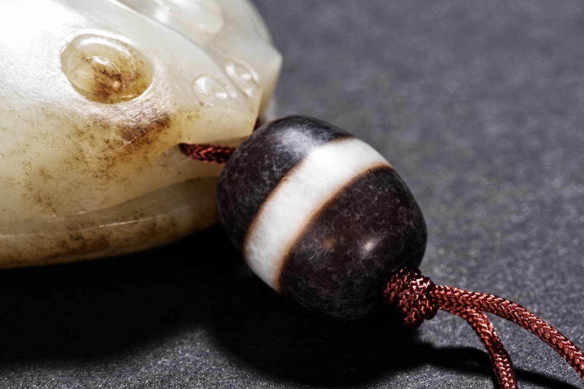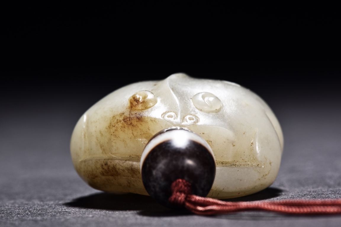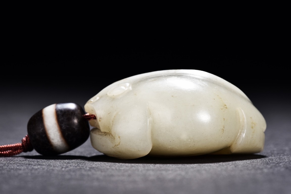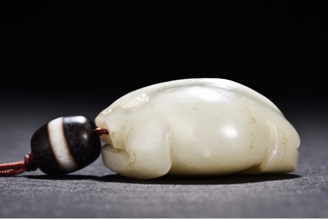 The pendant is carved as a toad, carved with two round protruding eyes, with an agate bead. The stone is of white tone with russet inclusion. Qing Dynasty period.